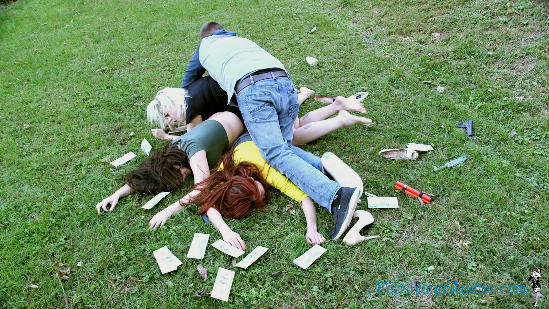 Hannah Perez, Tilly McReese and Nadia White are sitting on the couch with their money in hand. They are ready to get their plan started for the Capital. Hannah and Tilly start to kiss and Nadia waits her turn. Then Tilly and Nadia begin to kiss. Hannah says that they should enjoy their paradise together until their is a knock at the door. They know they have to hide the explosives. Meanwhile, Nadia gets the door. Pete brings in cookies and drops them, while they scatter to hide a few things. Pete tries to collect all the cookies and he swings the pan accidentally hitting Hannah and then Tilly. Pete then hits Nadia, he is confused on what has happened, he decides to go and tells them to enjoy the treats. The girls land into a body pile and they work on getting up. Hannah hurries and has the girls collect everything before Pete comes back and sees. Nadia is talking to Pete upstairs and Hannah decides to place some banana peels for him to slip on when he comes down the steps. Nadia flirts with Pete and tells him she thinks everyone is waiting downstairs and she says she will meet him there. Nadia blows Pete a kiss and he is lovestruck. Pete, Hannah and Nadia land in a body pile. He claims he wasn’t ready for that and wants to know who put bananas there. Hannah tells Nadia this isn’t working but she has a plan for him.