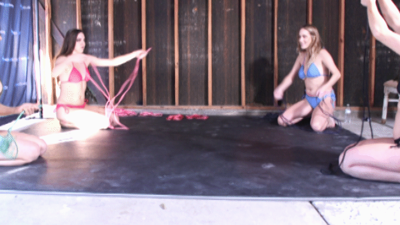 Hannah Perez, Sadie Holmes, Sumiko Dreams & Cadence Lux are all sitting around the mat with their rope in their bikinis. Sadie and Hannah are on a team against Cadence and Sumiko. The objective is to dominate the other and get them tied up. What team is going to win here?