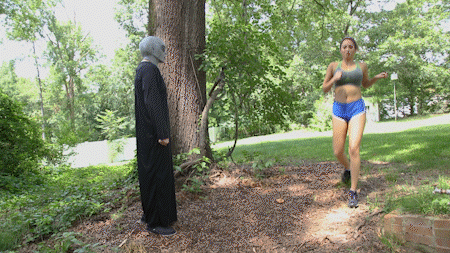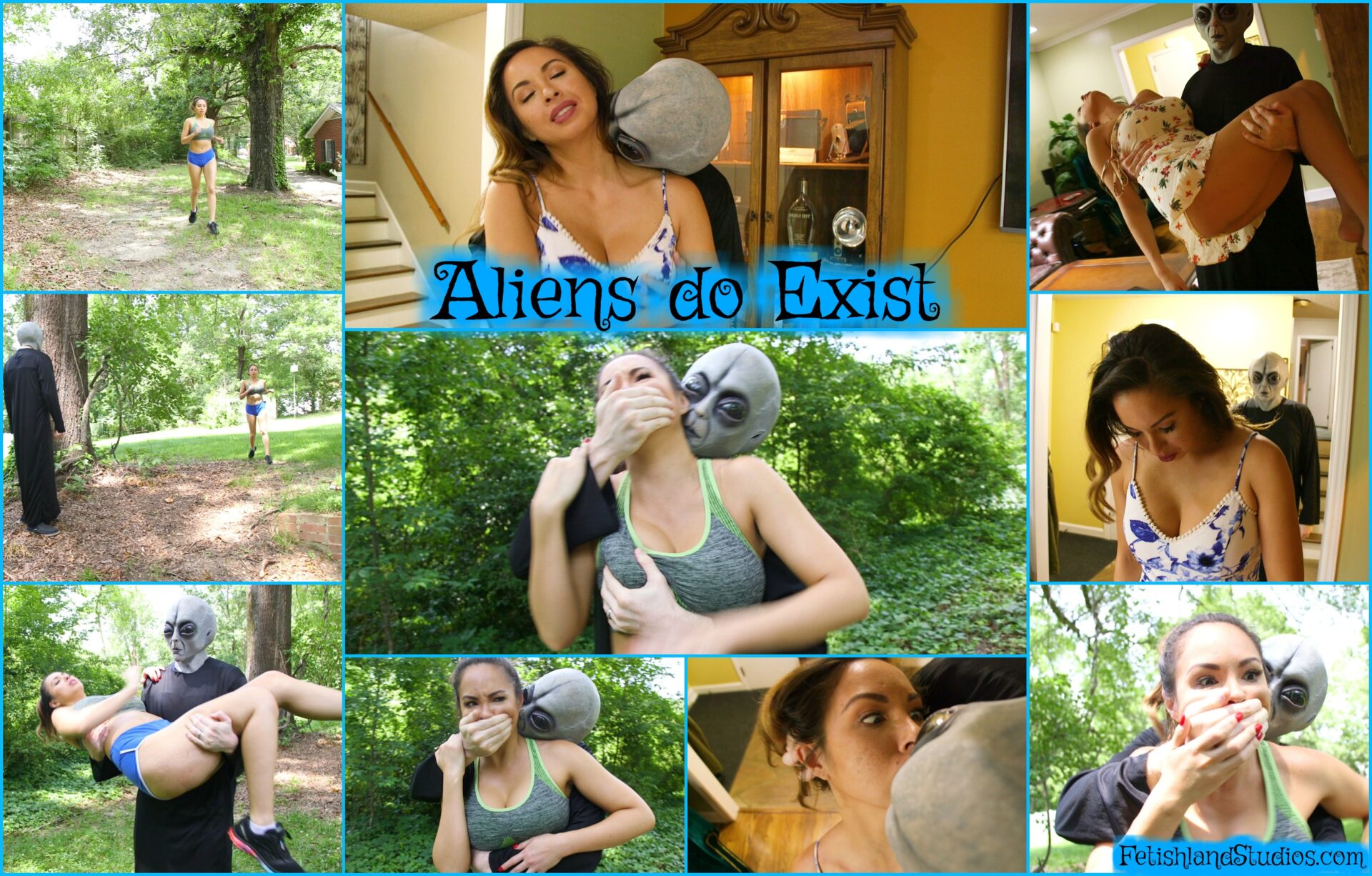 Lucy Purr is out for a jog in the woods. She jogs past a tree and is startled to notice someone standing behind it. It’s not just anyone either — it’s someone who appears to be in an alien costume! Lucy jokes that it’s a little early for Halloween, but gets a strange response in return, “You are needed on my home planet for breeding.” Lucy is freaked out and tries to run, but the creatures captures Lucy. He braces himself against her body from behind and clamps down on her mouth to muffle her screams.