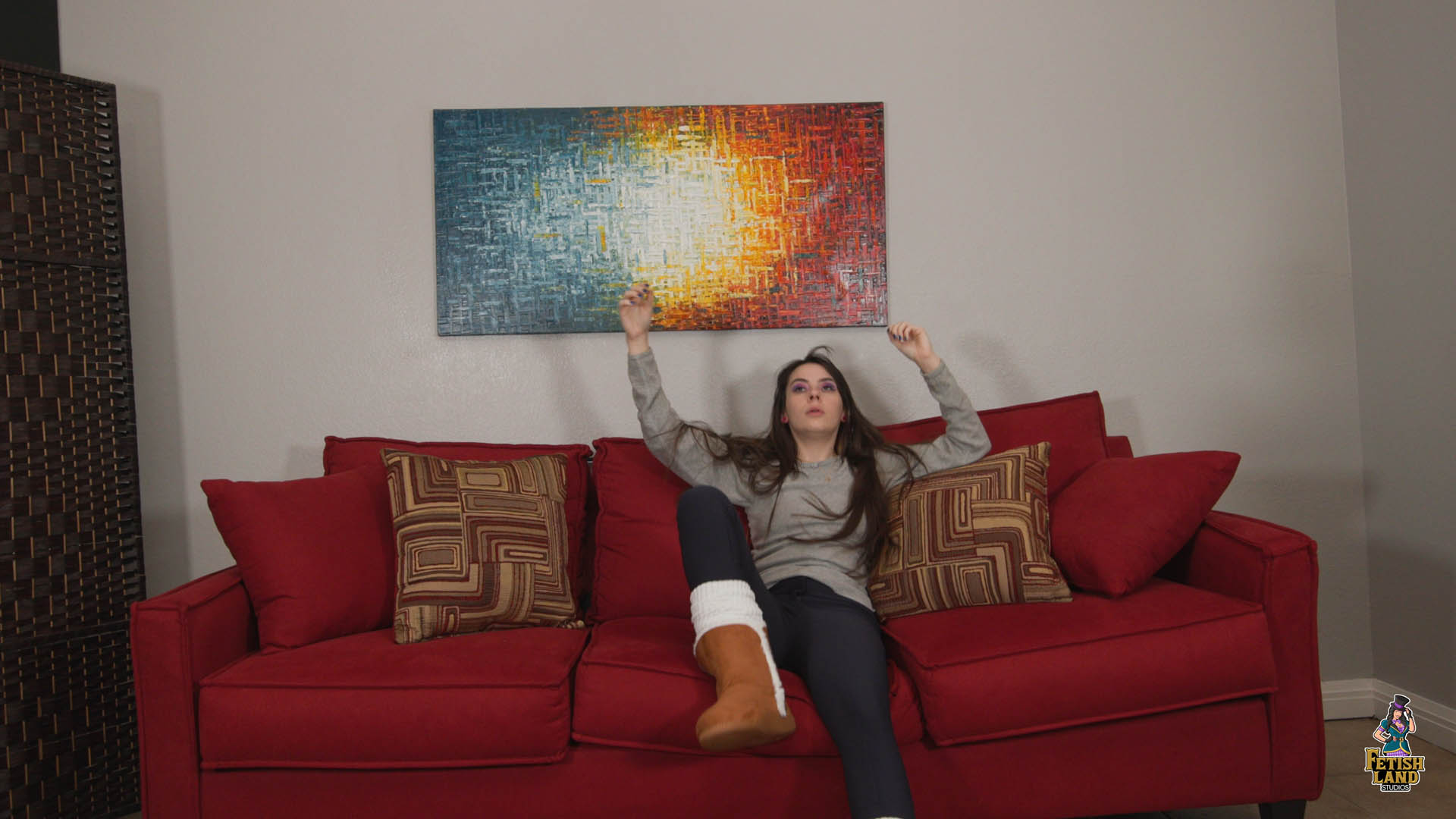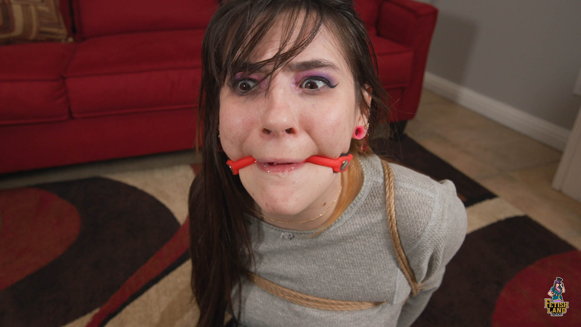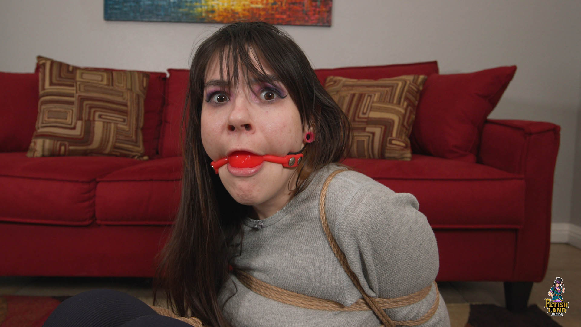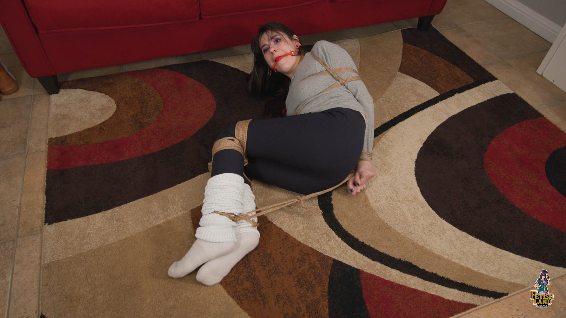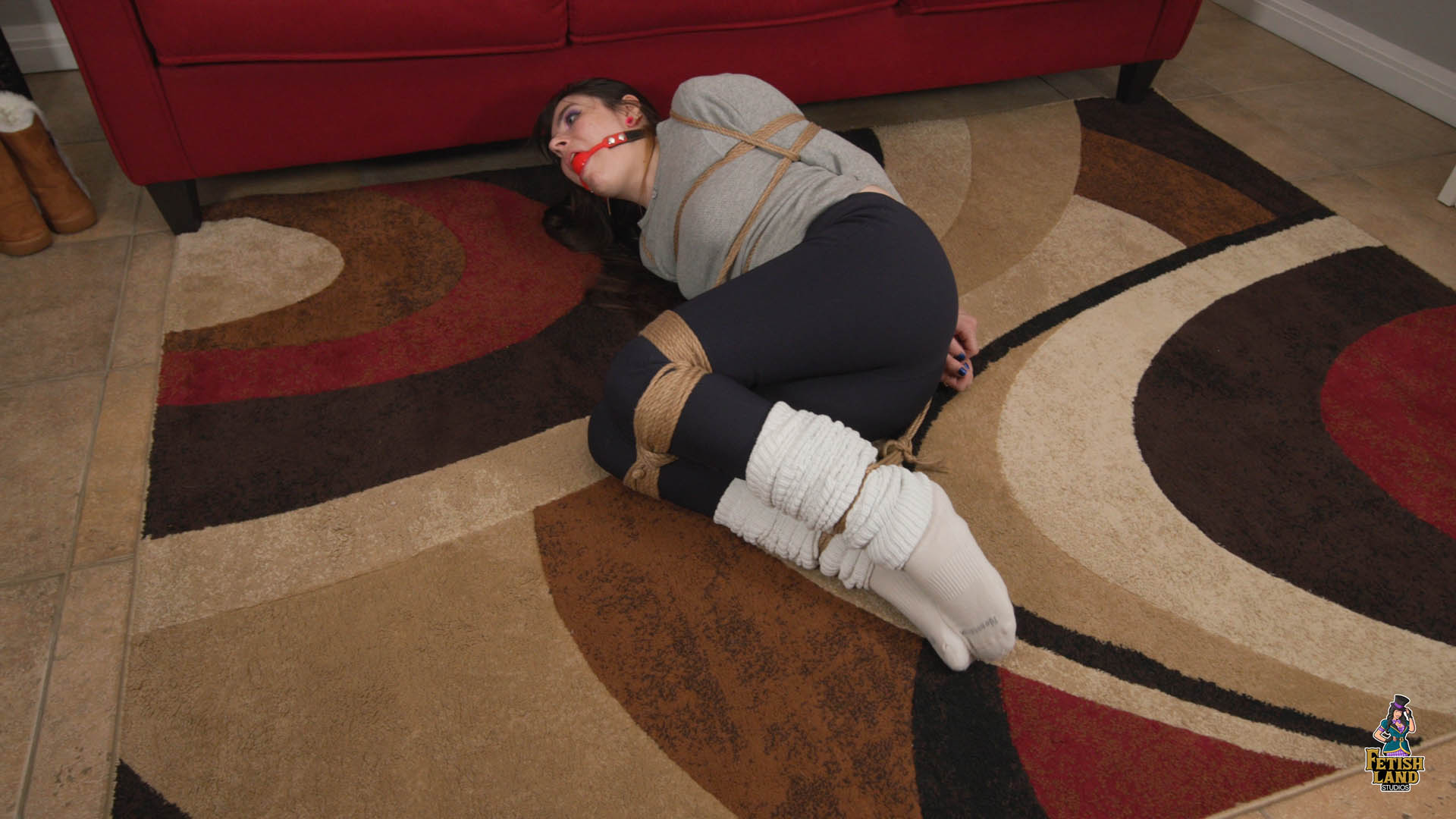 Ziva Fey arrives at the house, removes her shoes to socks, walks around a bit proceeding to get a drink to settle in and relax on the couch. She is then captured, and tied up in an extremely tight ball-tie. Gagged with a super big ball gag!