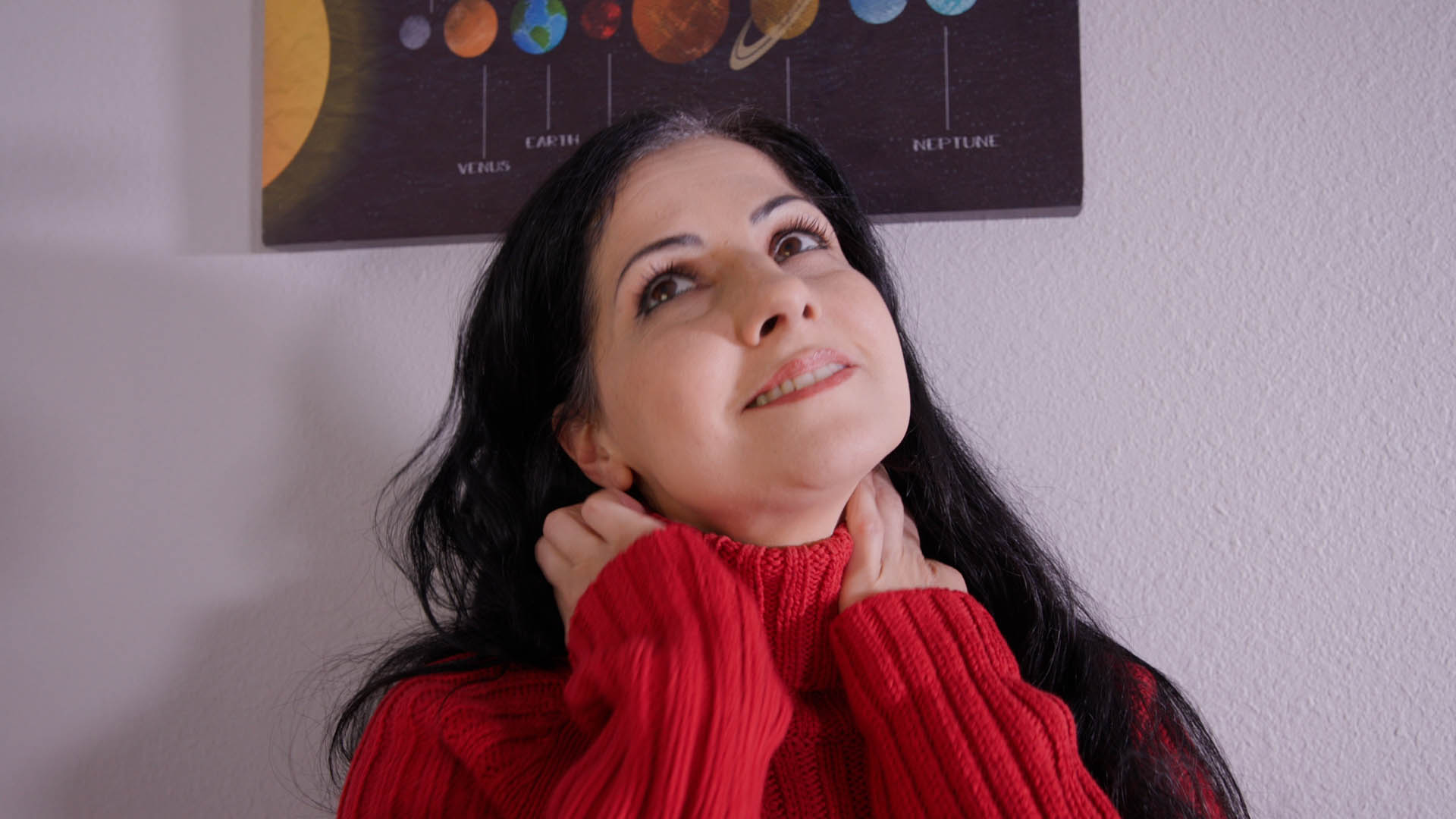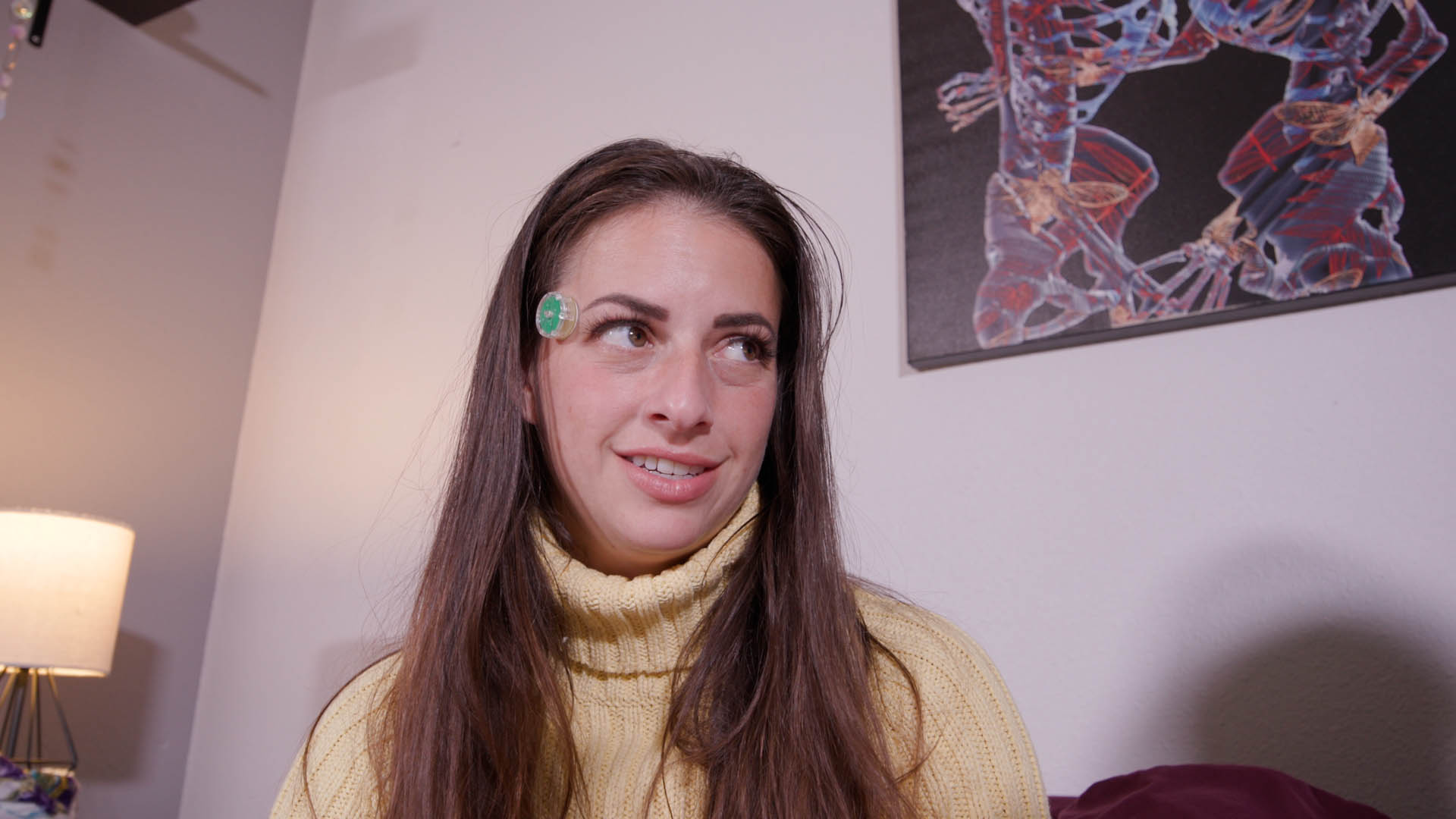 Hannah Perez and Indica Fetish lay on bed and stir, disoriented. They glance around and reach their temple. They have a tiny light/lense on their temple. Hannah’s light starts blinking. Her body trembles gently first, then sharply, her hands twitch, her back arches and her breathing shortens. She tries reaching out to Indica, but can’t. Suddenly, she stops trembling, uncurls her hands, shifts her shoulders, opens her eyes and sits upright. Hannah looks at Indica, then at her hands. She touches her chest, and it’s revealed there’s a man inside her now. She feels up her body as she explains what happened. Indica’s light starts blinking, and she raises her hand to the side of her head. She loses control of her body and trembles, until she settles. She takes a sharp breath and blinks. There’s a mind inside of her too. She examines her body, feeling herself up. Indica explains what’s going on. They both feel themselves up. Indica leans in and they both kiss, first tentative and curious, then deep and acting more natural. They pull each other in, pressing their bodies close.