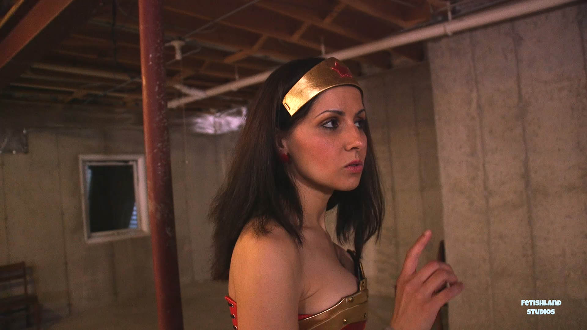 When Wonder Hannah catches up and encounters you both, she tries to join forces with you against the super villainess. But Super Sinn immediately thwarts this plan of yours. As Wonder Hannah reaches to you for help, you hold out a pair of handcuffs to her. You cuff her wrists behind her. Super Sinn pins her arms back and instructs you to use her as a punching bag. You and Super Sinn take turns beating the heroine with punches to the face and belly. She goes down. Super Sinn walks off and you follow.