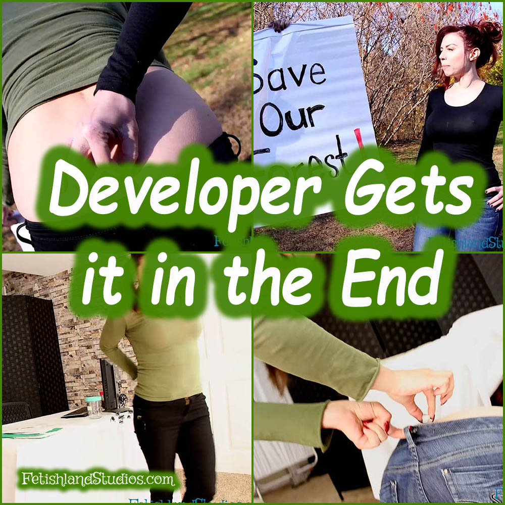 Meanwhile, Indica tries to direct everyone to do what is right. The forest was there before them and they should stay after. Back to Ludella’s plan, after lighting the candle its time to heat up the penny. Ludella approaches Indica, and Indica not knowing who she is tries to get her to join the protest. AS IF Ludella tells Indica. Nothing will stop Ludella from building her new mall. Ludella yanks Indica’s sign from her hand and tosses it away from her. Indica goes to pick it up, and the beloved butt crack hangs out ready for Ludella’s plan to simply unfold. Ludella drops the hot penny down Indica’s pants burning her butt. Once Indica gets it out she rubs her butt in pain and Ludella gets a good laugh in. “We are getting a REAL CRACK DOWN on you environmentalists!” While Indica is rubbing her poor crack Ludella comes up and pulls her pants down, showing Indica’s butt and well everything else. Indica tells Ludella that she is an evil woman but that doesn’t stop Ludella from pantsing Indica again after getting her pants up. “Serves her right!”