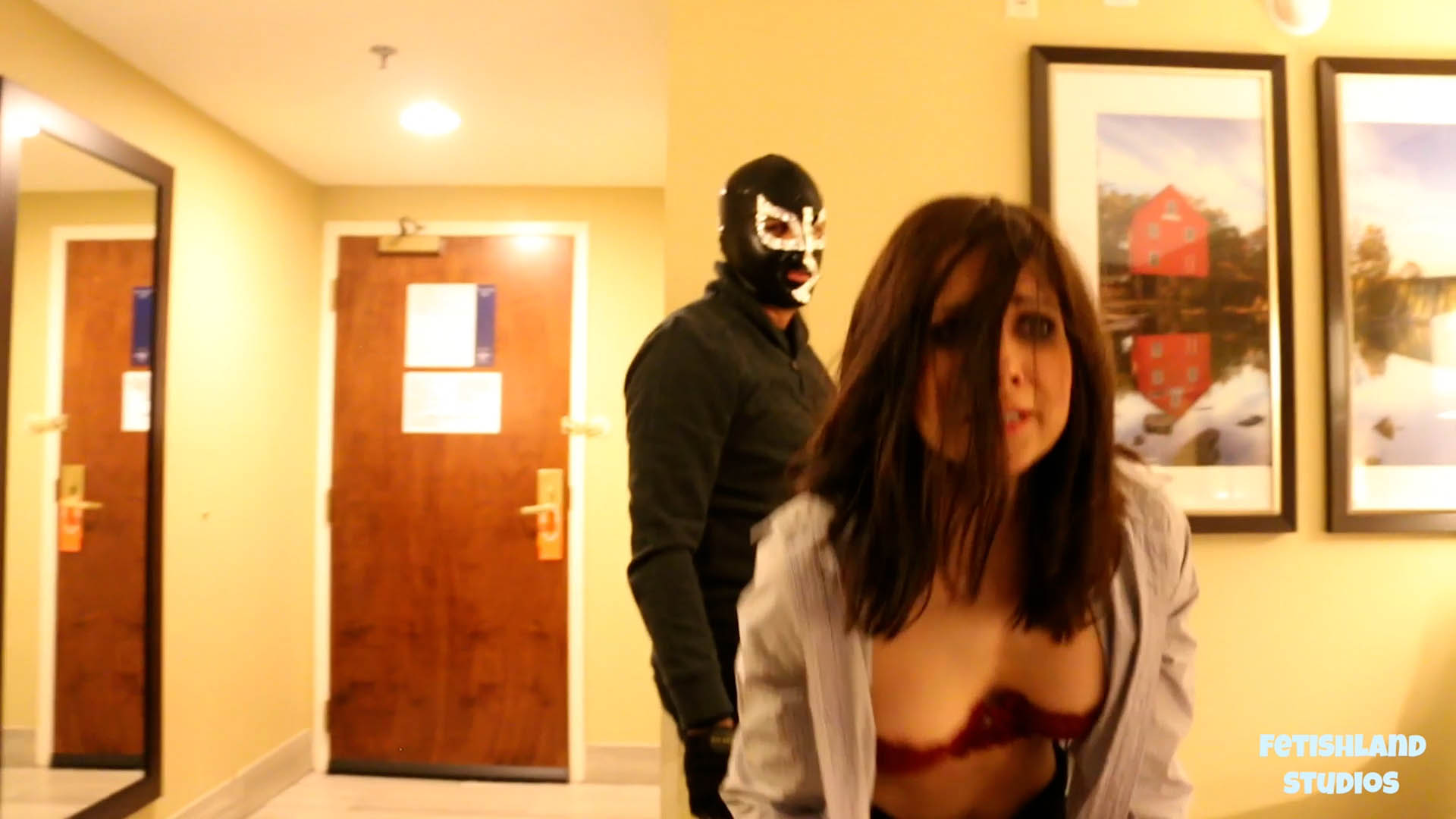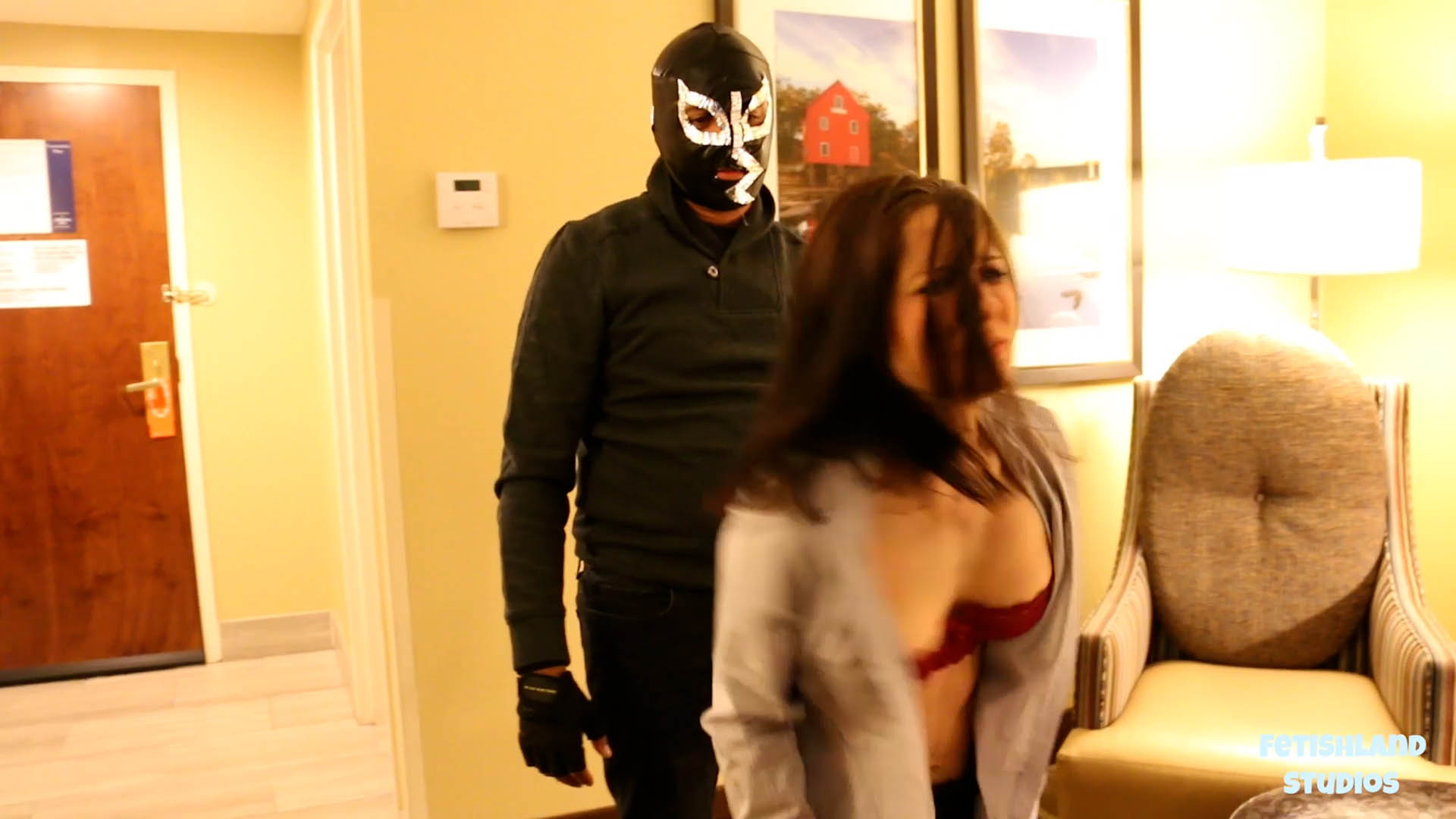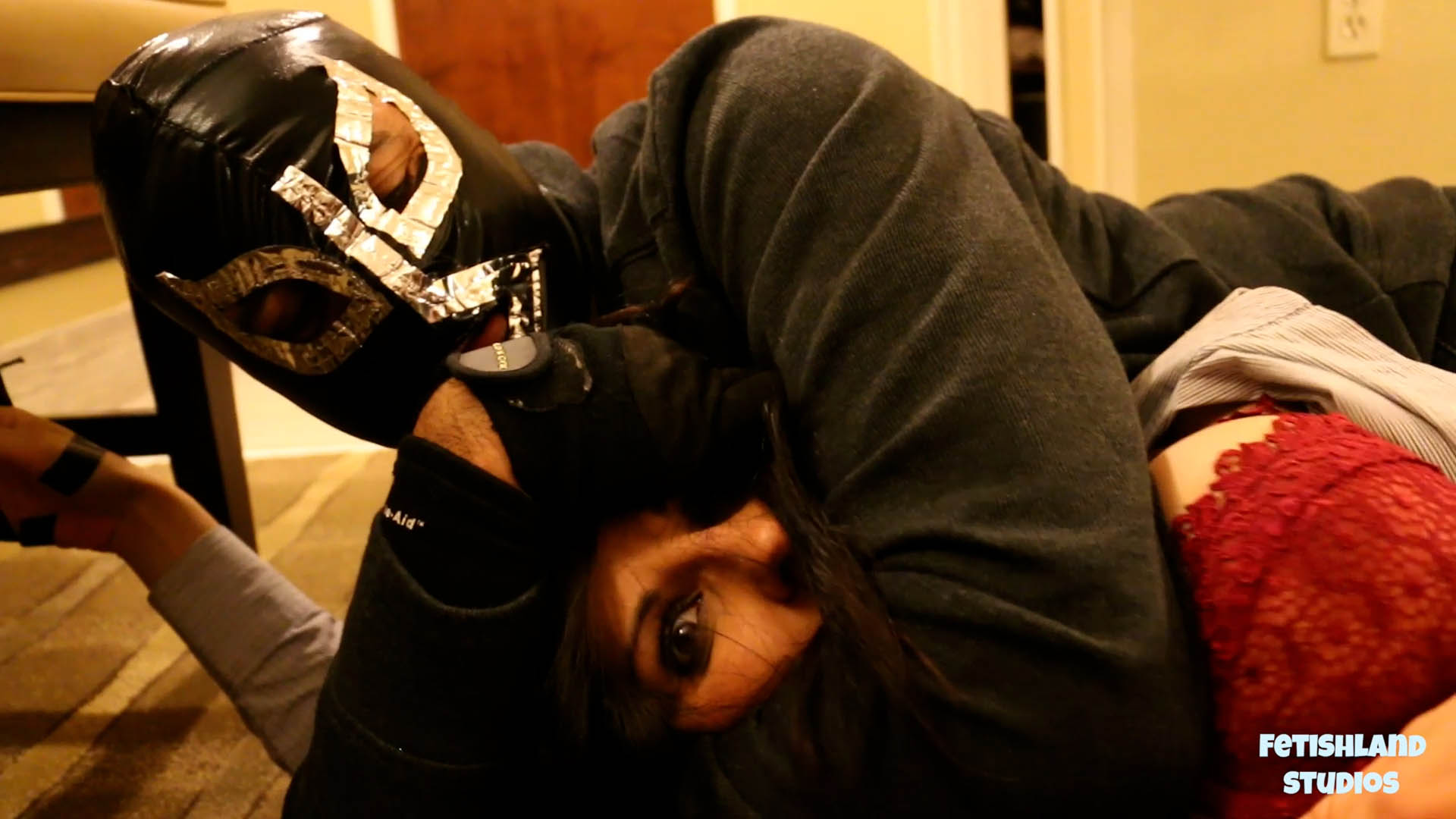 Diablo’s tickle attack is just getting started. Hannah Perez finds herself barefoot and partially stripped with her hands taped to a small table. Diablo comes from behind her and pulls her shirt down further, exposing her shoulders. He primes her for another tickle torture session with some armpit and rib tickling. Hannah has nothing nice to say. He chokes her and gives her a few good belly punches before trying something else. He continues experimenting with her and figuring out her soft spots, tickling her belly chest, face and neck. In between breaths Hannah bags for reprieve. Diablo shows no mercy. He moves down to her feet and Hannah bucks and kicks, Landing her a few heavy blows from Diablo to subdue her. While Hannah is slumped to the ground, Diablo tickles her some more. She struggles hard and manages to break free from her binds. She spins around and gives Diablo two good punches. As she stumbles back, he catches her in a sleeperhold and takes her down. It looks like Diablo will have to try another tactic with this feisty damsel.