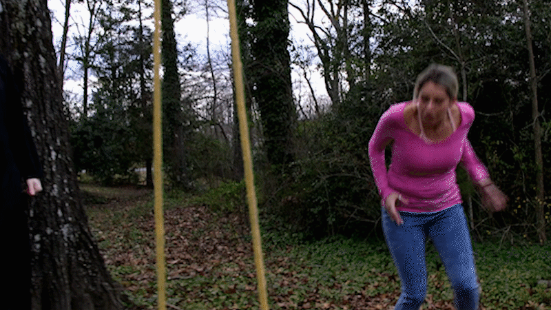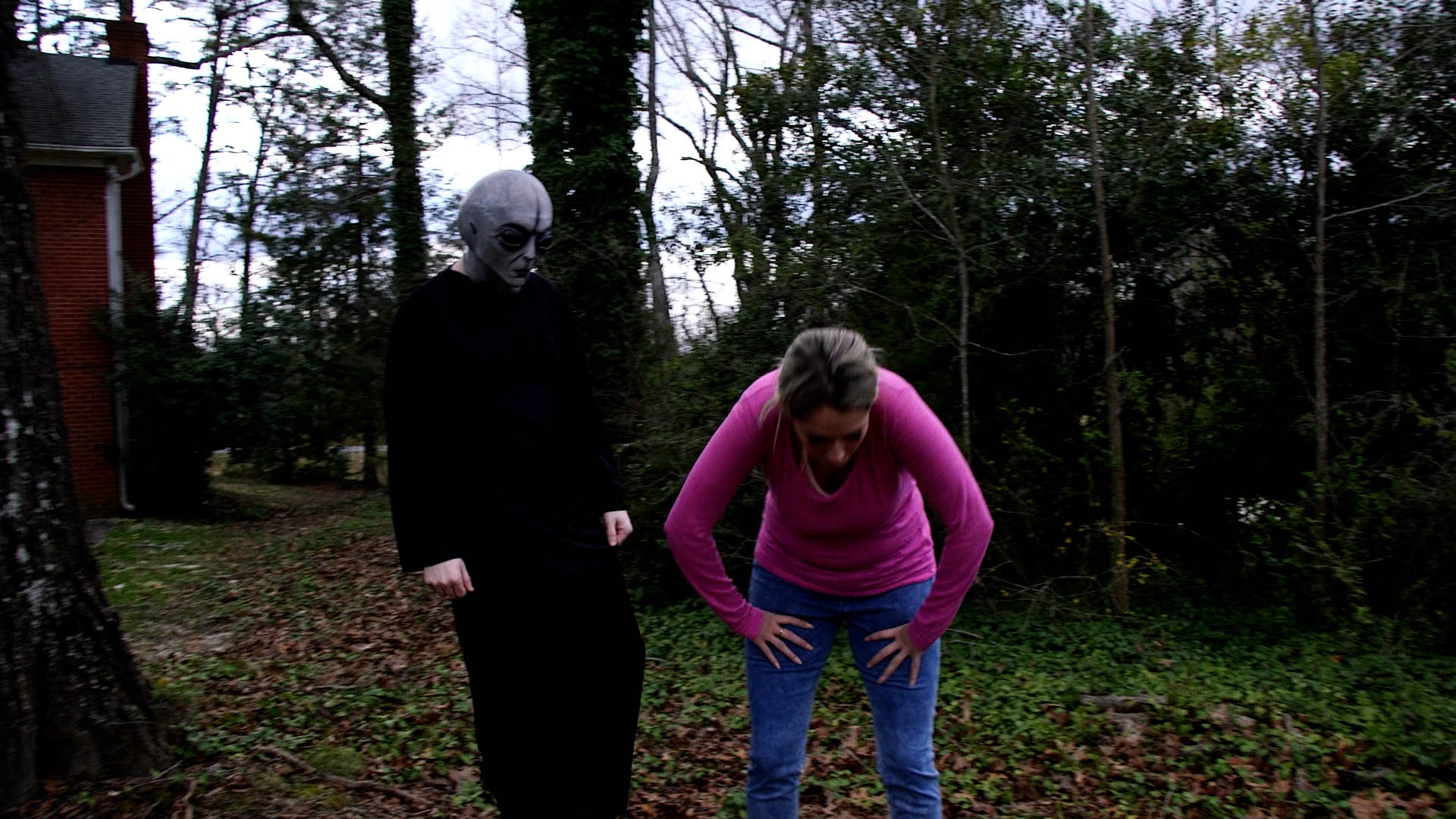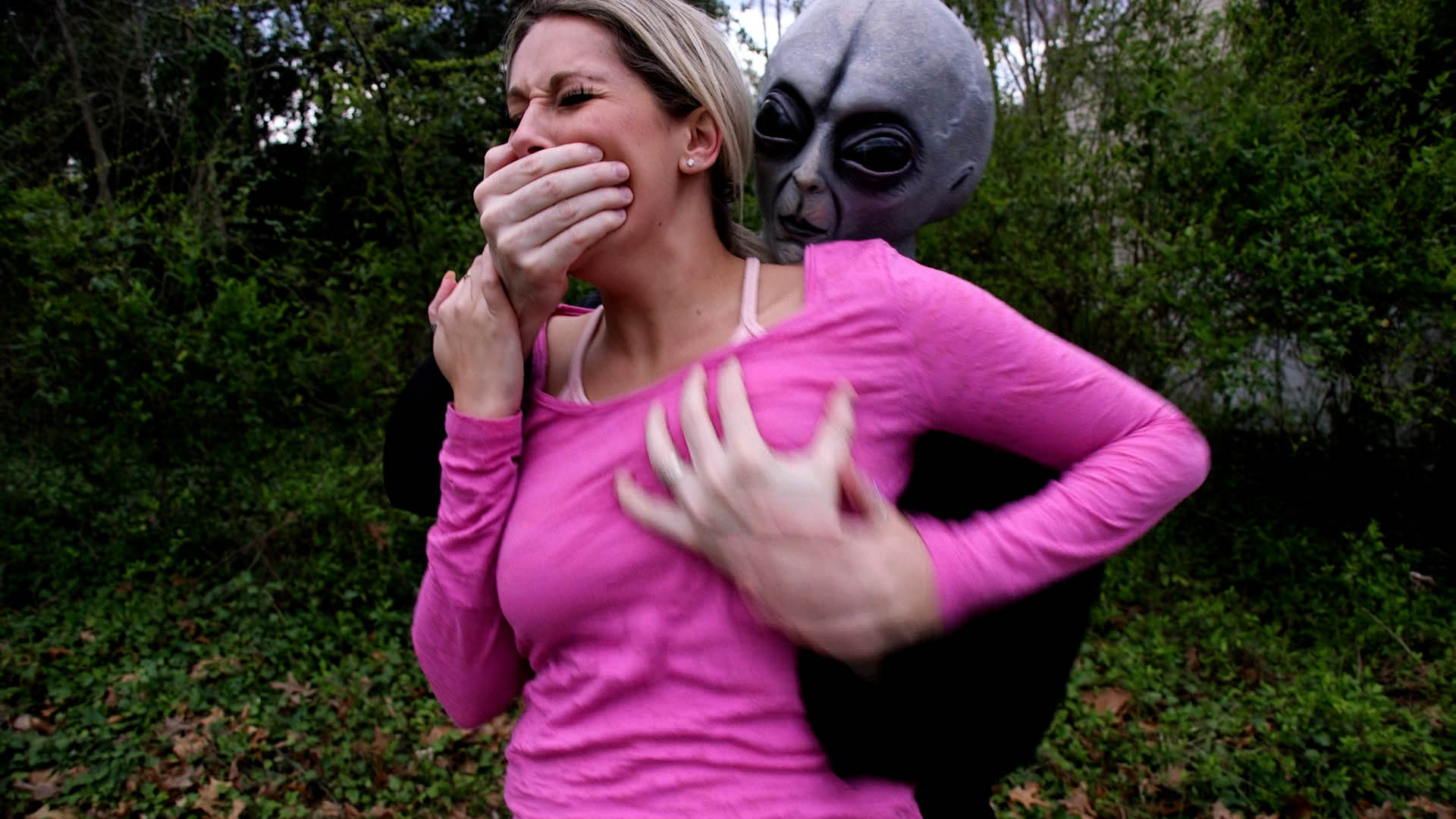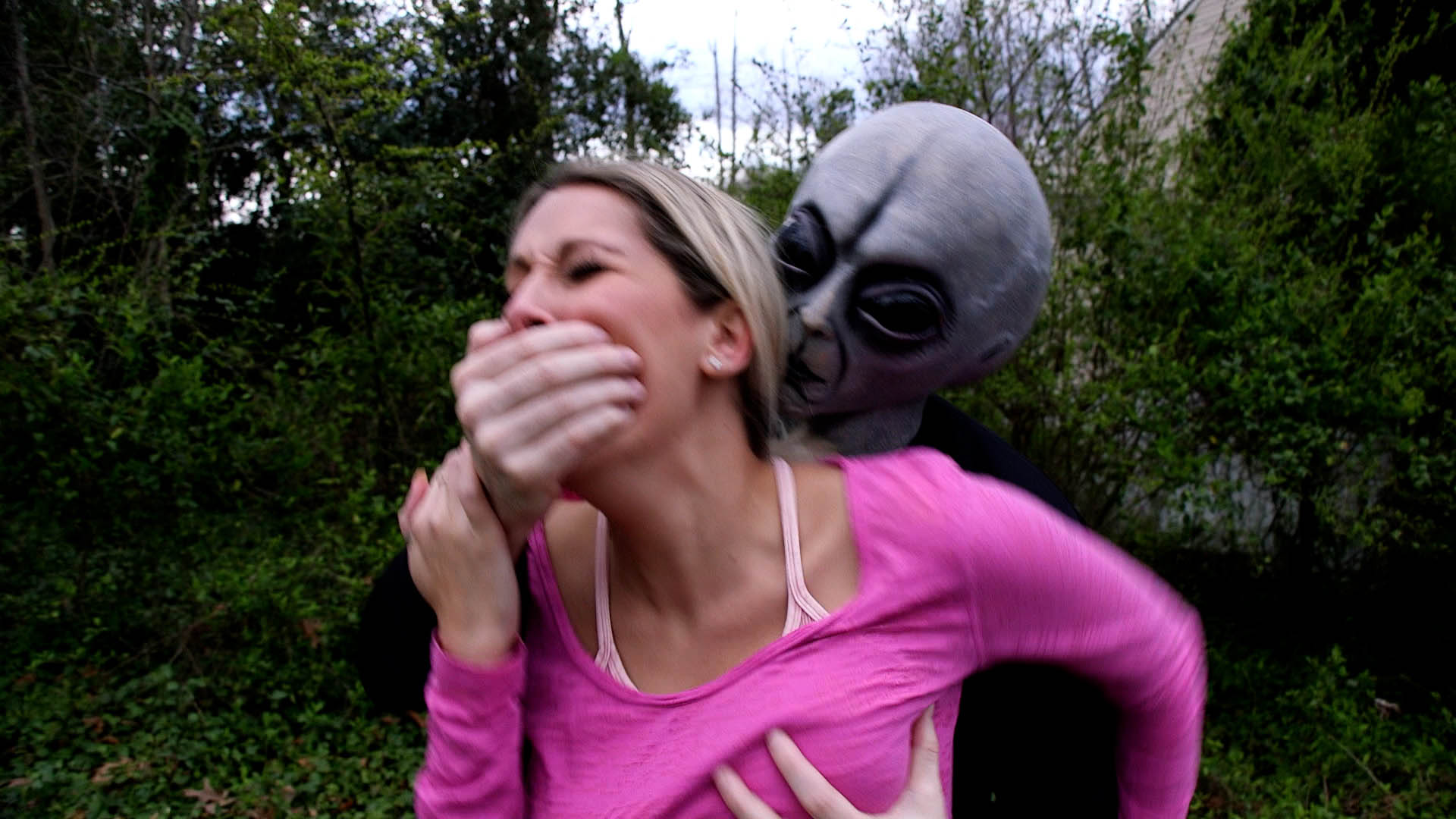 Nikki Brooks is out for a jog in the woods. She jogs past a tree and is startled to notice someone standing behind it. It’s not just anyone either — it’s someone who appears to be in an alien costume! Nikki jokes that it’s a little early for Halloween, but gets a strange response in return, “You are needed on my home planet for breeding.” Nikki is freaked out and tries to run, but the creatures captures Nikki. He braces himself against her body from behind and clamps down on her mouth to muffle her screams.