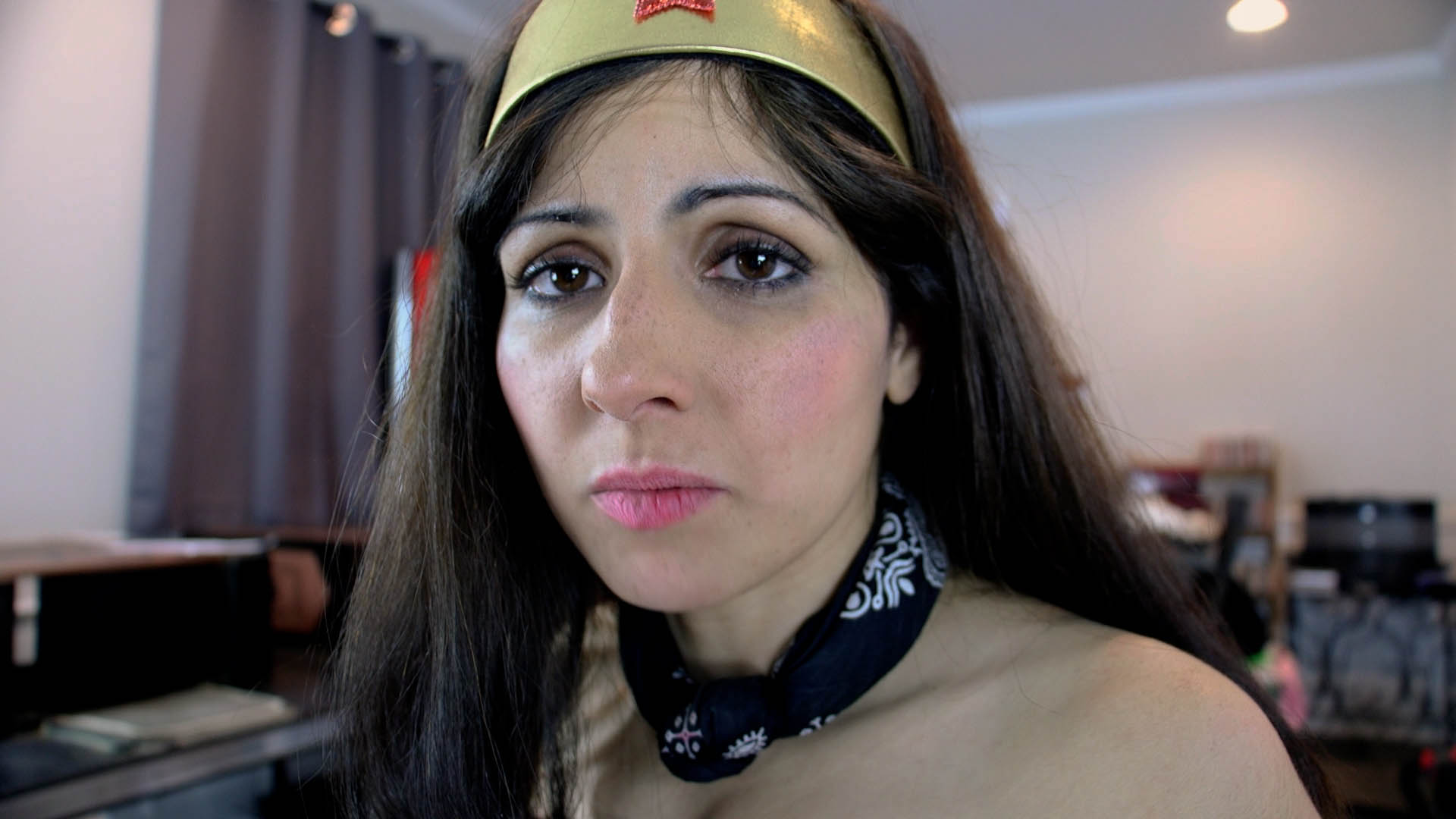POV pulls down the gag and she asks him to untie her, but he circles around behind Wonder Hannah and kneels down to tug on the ankle strap a few times, as if he’s attempting to unlock the buckle.