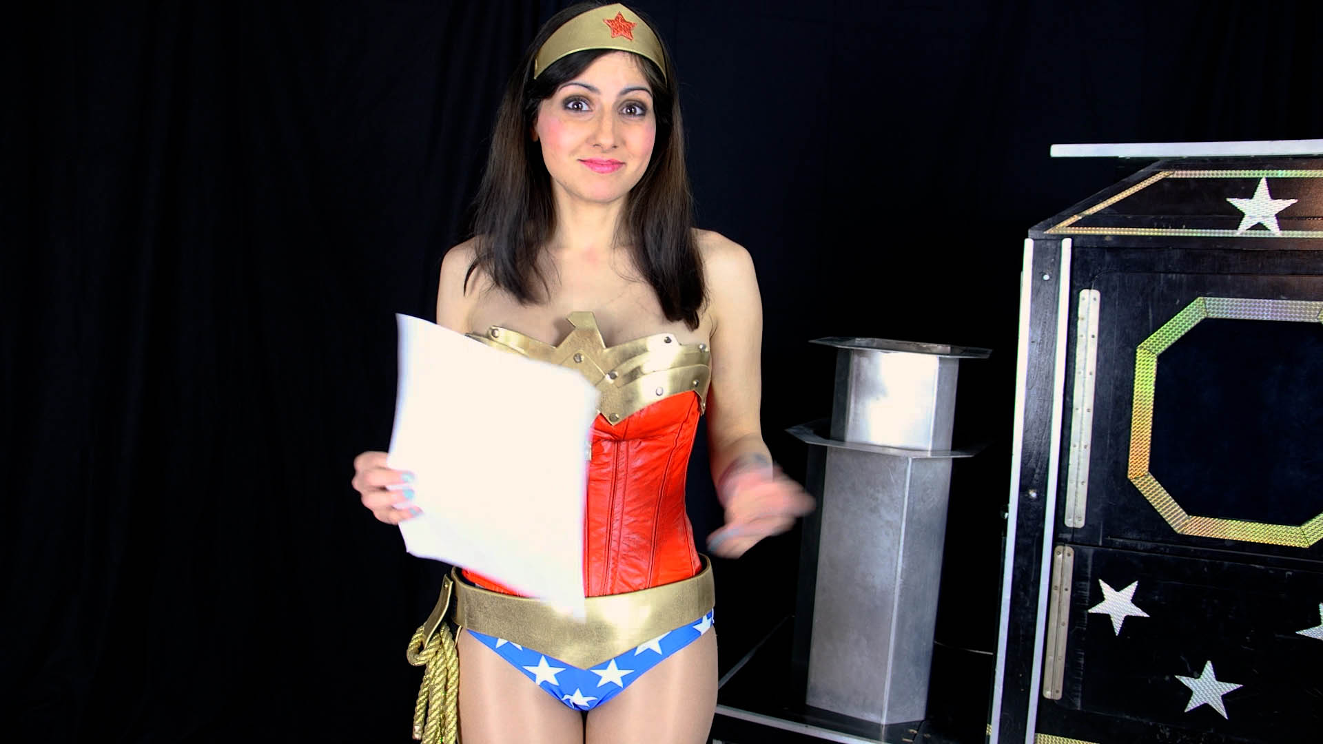 Wonder Hannah continues reading, and pauses again to confirm that being “bound and gagged” is a necessary part of the act. She teases that he just wants an excuse to tie her up. Panzon POV shakes his head no. Wonder Hannah finishes reading the script and summarizes. “So this is a comedy skit in the disguise as a magic act. Ok. Great. Well, let’s get started.” Panzon points to an “X” on the stage floor. Wonder Hannah uses this to tease Panzon by purposely standing to the right and left of the X saying something like “and I’m not supposed to stand here or here, but right here.” Hannah steps on the X with her heels together. Panzon brings out some black leather straps. He straps her upper and lower chest, thighs, ankles. Hannah is securely strapped while standing. Panzon produces a bandana and approaches Wonder Hannah with it. “Panzon, are you sure you really need to practice gagging me? This is just a rehearsal?”