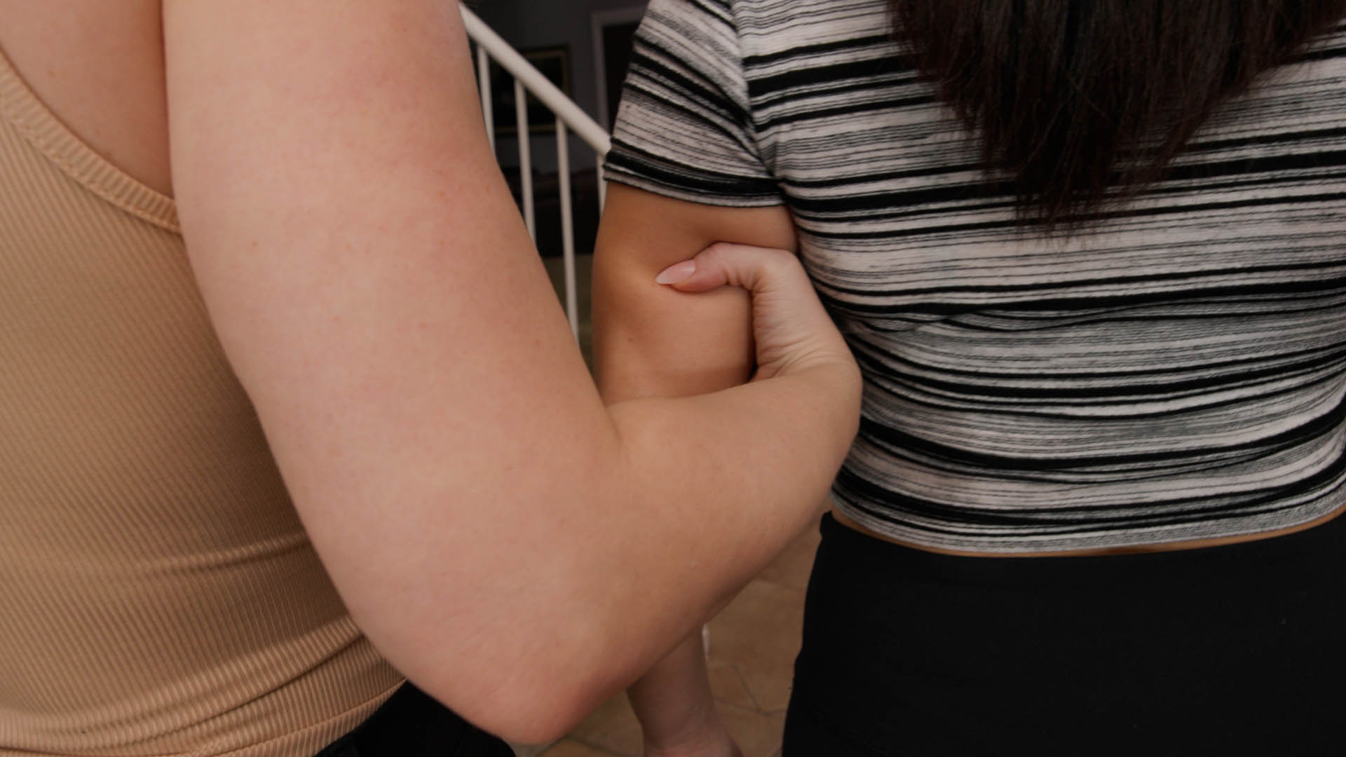 Therapist Summer is ending appointment with patient Sumiko. Sumiko asks for spanking. Summer physically stands Sumiko up and grips her upper arm, frequently adjusting and tightening grip, as Sumiko is submissive and cooperative. Summer escorts her to room, lowers her pants and spanks her through to end. By the end, Sumiko is crying.