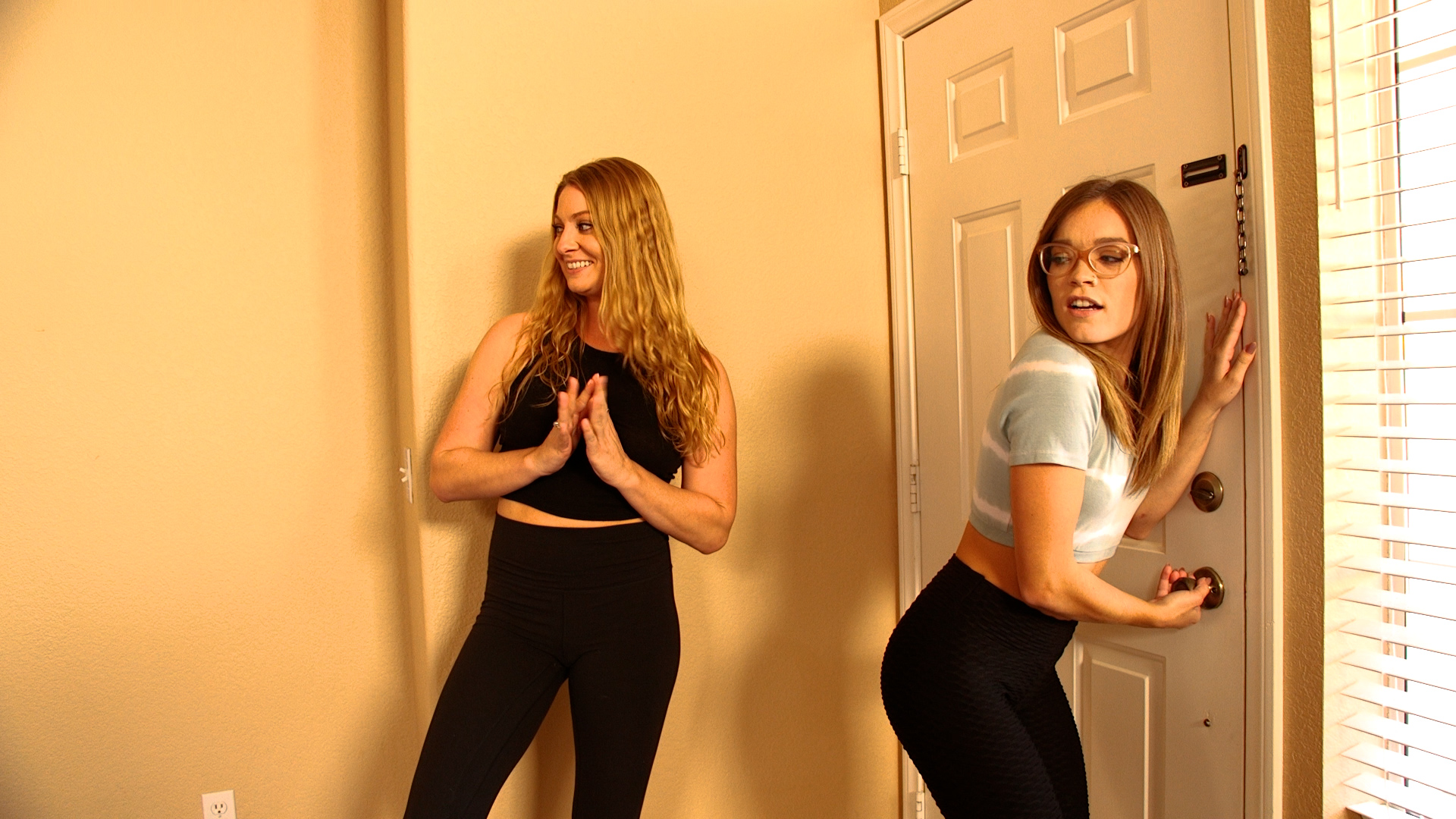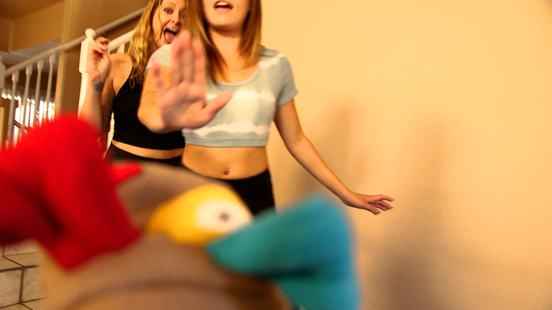 Dawgnappers Katie Kush and Veronica Weston enter the room looking for puppies, when Dawg hand puppet POV appears and growls and barks at them. They turn around, and Veronica Weston hides behind Katie Kush. Dawg runs at Katie Kush, bites the leg of her leggings, pulls back, as she tries to take him off her. Dawg doesn’t let go, so Katie Kush stumbles back into Veronica Weston and they both fall to the floor on top of each other. Katie Kush tries to get up, and Dawg runs over and bites hold of Katie Kush’s top, tugging on it and pulling it over her head. Katie Kush is on all fours on the floor trying to get up and to get top off from over her head. Veronica Weston gets up and tries to grab Dawg. When she bends down, Dawg runs between her legs, jumps up and bites her butt, making her squeal with pain. Dawg bites into Veronica Weston’s leggings, pulls back on them, growls and shows her panties. Veronica Weston struggles with Dawg, trying to keep leggings from falling down. Dawg let’s go of her leggings after stretching them back, which makes them snap against her bum. Veronica Weston stumbles around, as leggings slide down and fall around her ankles. She tries to cover herself, but stumbles around. Dawg sniffs between her legs a bit, as she tries to push his head away. Katie Kush keeps trying to pull the top off her head. Dawg goes for her and tugs top off over her head, revealing her bra. Katie Kush covers herself, as she is on all fours. Dawg runs behind her, bites her panties (showing above her leggings) and pulls back on them, showing her bum. Katie Kush struggles with Dawg, and as Dawg lets go of her panties they snap against her bum. Dawg bites her butt, and she squeals and runs forward towards Veronica Weston, who still tries to get fog off her leggings. Katie Kush runs face first between Veronica Weston’s legs. They stumble back and crash into wall, slide down to floor together and ground and squeal. Dawg barks at them. Katie Kush gets out of between Veronica Weston’s legs. Katie Kush finds the top and puts it back on, as Veronica Weston gets up. They both try to run, but Dawg chases them. Dawg bites hold of Veronica Weston’s leggings around her ankles, making her fall face first against Katie Kush’s butt. Veronica Weston accidentally pulls her leggings and panties down as she falls, and they both fall to the floor. Katie Kush crawls out of her panties and leggings, running out of shot. Veronica Weston gets her face out of clothes than have been left. Dawg runs over and bites into her panties, tugs back on them. Dawg pulls Veronica Weston’s panties down her legs and ankles, and then off her. Veronica Weston gets up and runs away. Cut to Veronica Weston and Katie Kush, pantless, covering themselves, leaving the house and running away.
