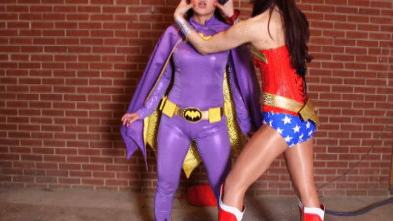 Batgirl, Sumiko Dreams comes in calling for the person with the distress call. No one answers her but Wonder Woman, Hannah Perez, does walk in sneaking behind her. Wonder Woman hits Sumiko with a weapong freezing her. Batgirl stepped right into Wonder Woman’s trap again. She begins circling Batgirl telling her how much fun she is going to have with her. Wonder Woman brought her bag of goodies for Batgirl. Then she begins moving Batgirl making her hand touch herself. Wonder Woman says that she makes a pretty statue. She can make Batgirl do whatever she wants to make her do. Wonder Woman snaps Batgirl out of it but the floor is a little sticky and she can’t leave. Batgirl tries her best to get out of it but she won’ tbe going anywhere. Wonder Woman invites Batgirl to take a swing at her. Batgirl lands a punch but Wonder Woman laughs it off. Nothing is going to phase her. Wonder Woman has a lot of things in store for Batgirl. As she freezes Batgirl again she takes off her mask showing it is Sumiko. Wonder Woman keeps Sumiko stuck and frozen until she decides to mesmerize her so that she can finish her off. Stripping her to her bra and panties and then taking her to her eternal slumber.