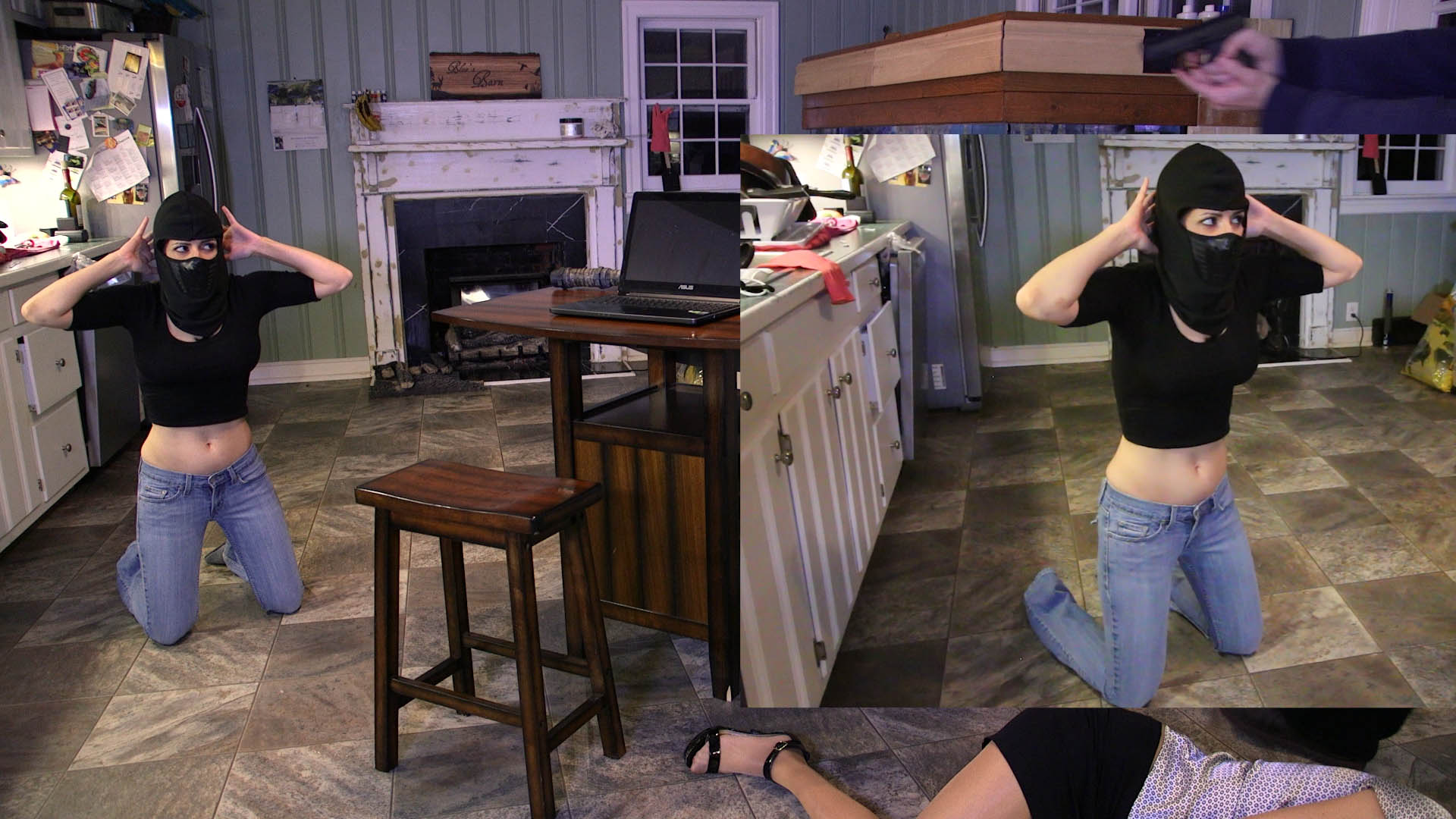 Savannah Costello moonlights for a secret criminal organization. Tonight she is doing some data entry when suddenly the door bursts open. Hannah Perez, a spy, forces her way in and threatens Savannah, instructing her to offload some data onto a memory card and give it back to her. As Hannah is waiting, Savannah has her arms up in submission. She can’t help but tremble in fear. What takes minutes for the data to transfer feels like hours. Eventually the feeling overcomes her and Savannah urinates herself. Once the data has successfully moved over, Hannah takes the memory card and prepares to leave. Before she does, she decides to do something about the witness, and whacks Savannah over the head with a pipe, sending her down to the floor asleep. Bad timing, though — Hannah didn’t get out fast enough it seems. Savannah‘s bodyguard walks in and takes over. He forces Hannah down to her knees and threatens her. Hannah is overcome with fear and also pisses herself, the urine soaking through her jeans and pouring out onto the floor beneath her. This doesn’t stop him from carrying out his task. Hannah falls down immediately limp on the floor, laying akimbo in her own puddle with savannah similarly positioned just feet away from her. Savannah begins to come to. At first she is relieved to see the fallen Hannah and her bodyguards familiar face. But he quickly states his disapproval of Savannah‘s actions, saying that she didn’t do a good enough job of guarding her spot. He finishes Savannah off as well and sends her back down into a pile on the floor. Both women lay breathless and abandoned at the scene of this double crime.