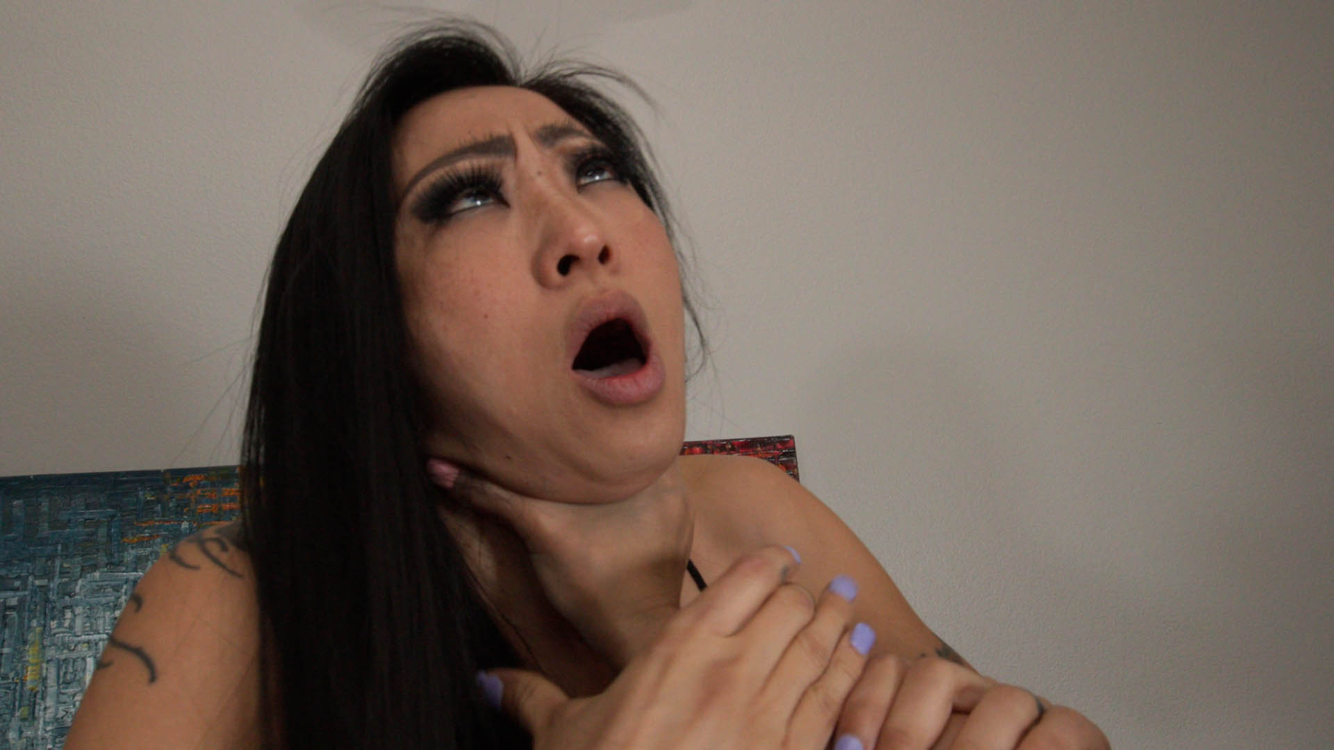 1. Nicole Oring sits on a chair with crossed legs. Sumiko Dreams sneaks behind her and snaps at her. Nicoles makes a few twitches and enters fake d with eyes and mouth open. Nicole wakes up and snaps Sumiko with her feet, then puts feet on her face. Sumiko goes down and Nicole puts her feet on Sumiko’s face.