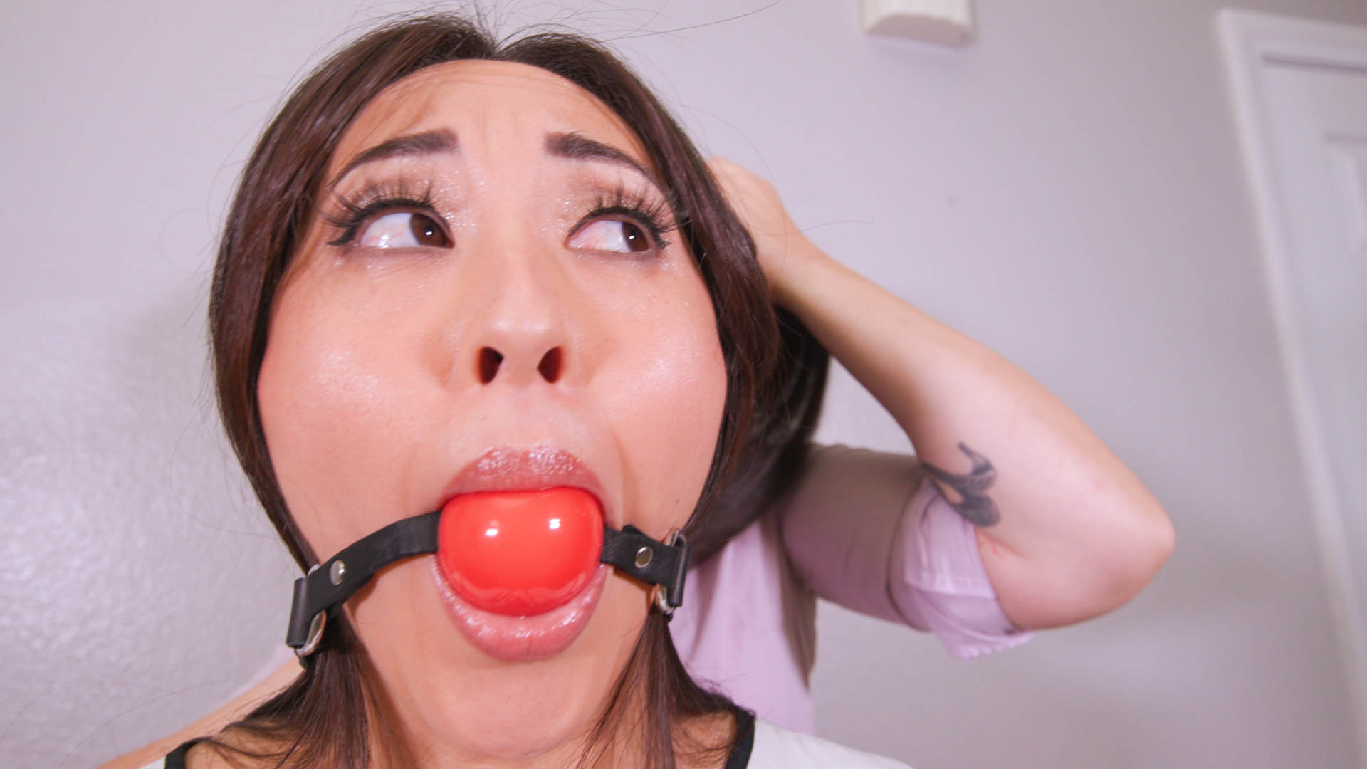 Sumiko Dreams enters the room, Tilly McReese sits on the couch, handcuffed behind her back. Sumiko sits and they talk. Tilly reveals she’s cuffed and teaches Sumiko how to act when cuffed. Tilly removes her cuffs and sets them on a table. She rolls up Sumiko’s sleeves, they remove their watches and Sumiko puts the Michele watch on her left wrist. Sumiko turns around and puts hands against the wall, then Tilly handcuffs her behind her back. Sumiko gets upset and Tilly calms her. Tilly gets a ball gag and gags Sumiko. She makes her walk across the room. Sumiko does it with her head down and fidgeting hands. Tilly tells her to walk with confidence, which Sumiko does. Tilly removes Sumiko’s handcuffs and gag and tells her she did well. Sumiko gives back the watch, then Tilly asks her to handcuff her for her next client.