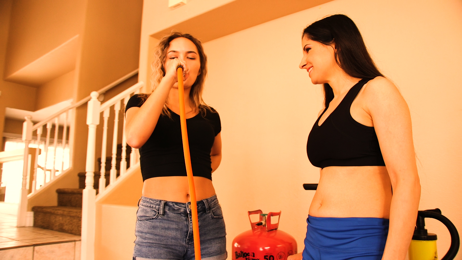 Hannah Perez and Blake LaVista walk in, as Blake LaVista lost bet to do whatever Hannah Perez wants for the rest of the day. Hannah Perez proposes blowing up like balloons. Hannah Perez sticks air compressor in her mouth and her belly blows up. Blake LaVista feels her belly and laughs. Hannah Perez deflates. Hannah Perez sticks air compressor in Blake LaVista’s mouth, blowing up her belly, then deflating. Blake LaVista unbuttons shorts, grabs hose, sticks it in her mouth and blows to her max. Hannah Perez feels Blake LaVista’s belly before she deflates. Hannah Perez lays down and Blake LaVista sticks hose in her mouth, blowing her up to her max. Hannah Perez deflates. Blake LaVista takes shirt and shorts off, then lays down. Hannah Perez sticks double action pump tip in Blake LaVista’s mouth, blowing her up to her max. Hannah Perez takes sports bra off and lays down. Blake LaVista pumps Hanah up to her max. Blake LaVista lays down and sticks air compressor hose in her mouth, blowing up a little as a pregnant woman. Blake LaVista gets to her max, holds it in and stands up. Blake LaVista catches Hannah Perez off guard and sticks fireplace pump up her butt, pumping her up to her max. Hannah Perez grabs Blake LaVista and forces her mouth down on helium tank nozzle, as she panics and moans. Hannah Perez blows Blake LaVista up to her max and holds her lips. Blake LaVista feels her belly and boobs, then Hannah Perez lets go as she deflates. They take turns inflating each other with air compressor hose, laying down and standing up. Blake LaVista sticks air hose in Hannah Perez’s belly button and blows her up to her max. Hannah Perez deflates. Blake LaVista turns around looking at something and Hannah Perez sticks nozzle up her butt, blowing her up to her max. Hannah Perez pulls nozzle out and Blake LaVista deflates. Hannah Perez inflates Blake LaVista with hand balloon pump, fireplace pump, bike pump and double action pump. Then Blake LaVista inflates Hannah Perez a couple of times. Blake LaVista accidentally trips and falls on helium tank, with its nozzle going up her butt. Blake LaVista inflates and feels her belly and boobs, while muffling out a muffled yell for help. Hannah Perez laughs and feels her belly. Blake LaVista grabs Hannah Perez, puts her mouth on Hannah Perez’s mouth and blows her up to her max, until nozzle pops off Blake LaVista. Hannah Perez and Blake LaVista deflate. Hannah Perez blows up Blake LaVista’s thumb, blowing her up to her max. Hannah Perez pushes Blake LaVista’s belly button to deflate her. They get into an argument. Blake LaVista grabs air hose, and they wrestle as Blake LaVista tries to put it in Hannah Perez’s mouth. Hannah Perez turns hose back on Blake LaVista, blowing her up to her max, inflating her so much she can’t move. Blake LaVista muffles a scream and moans, before exploding with a pop. Blake LaVista’s bra and panties are left and Hannah laughs.