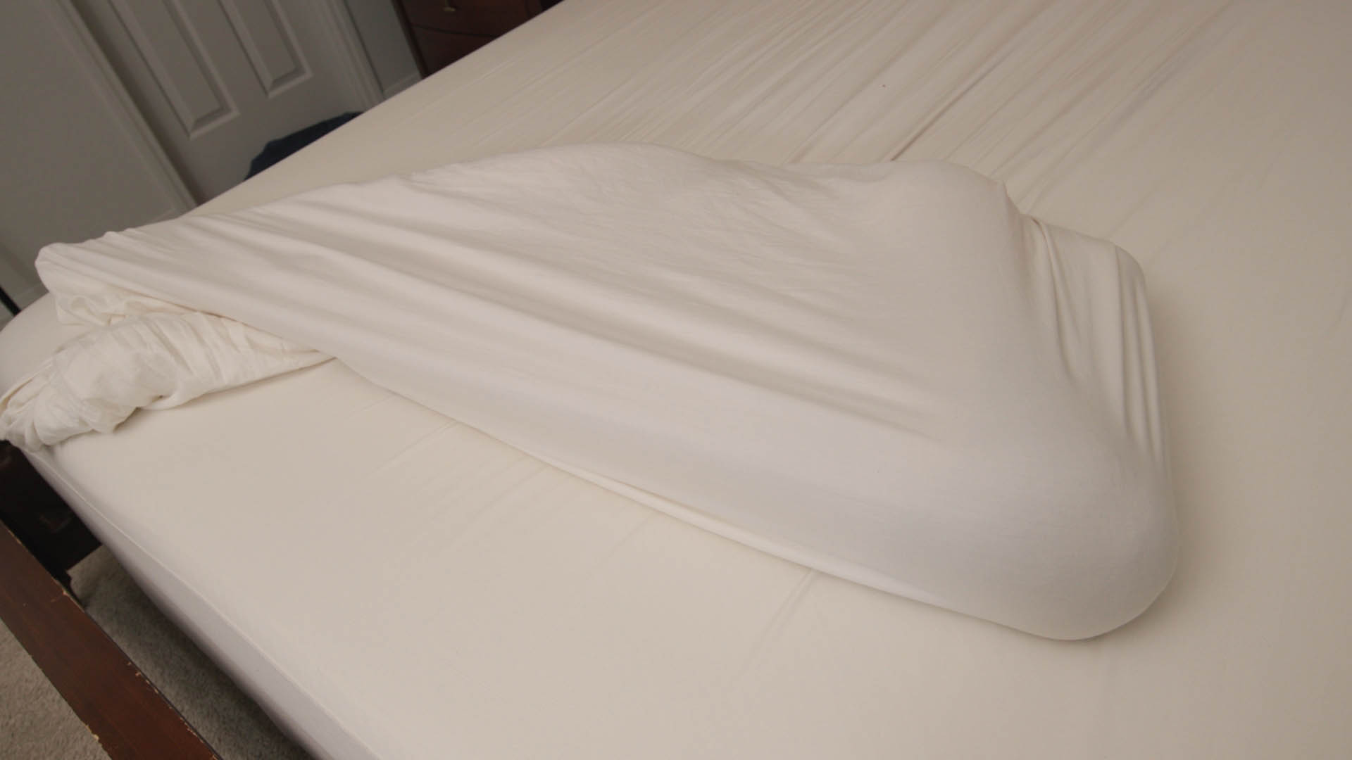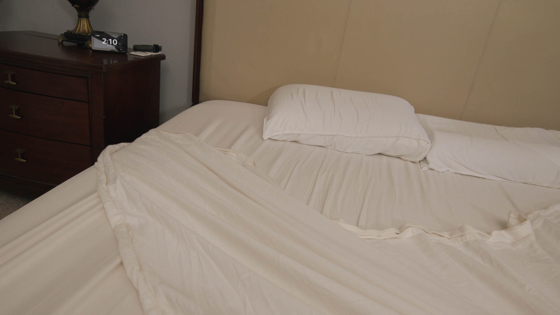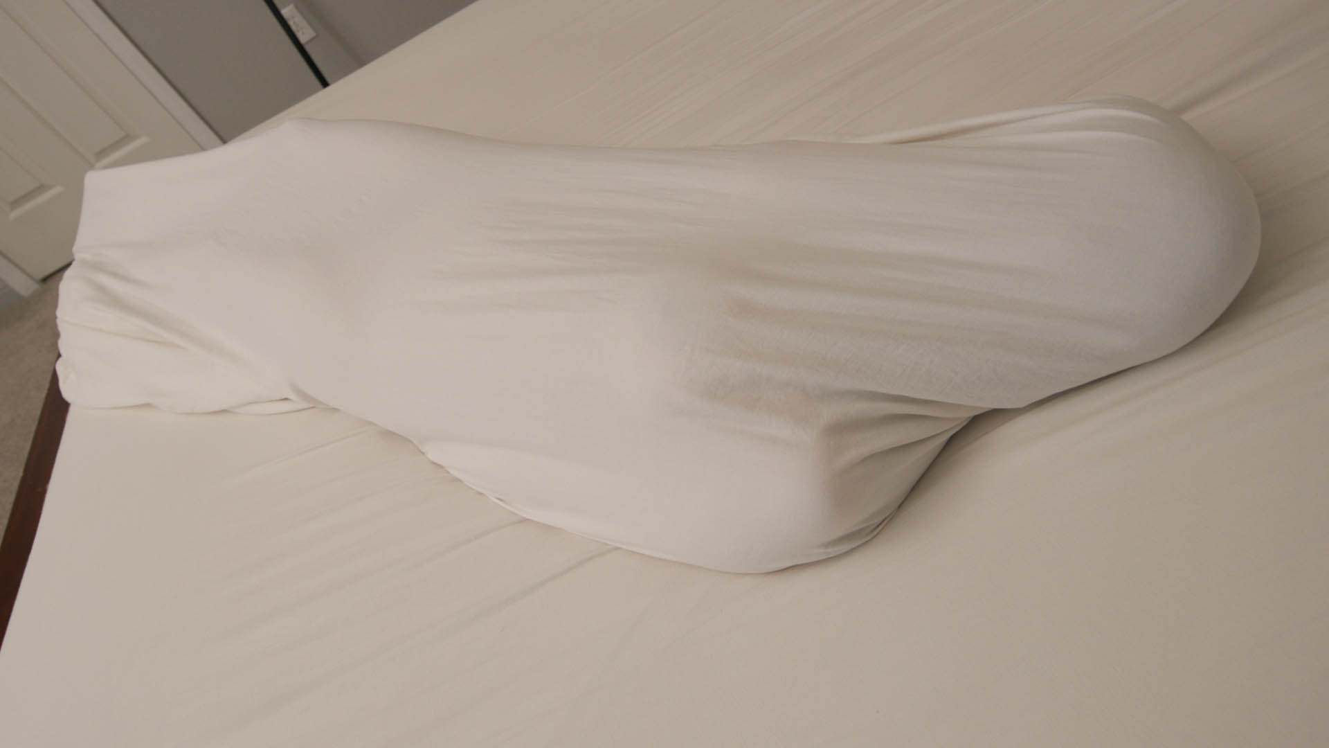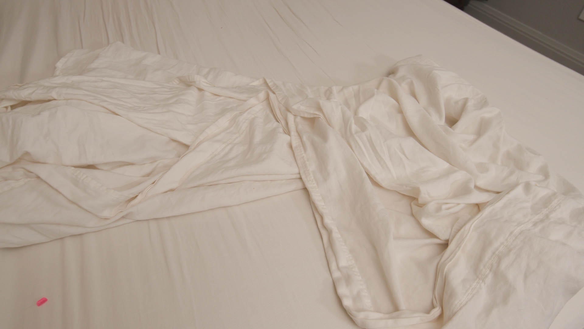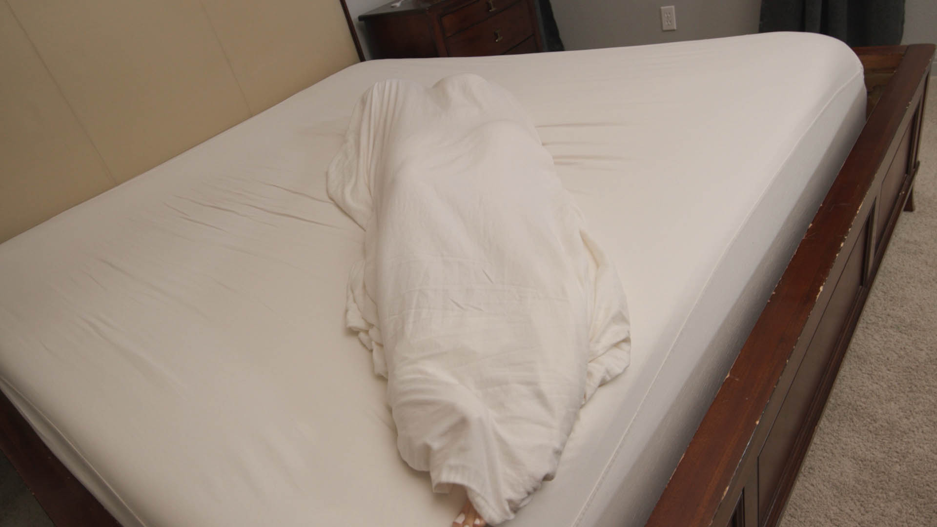 Hannah Perez gets slowly swallowed by the bedsheet that turns into a snake-like creature.