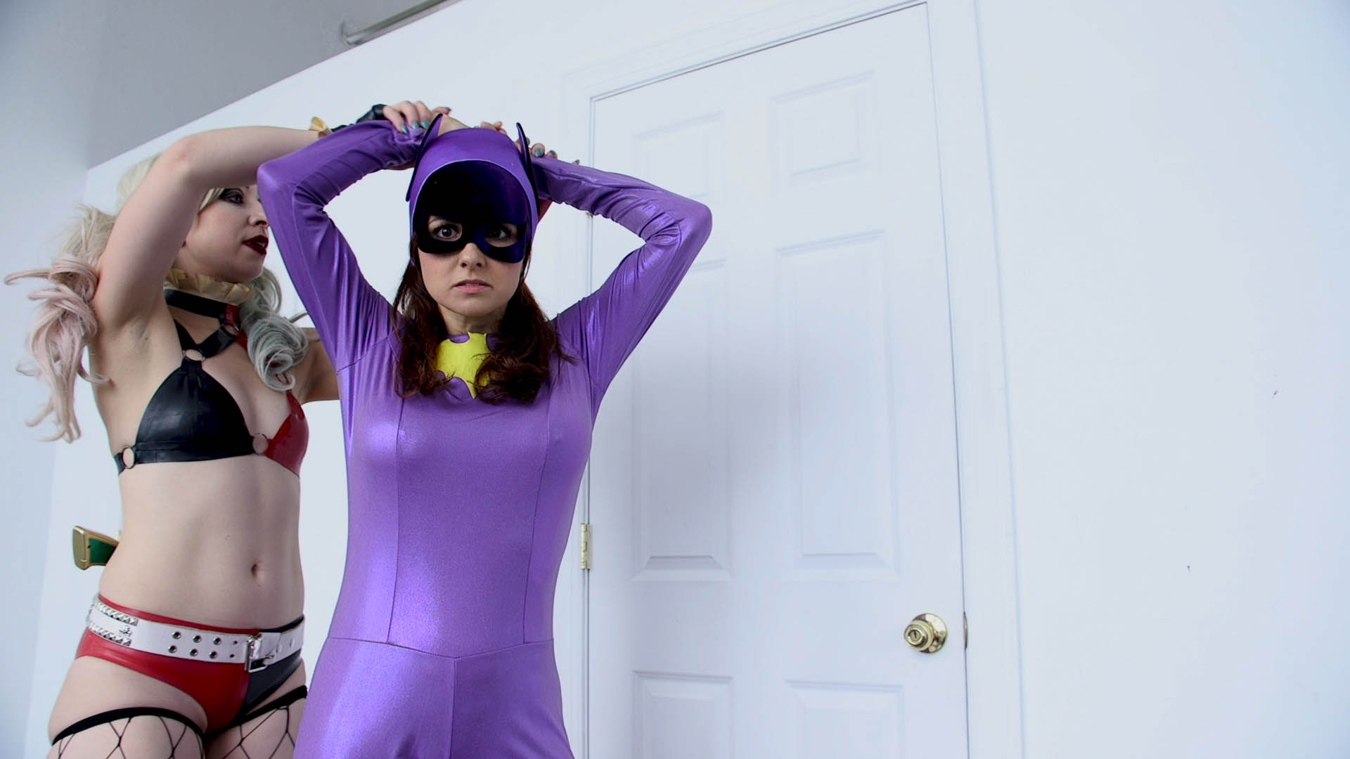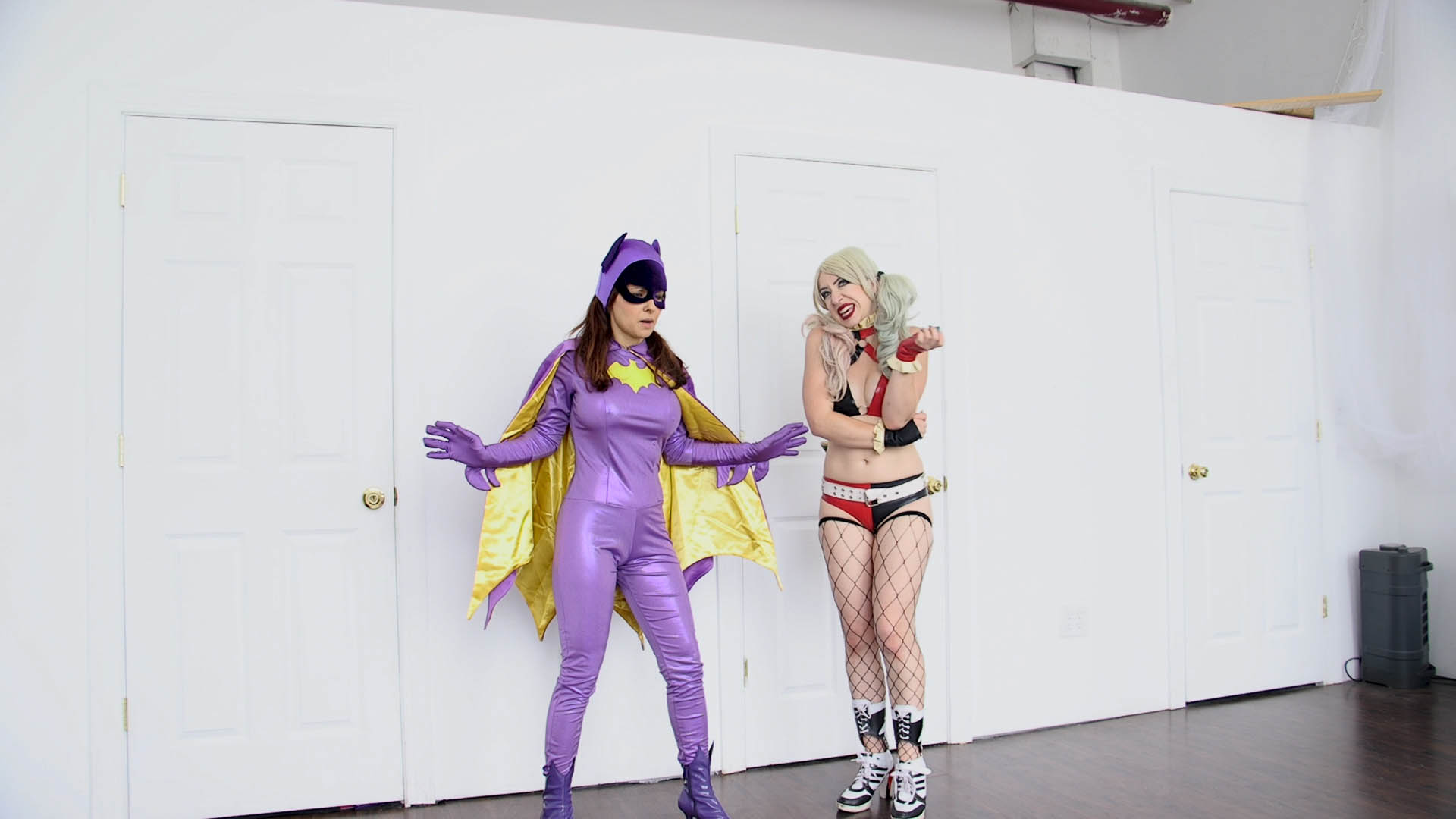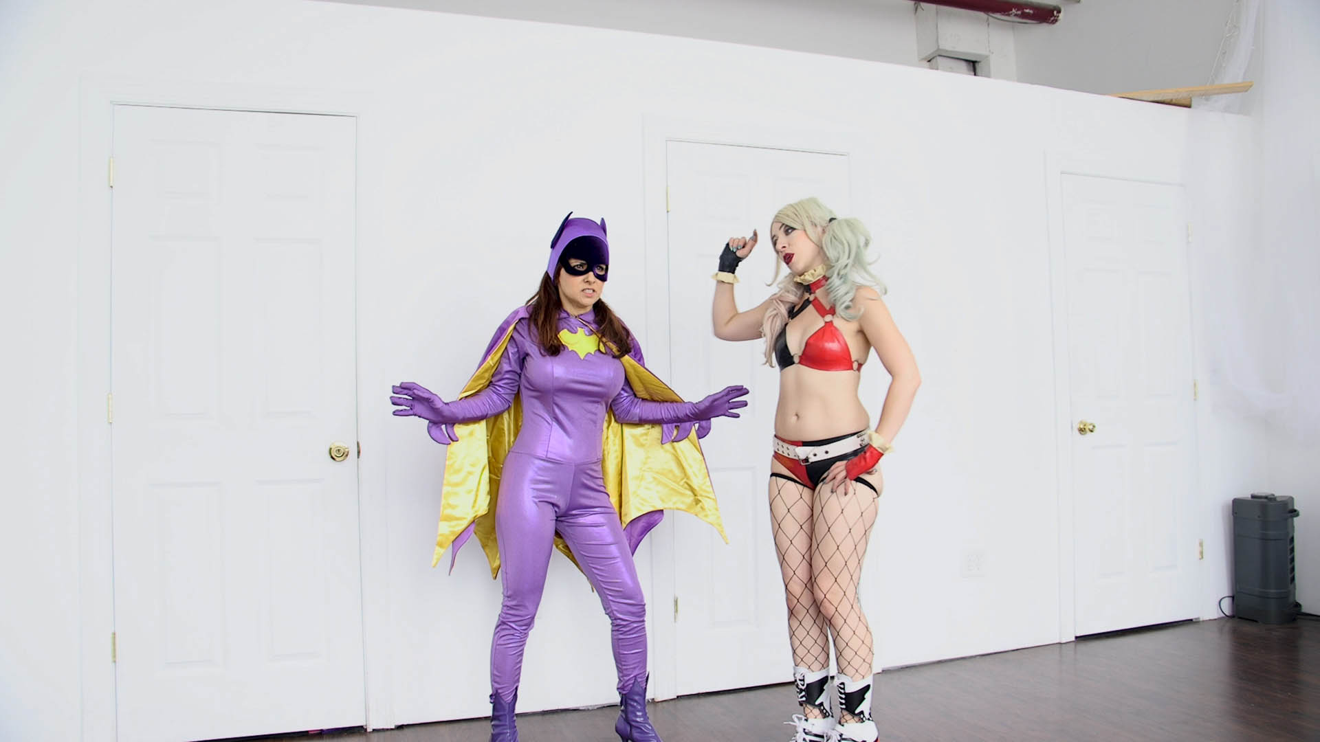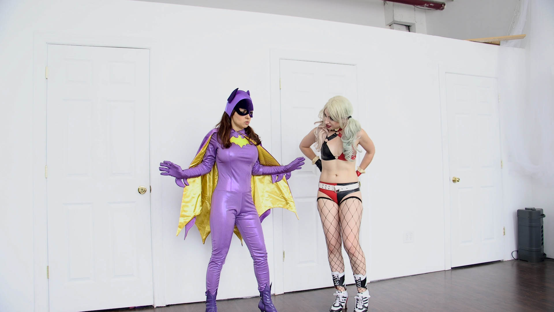 Batgirl (Hannah Perez) has just found herself defamed and disgraced by a couple of bad guys. She picks herself up and continues her search for justice. What she finds is a naughty Harley Quinn(Lydia Lael) with an evil agenda. Harley uses a freeze device to turn Batgirl into a perfectly still statue, whose only remaining body control is to dart her eyes back and forth occasionally. Harley takes this opportunity to further humiliate her damsel, by posing her in various positions and stripping her of her costume. Several times does Batgirl snap out of it, only to be defenseless against Harley’s incessant attacks. She continues freezing the superheroine in place, eventually putting her under a spell that subdues her. Her new state of compliance makes it easy for harley to finish the job, stripping her out of her Bat suit, knocking her out and leaving her a naked heap on the floor.