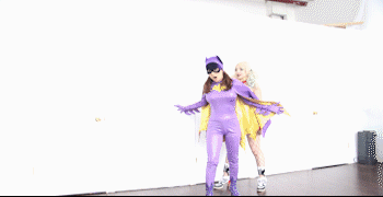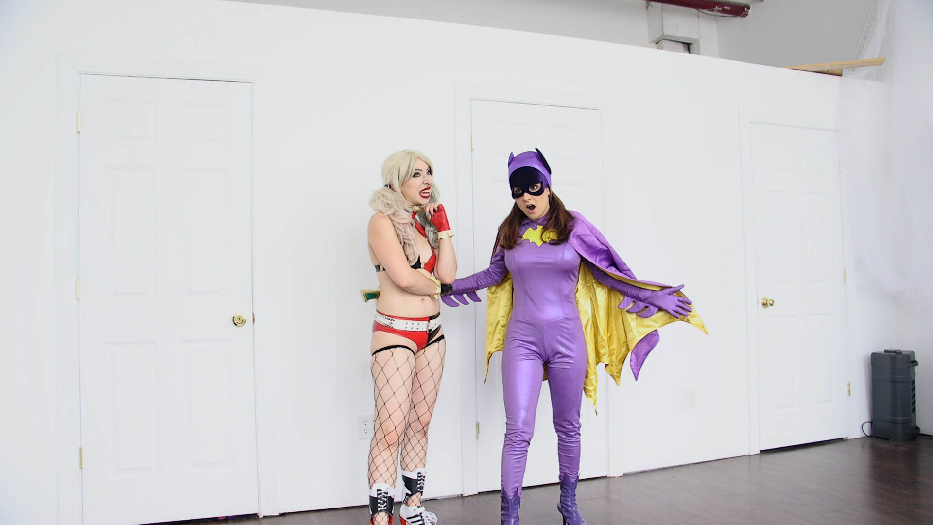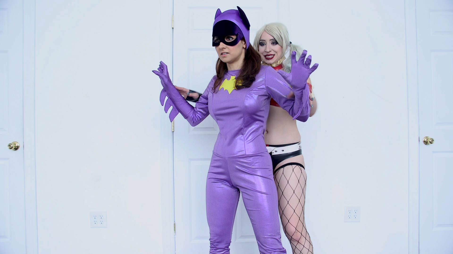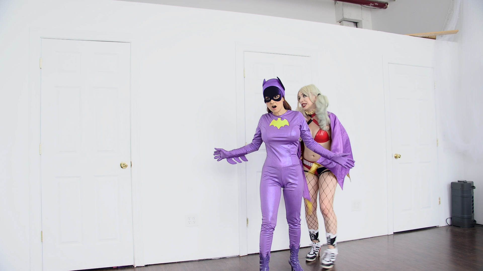 Batgirl (Hannah Perez) has just found herself defamed and disgraced by a couple of bad guys. She picks herself up and continues her search for justice. What she finds is a naughty Harley Quinn(Lydia Lael) with an evil agenda. Harley uses a freeze device to turn Batgirl into a perfectly still statue, whose only remaining body control is to dart her eyes back and forth occasionally. Harley takes this opportunity to further humiliate her damsel, by posing her in various positions and stripping her of her costume. Several times does Batgirl snap out of it, only to be defenseless against Harley’s incessant attacks. She continues freezing the superheroine in place, eventually putting her under a spell that subdues her. Her new state of compliance makes it easy for harley to finish the job, stripping her out of her Bat suit, knocking her out and leaving her a naked heap on the floor.