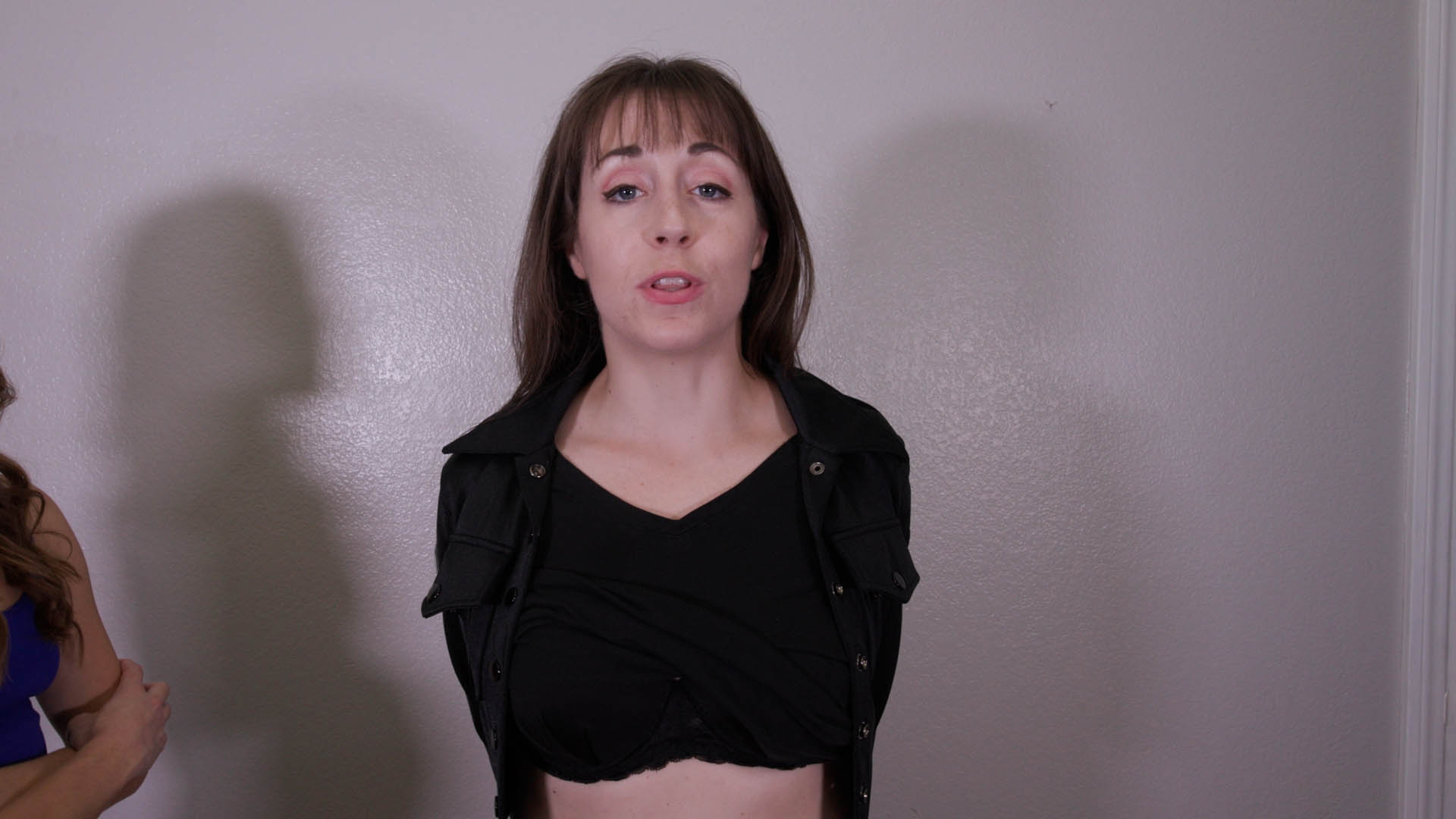Office manager Katie Kush sits at her desk wearing an outfit that exposes her belly button. She stretches her arms over her head when Jenna Noelle (her cop friend) enters. She has to arrest Katie as it is now illegal to expose your belly in public. Katie understands and asks Jenna to handcuff her and let her make a speech in front of her employees. Jenna thinks it’s a great idea and wants to help her with the speech. She untucks her shirt exposing her belly and takes her heels off. She tells Katie to handcuff her and gives a speech. Katie tickles Jenna’s belly before removing her handcuffs. She then puts her hands up as Jenna tucks her shirt back in. Jenna frisks Katie, tickling her, removes her belly button piercing and handcuffs her behind her back. She frisks Katie again and walks her out. Katie gives her speech in front of her employees and is walked away.