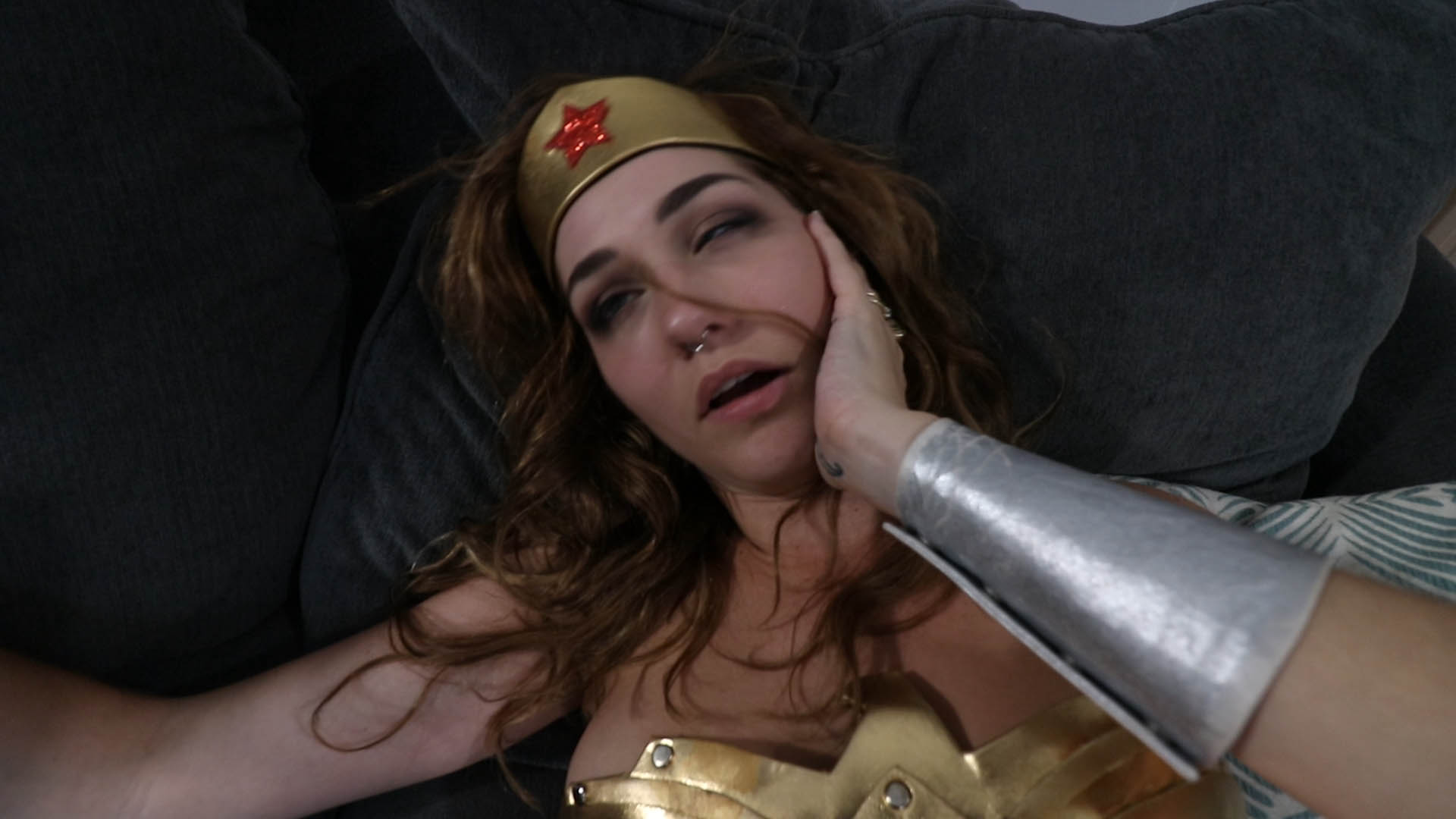 Wonder Woman Skye Blue entered a house being told it was haunted. Skye had to find out the hard way when she started getting hit by something that she couldnt see. Skye tries asking the evil spirit not to do this but it keeps attacking her. Skye’s super powers wont help her in her pleas to ask it to stop. Skye continues to get beatdown and she has no chances to fight against the evil spirit.