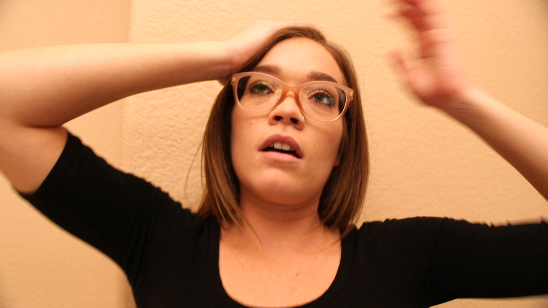 Cadence, Katie and Valentina sit at a table, heel popping. They talk about a plan to sell weapons to Italy and laugh. The doorbell rings and Valentina answers the door. A man (Ray) has a picture of Valentina and has a love crazy look on his face. She invites him in, walking away strutting like a model. The man trips all over himself. The girls play tug of war against the man, with weights tied to the rope. They all pull, but he lets go of the rope. The lights go out, a bunch of loud noises are heard, and the lights turn on. The weights slipped off the rope and flew up in the air. The girls look up, as a weight hits and makes Cadence go down, then Katie, then Valentina, who falls on top of the other two. The rope is tied around them, and their heels are off to the side. They moan and groan. Valentina and Cadence talk in Valentina’s room. Cadence is mad at Valentina about failing, and she begs for another chance. The man knocks on Valentina’s door, and she opens it. He scoops her up in his arms and walks backwards. Valentina gets stuck headfirst in a washing machine. She dangles her legs, moans and groans, and her heels fall off. The man goes to Valentina’s bedroom for drinks. She answers the door naked and invites him in, flirting. She prepares drinks. He sits on bed, and then grabs the drinks from her. She has a shocked look. The man punches Valentina’s arm, then elbows her in the stomach and steps on her bare feet. She hops up and down and stumbles back into a computer chair. He accidentally spins the chair around. When it stops, Valentina gets up and wobbles all over. He picks up the dish with the drinks on and hits Valentina in the head. Katie and Cadence come into the room, as Valentina tries to get up. They make him leave and help Valentina up, who wobbles around. Katie, Cadence and Valentina are at the bottom of the stairs, ready to leave. The man appears at the top, holding something dangerous. The man loses balance, and the lights go out. The girls throw their hands up and scream, and he crashes onto them. They girls heels are to the side, and they moan and groan.