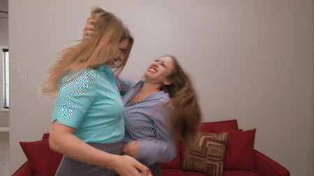 Immediately both ladies are tearing each other down onto the couch (bed). These wildcats are very tightly crossing their 4 Legs here. With crossed legs both are deeply snatching underneath each other’s partly opened blouses. Finally, both are going down onto the floor. While again savagely pulling hair both are very tightly cat balling in full dresses all over the carpet for a long time.