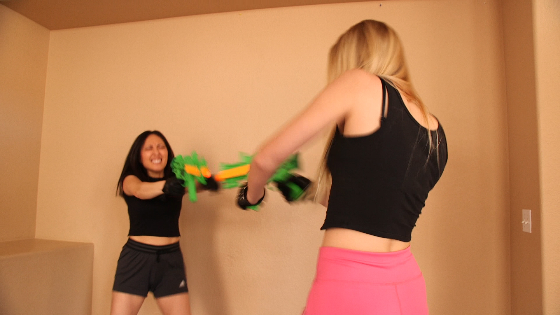 Jolene Hexx & Sumiko Dreams in mini scenes with Gloves, Forearm hair, Machine guns, lots of shaking and overkill.