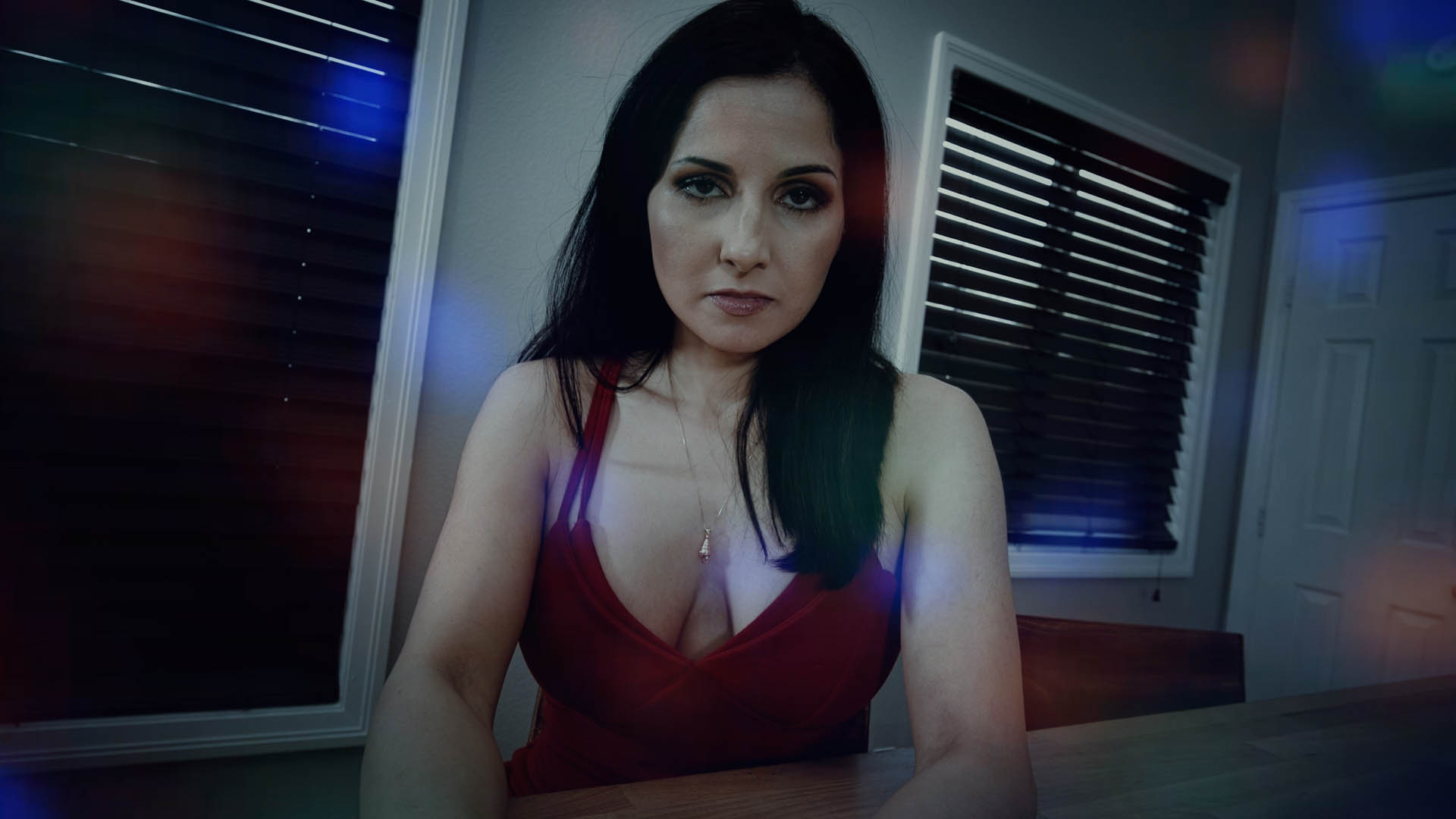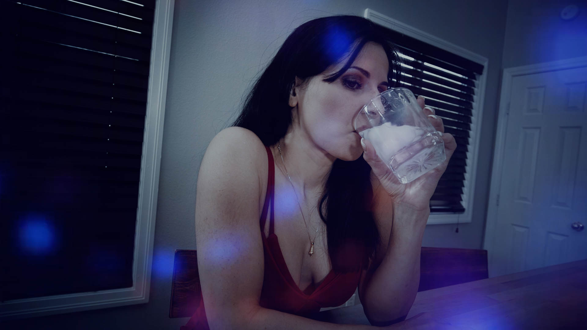 Now at his house, she stands up, turns to the camera and undresses, revealing she’s wearing nothing under her dress, but keeping her heels on. She shows off her body (tits, ass, legs) while repeating mantras. She then gets down on her knees, opens her mouth and gives head to POV, grabbing her tits while doing it. She then takes her tongue out and catches cum with her mouth. After this, Hannah slowly gets her mind back, feeling a big headache, wondering where she is. She’s scared, and POV shows her the mind control device, mesmerizing her again.