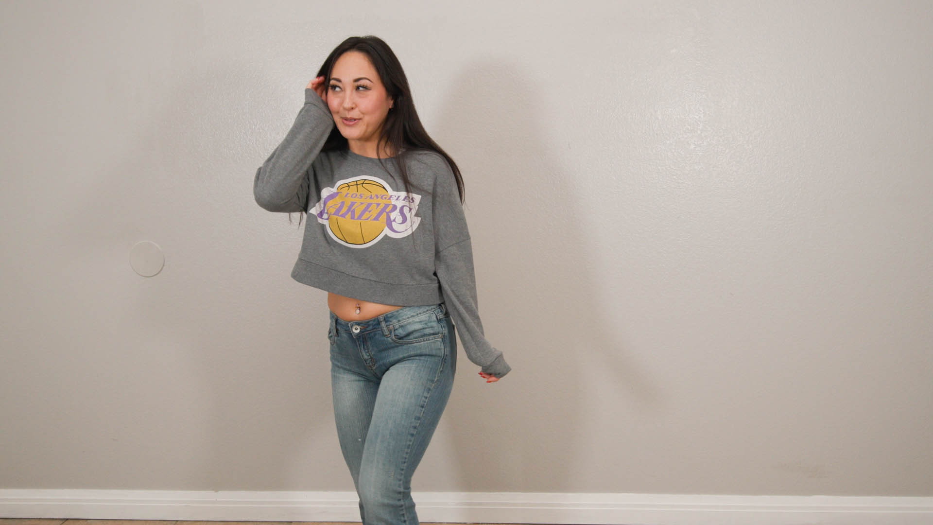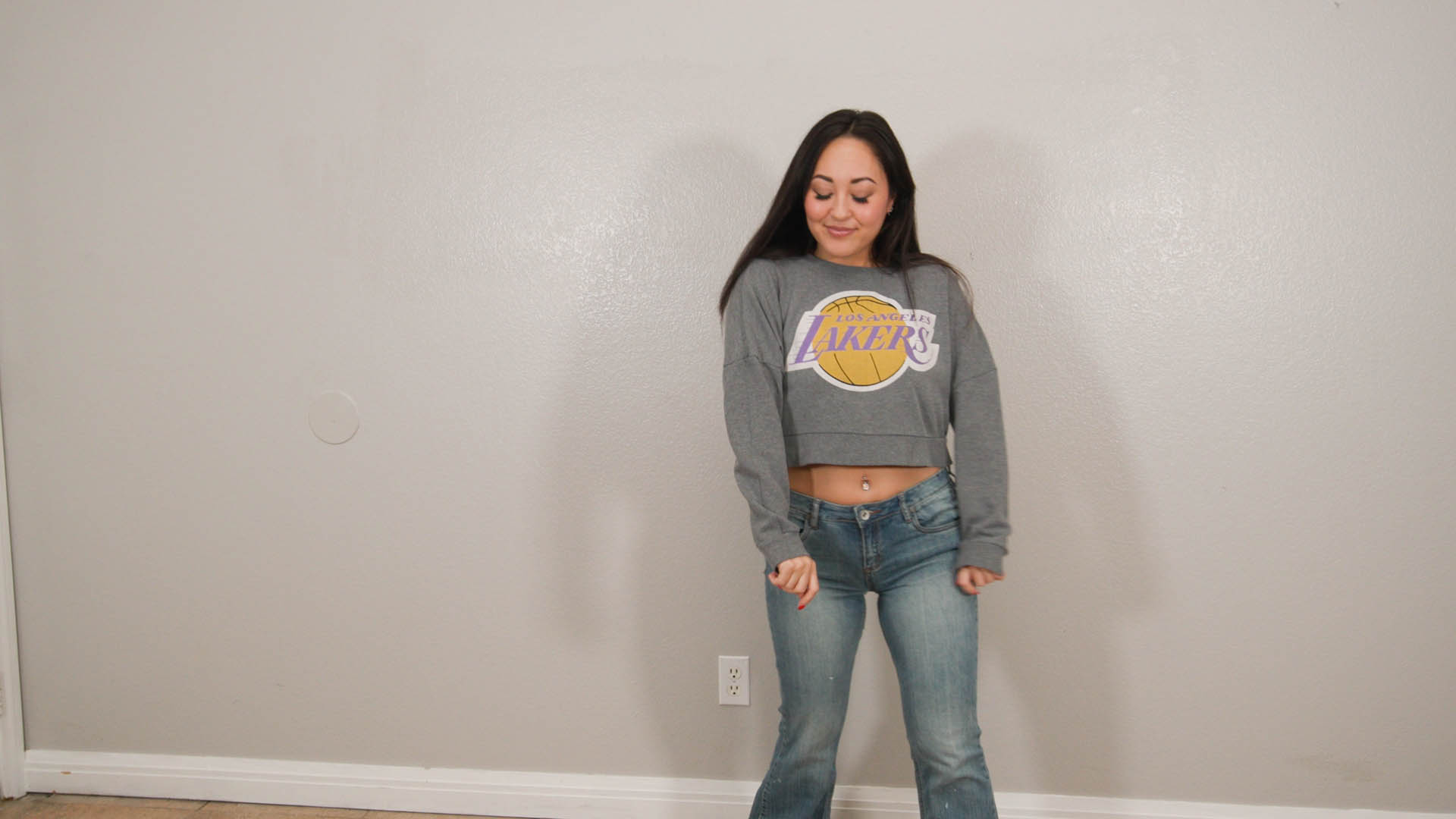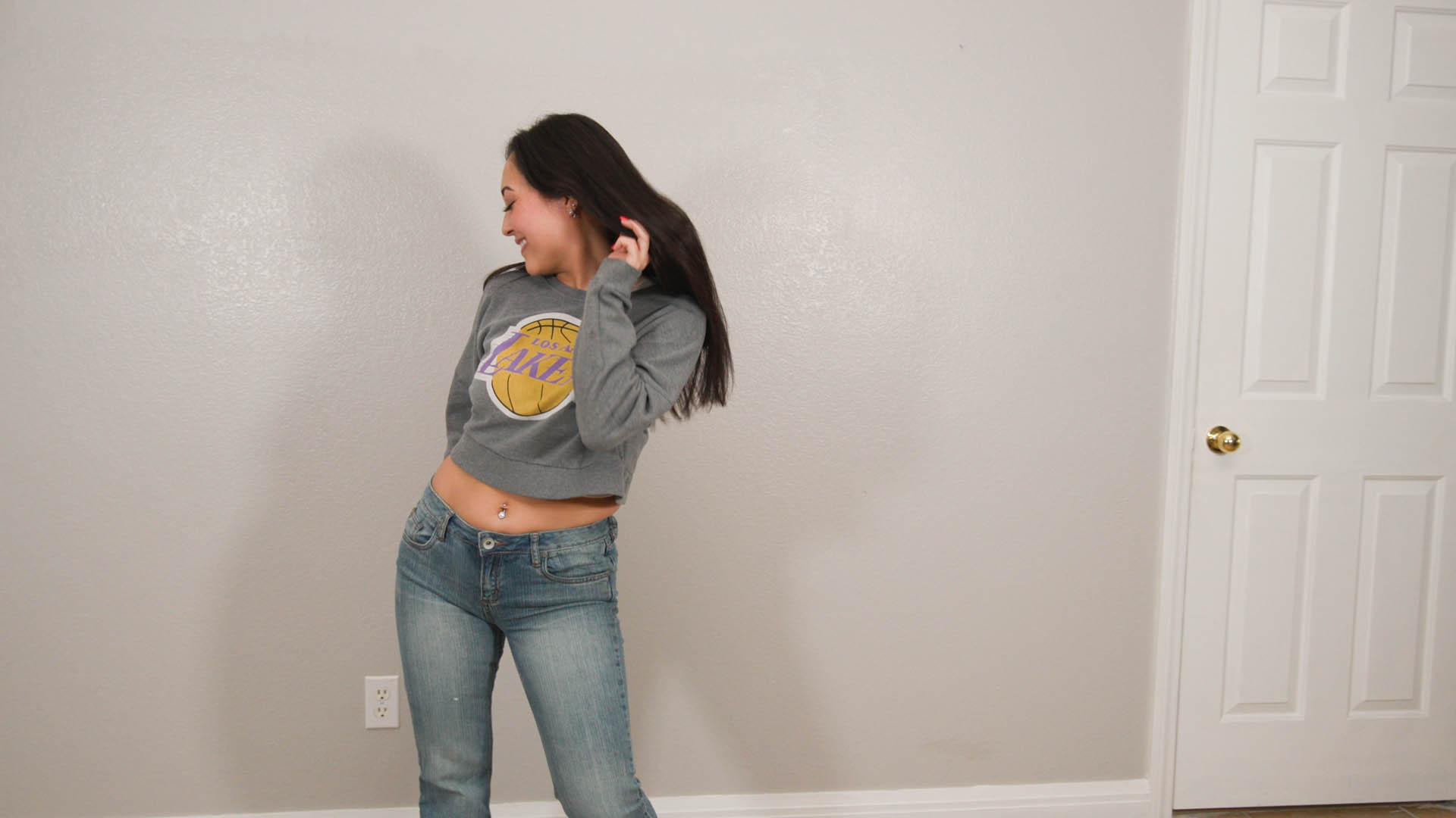 Sumiko Dreams notices a cop she likes but who doesn’t notice her. She walks by him, running a hand through her hair, making her sweatshirt to slightly raise and show her belly, but he doesn’t notice. She does a big stretch, the sweatshirt raises up, fully exposing her belly button, but still no notice. She removes her sweatshirt, revealing a crop top. Cop tells her to put hands up, then do a slow 360 spin. He makes her put her hands behind her head, and she asks to be handcuffed behind her back. Cop frisks Sumiko, focusing on her belly and feet. He handcuffs her behind her back, then tickles/pats her down. She asks him to remove her belly button ring, and finally he walks her away to jail.