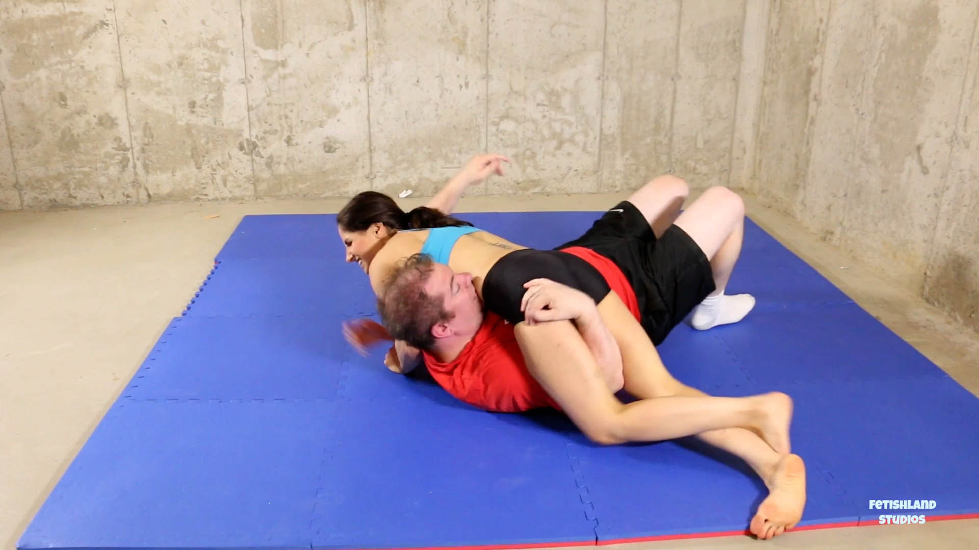 This is (part 2 of 3) a real wrestling session with Hannah Perez vs. male. She keeps things light and fun while making sure to demonstrate her superior strength and grappling skills!