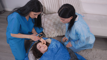 Ama Rio is unconscious and naked inside a zipper-closed sleeping bag on the floor. Hannah walks in on the phone, followed by Nadia White. She explains what’s going on with Ama. They check her pulse and pupils. Nadia gets a stethoscope, unzips the bag, and prods Ama’s breasts. She applies a syringe to her arm, then Hannah zips the sleeping bag up. Hannah leaves, and Ama has a breathing attack. Hannah runs in as Ama goes fully unconscious. Hannah checks her pulse, then gives her chest compressions as Nadia gives her mouth-to-mouth. Hannah checks her heartbeat as Nadia checks her pupils. Hannah grabs a set of AEDs, unzips the bag exposing her chest and stomach, and attaches the pads. They step back and shock her several times. They do several cycles of compressions and mouth-to-mouth. Hannah pulls Ama’s arm out of the bag to check her pulse, as Nadia gives her mouth-to-mouth. They check her pupils and heartbeat, then fully unzip the bag, exposing Ama’s full body. They kneels on the right side and do several cycles of compressions, mouth-to-mouth and AED shocks. Nadia places Ama’s arm back to her side, as they do several more cycles. They check her heartbeat and pupils. Nadia applies a syringe to Ama’s ankle, then Hannah removes the pads. Hannah applies two syringes to Ama’s chest, then continue with sets of compressions and mouth-to-mouth. Nadia moves Ama’s arms above her head, and they do more sets of compressions and mouth-to-mouth. Nadia stops and announces they lost her. Hannah stops doing compressions. They check her pulse, heartbeat and pupils, and Hannah lists the time and cause of death. They remove their gloves, place Ama’s arms back to her side and cover her face with a cloth. They zip the bag up, grab their supplies and leave.