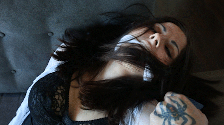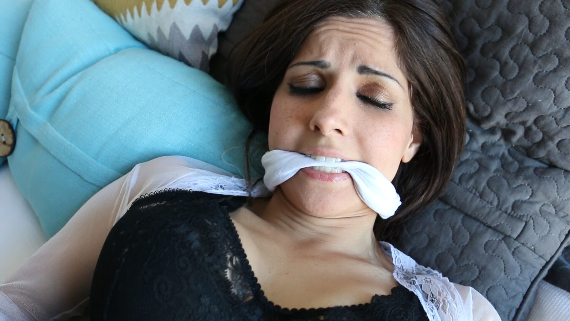 Back in the bedroom, you pull Hannah’s cleavegag back into place. She wiggles and works herself free from the ropes. She motions to you to hand her some tape. She tapes up her mouth and gets you to lay down on the bed. This is the part you’ve both been waiting for! She mounts you and takes a ride, finishing off at the end. You rag her out one last time. Then you flip her over onto her stomach and begin the game again, tying up her wrists and ankles…