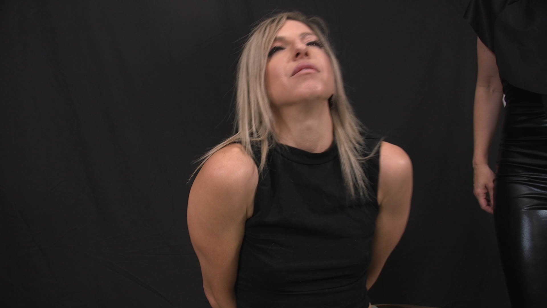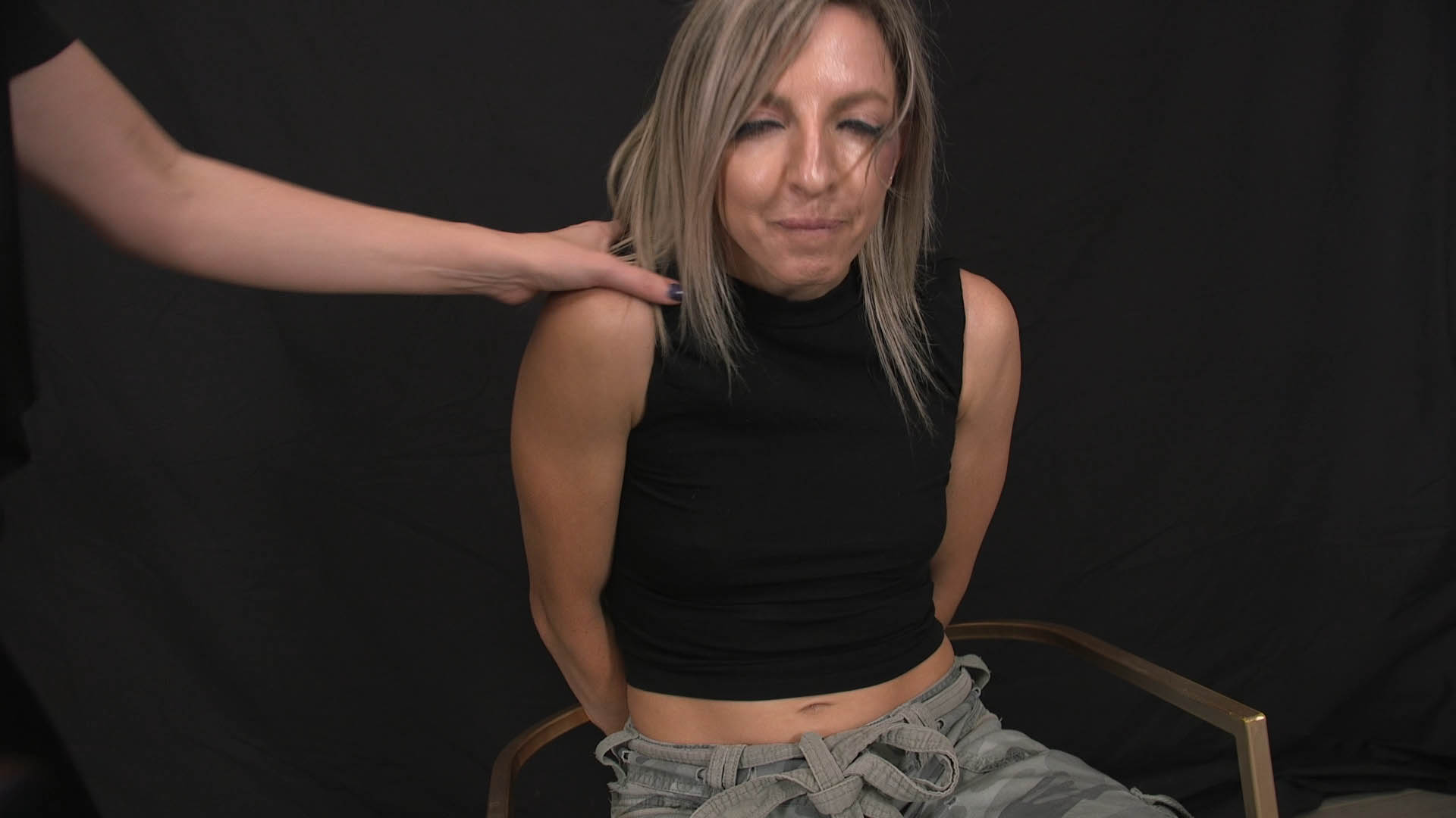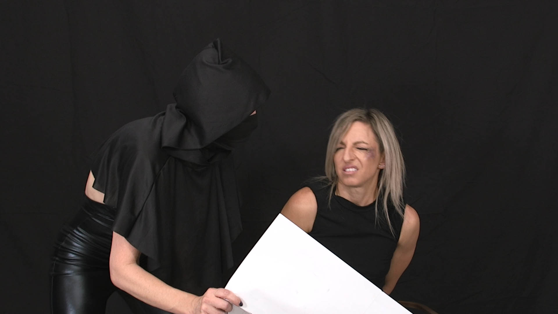 Lora Cross comes to after being knocked out, arms tied behind a chair. Kyla Keys comes out of shadows and pulls out a map. Lora shakes her head, and Kyla punches her gut, making Lora gag and cough up saliva. Kyla points at map again, and Lora spits on it. Kyla pummels her stomach with punches. Lora struggles to resist at first, and then weakens, almost vomiting. Kyla punches her solar plexus and Lora vomits into a bucket. She doubles over, groaning. Lora spits in Kyla’s face, who punches her solar plexus. Lora vomits loudly and faints.
