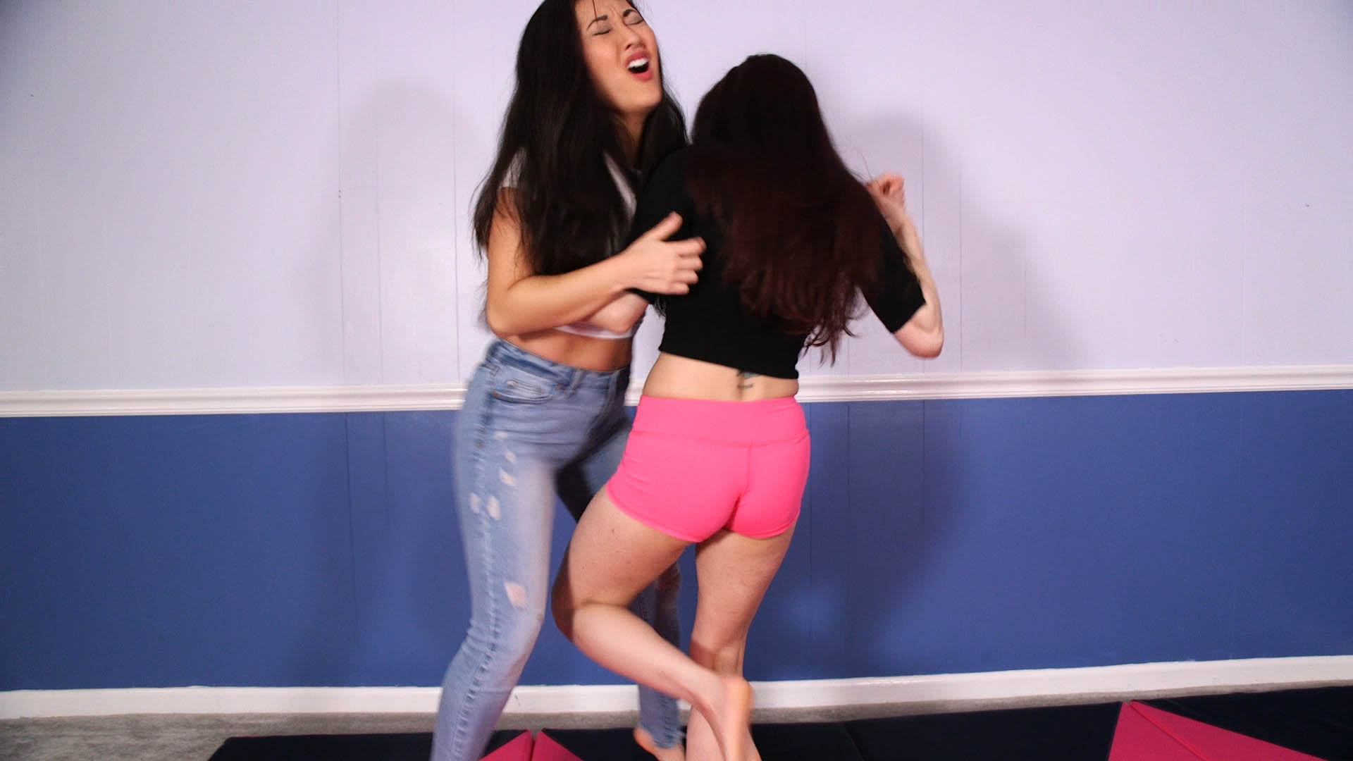 The scene opens with Hannah Perez and her drunken roommate (Sumiko Dreams) in fighting stances circling each other. Hannah warns Sumiko she’s in no shape to fight and it’s not a fair contest, but the belligerent and drunken woman stumbles forward to fight anyway. At this point, Hannah decides to have some fun and playfully kick the aggressive drunk’s ass, specifically focusing on beating up her pussy. Sumiko drunkenly tries to hit Hannah, but Hannah easily blocks or dodges the attacks and cuntbusts Sumiko in return. Hannah actually has fun with it (sometimes giggling) and rocks the sloppy drunk with merciless cuntbusting combos. In the end, Hannah finishes Sumiko off by standing her up, spreading her legs and giving her successive kicks to the crotch until the drunken woman pees herself and passes out.