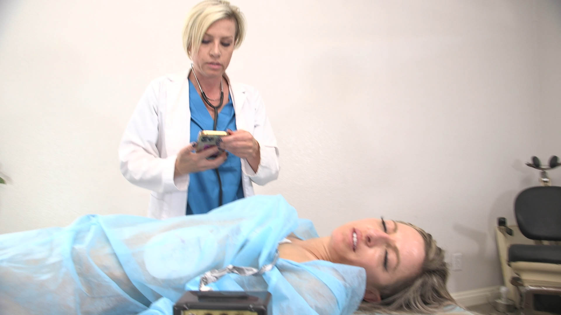 Lora Cross lays unconscious on a table with a set of AED pads attached to her chest. Kyla Keys walks in talking on the phone, frustrated. She checks Lora’s heartbeat and pupils, and says her vitals are deteriorating. Lora starts breathing heavily and Kyla checks her heartbeat, then shocks her. She gives her MTM and shocks her again, until she stops struggling. She hangs up the phone and begins compressions and MTM. She shocks her several times, Lora’s body jumping, and checks her heartbeat. Kyla cuts open Lora’s gown and removes the pads, then applies a fake shot to her chest. She does more rounds of compressions and MTM, before cutting more of her gown down. She continues cycles of compressions and MTM, before fully cutting the gown and leaving her nude. She checks her heartbeat and reattaches the pads. She shocks her several times and performs a round of MTM and compressions. She moves Lora’s arms above her head and continues the cycle. She removes the pads and covers her face with a cloth, acting as a barrier for MTM. She does her final round of MTM and compressions and gets a call. She keeps doing slow, one-handed compressions as she speaks on the phone, until she suddenly stops and looks down.