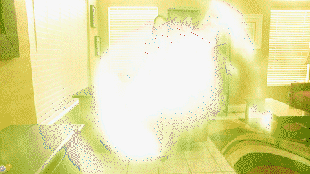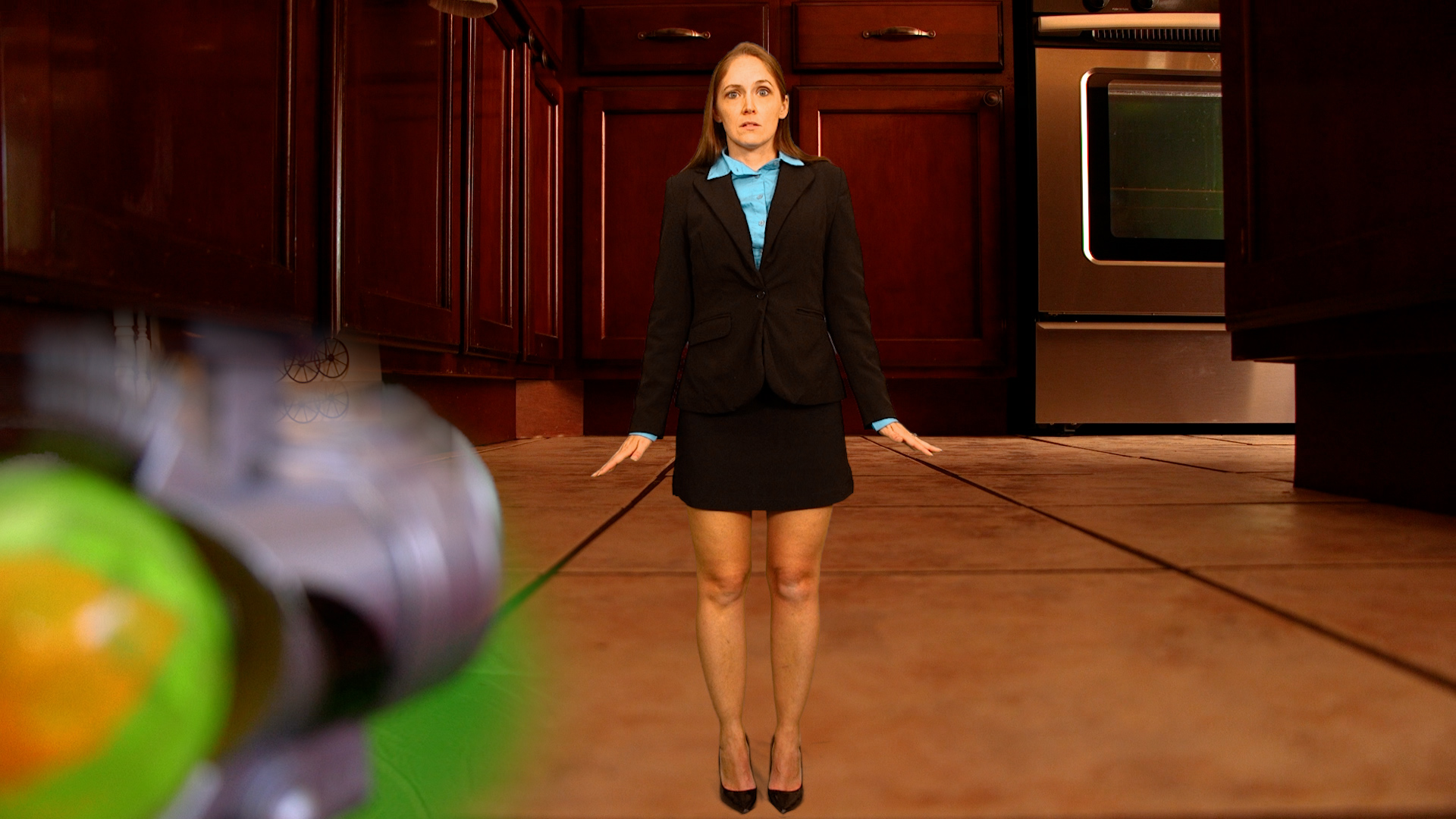 In the house, Gary traps her in a bottle, as she panics. She refuses to divorce her husband to be set free. Gary leaves to get pet food for her. She calls for him, for help, without success. Rachel Adams tries to look for a way out without luck. When she gives up, she hears something. It’s Luigi being sneaky. She tries getting his attention, without success at first. But then he sees her. She asks him to get her out of the bottle, but he is shocked. Luigi gets her out of the bottle, continues to stare at her. She asks him to find the device, hit the reverse switch and shoot her. He does, and she grows back to normal size. She compliments Luigi for finding her and saving her life. They leave.