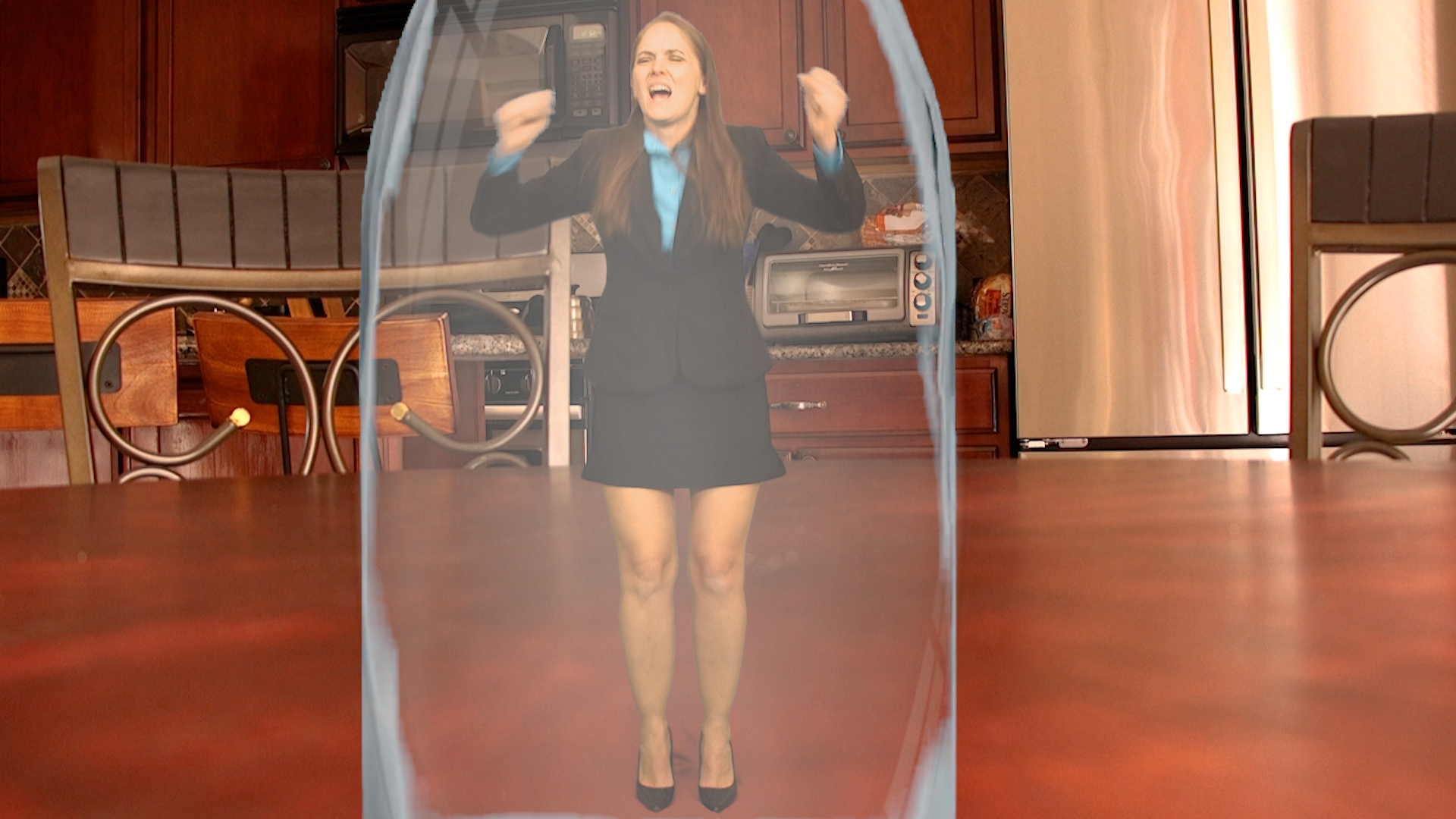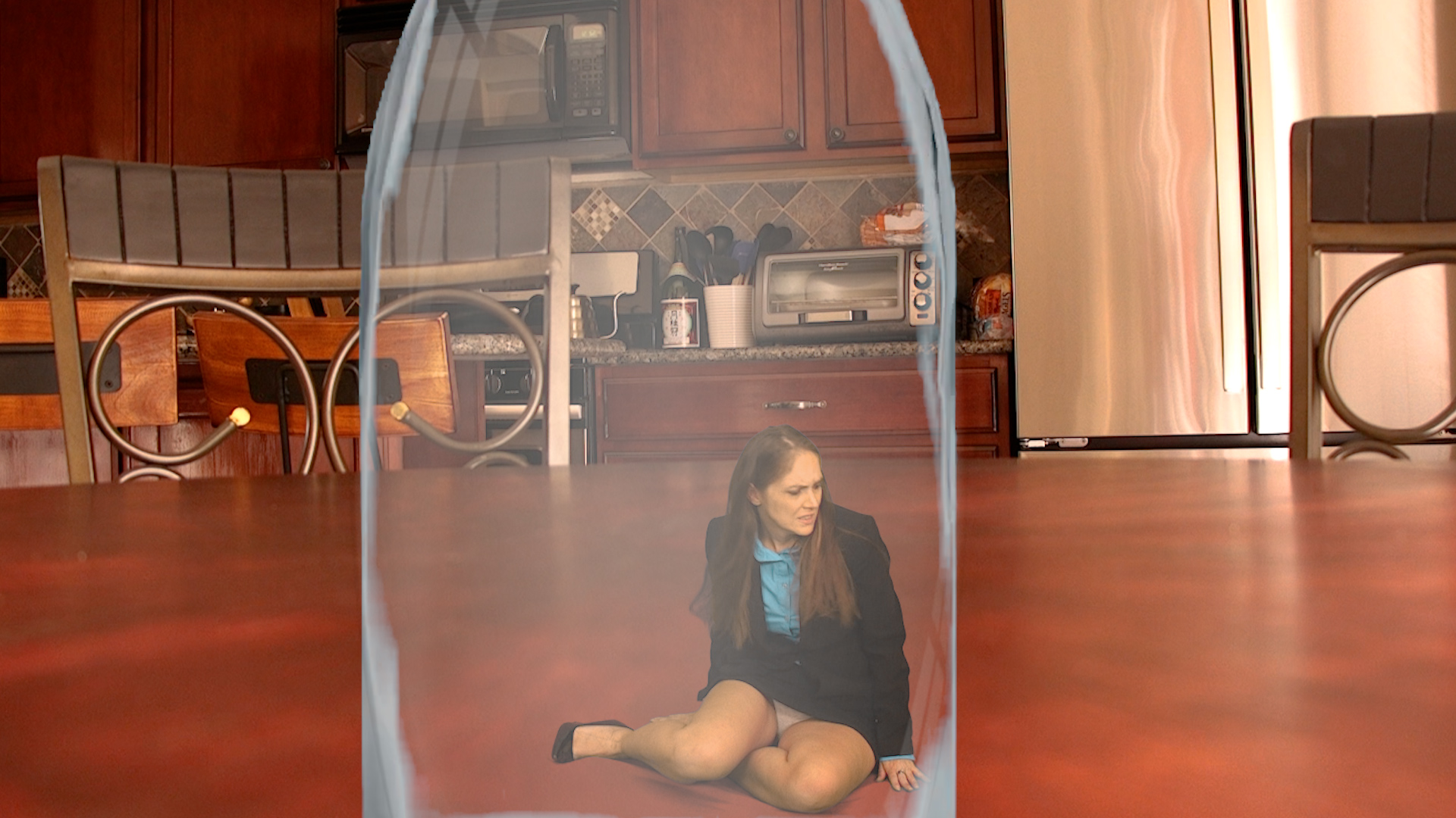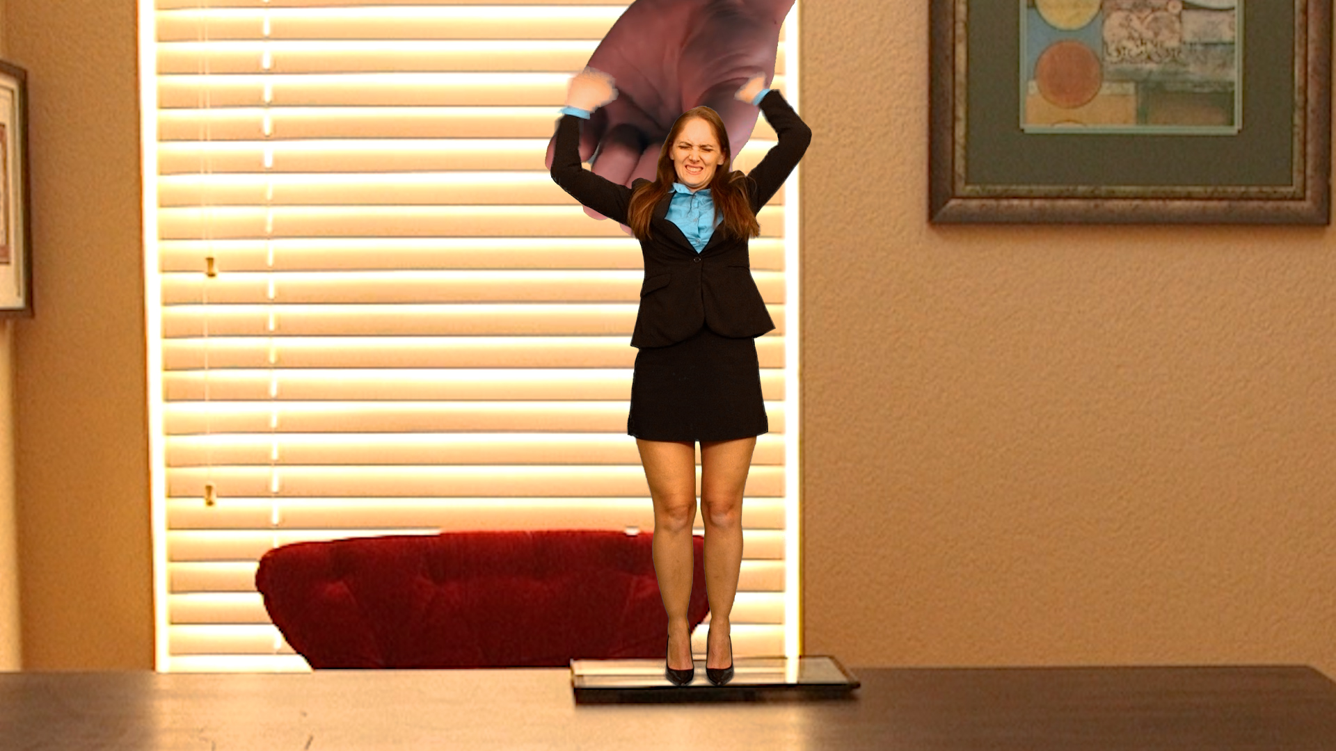 Rachel Adams takes her son, Luigi, to bring your step-son to work day. She’s busy working and he wants to play. He leaves to play with other ones. Gary, an employee, appears. He has a huge crush on Rachel Adams. Rachel Adams fires Gary, and he accidentally asks her out. Rachel Adams is shocked and says no. Gary pulls a shrink ray and shoots Rachel Adams, who begins shrinking. She panics, pleas, begs and demands him to turn her back to normal. She shrinks to the size of an ant, and looks around. Gary picks her up and leaves to go to his house.