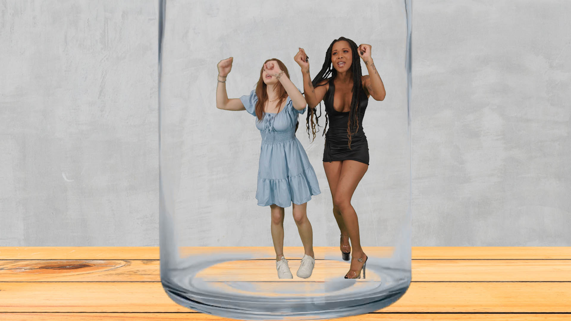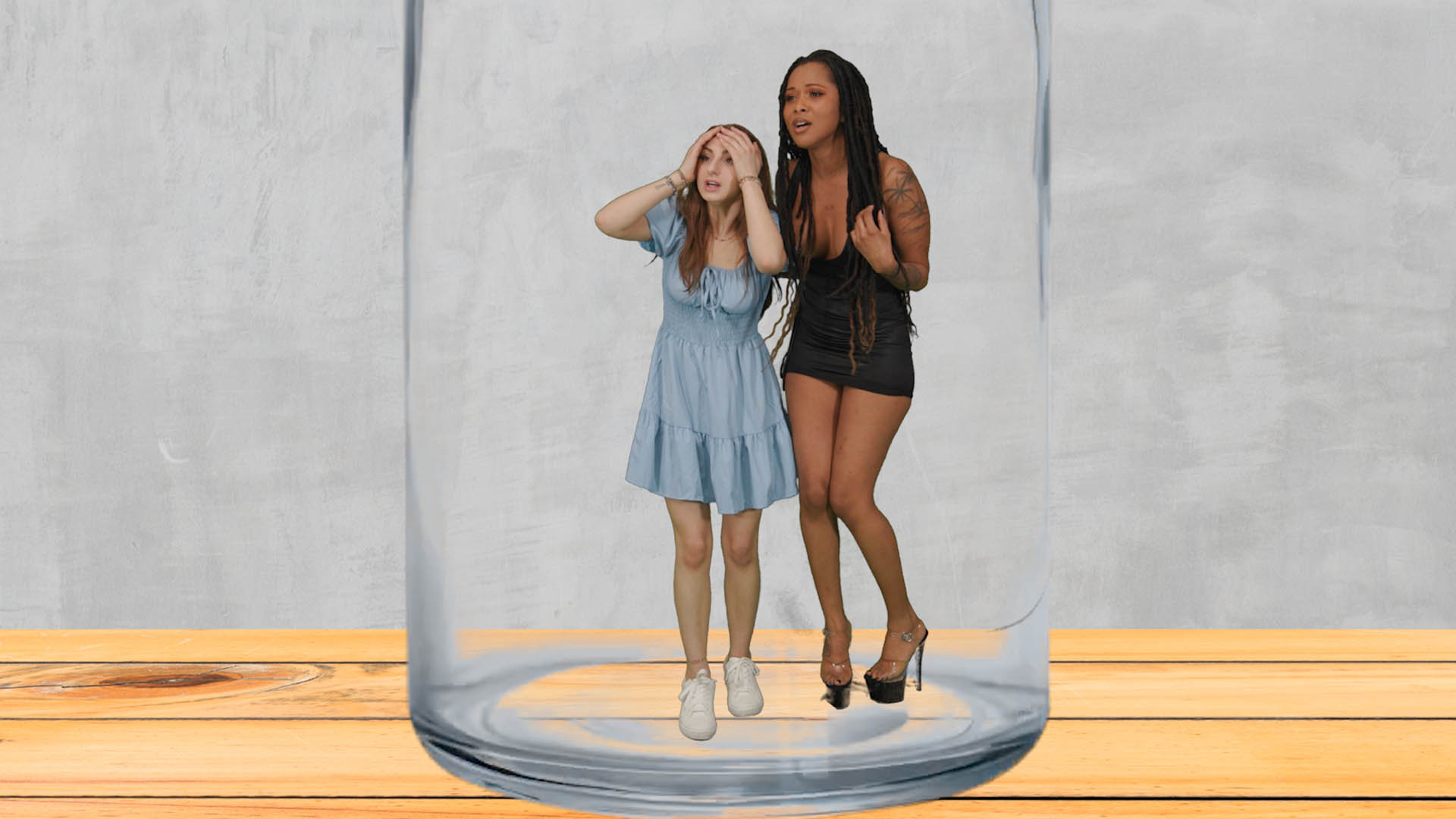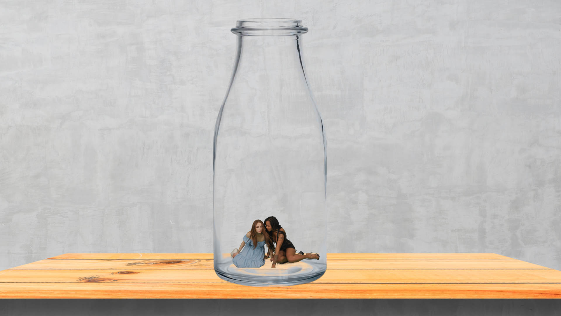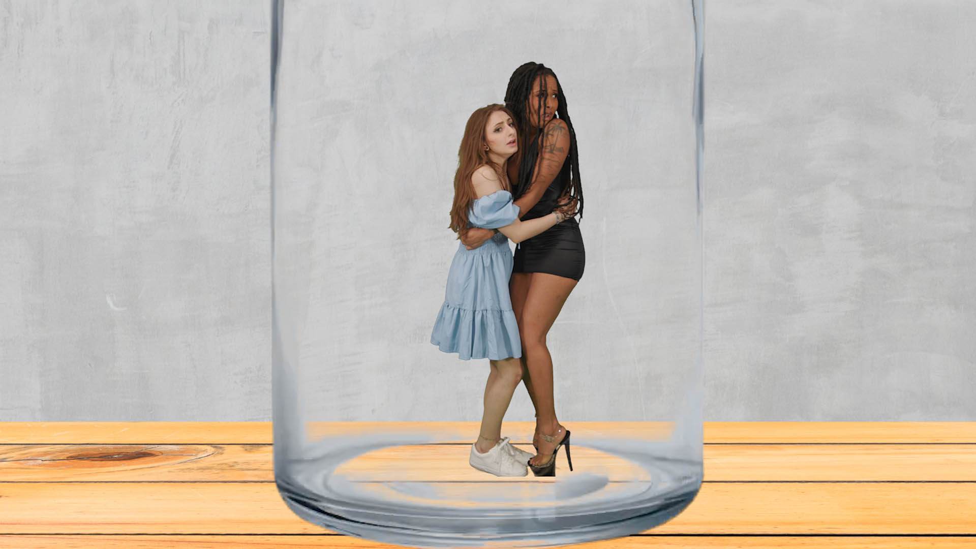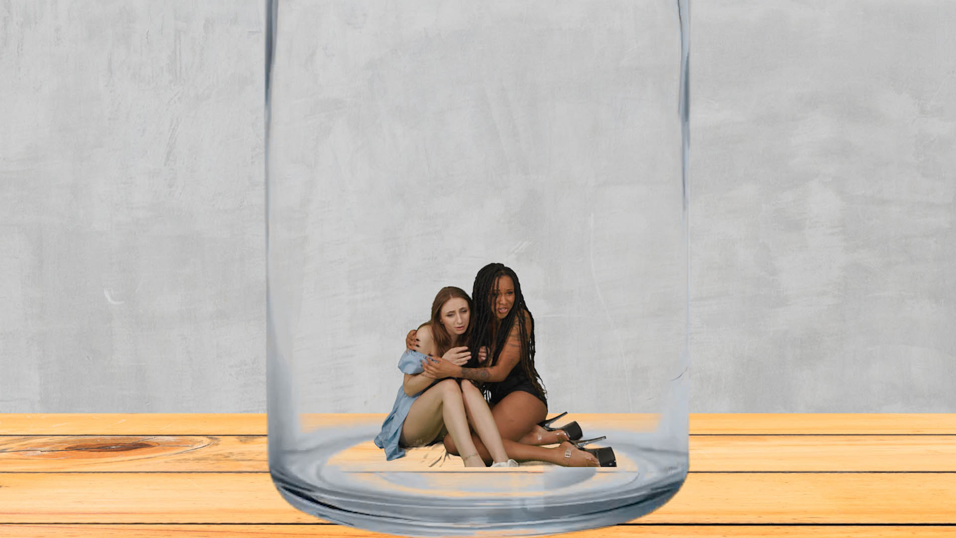 Luna Eclipse and Penelope Kay wake up in a place they don’t recognize, trying to remember what happened. They see their coworker Brian and ask him. He pulls out a shrink ray and shrinks both of them, which makes them scared. They beg and plea to be made back to normal size, but he refuses. He traps them in a bottle, and they both squirm. Brian leaves. Luna and Penelope try to find a way to escape, to no avail. Then they see their coworker and best friend Jake enter. They explain what happened and he lets them out of the bottle. He find the shrink ray and reverses their size. They are extremely grateful and flirt with him. They go to a house to call the cops, and they both agree to be Jake’s girlfriends.
