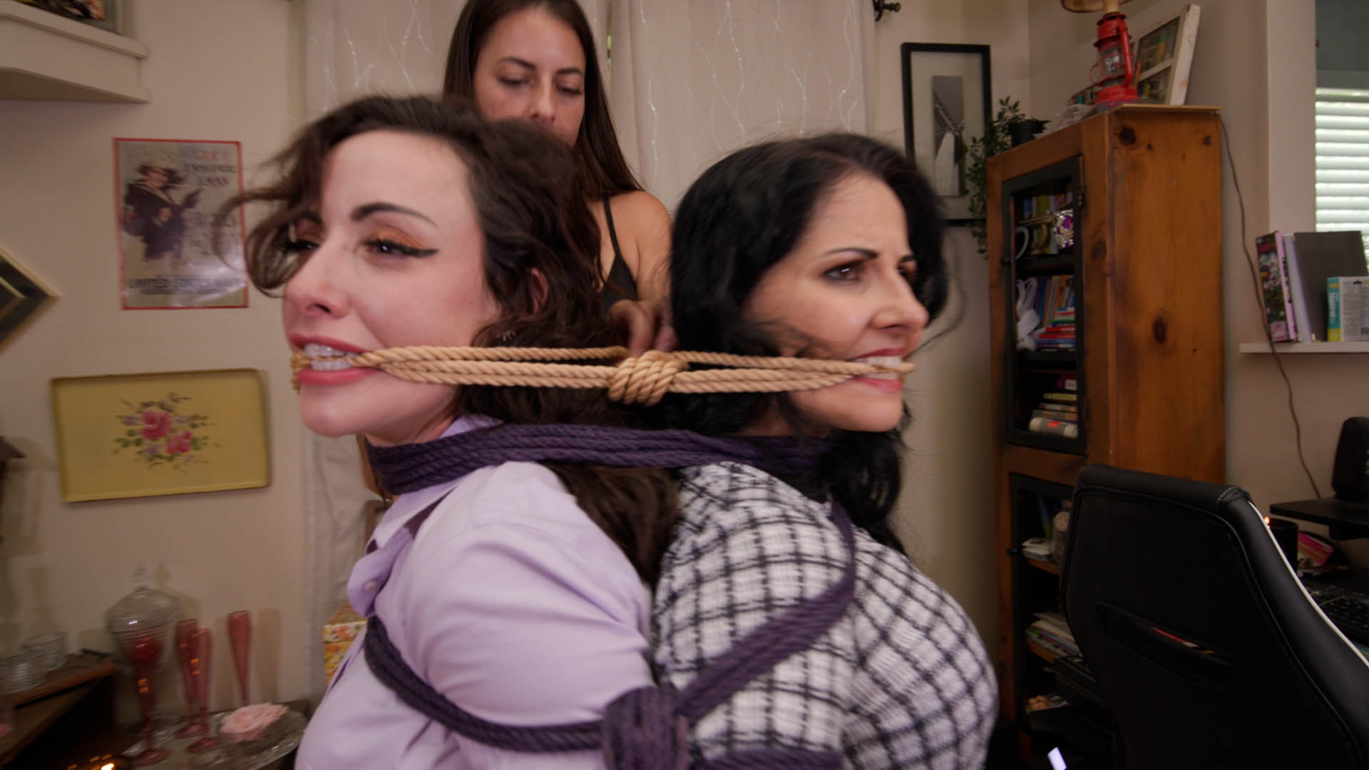 Hannah Perez and Ama Rio are bound back to back, discussing how they were kidnapped and will be sold overseas. Hannah is into the idea, but Ama is defiant and irritated, blaming Hannah for getting them in this situation. Indica enters, taunts them and a back and forth occurs between them. She gags Hannah and Ama with rope, wrapping it around both their heads to cleave, gag them and hold their heads in place. She binds their knees and ankles with leather straps and then handcuffs herself, explaining they will all be sold together. Ama struggles, but Indica Fetish and Hannah writhe ecstatically.