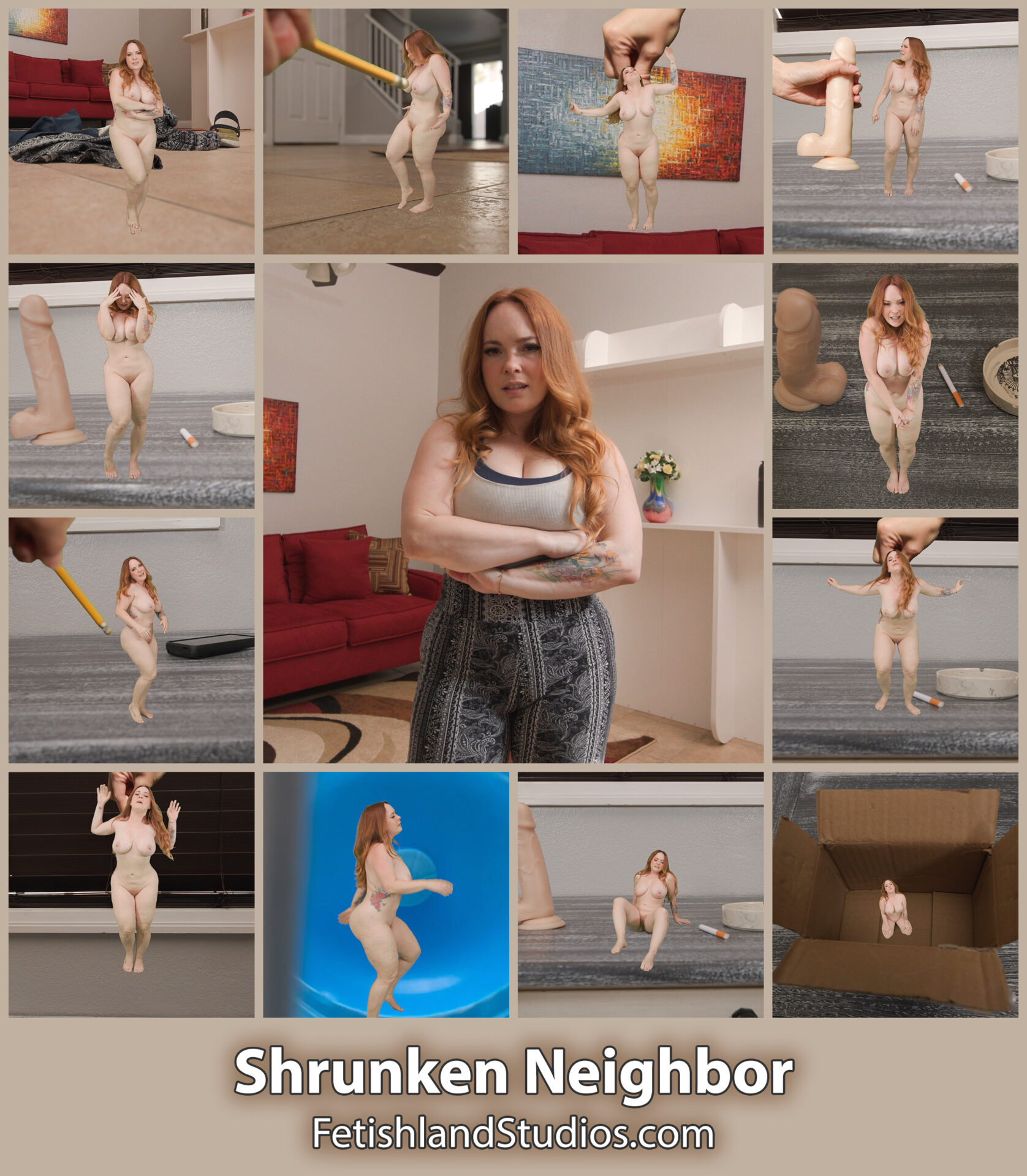 Neighbor knocks on Summer Hart’s door to disturb her. She fires him, wanting to shrink him, but accidentally shrinks herself. Summer is completely naked after shrinking. She sees her giant shoes and dress and realizes she shrunk, and he is surprised to see her and decides to take revenge. She tries to run, but he catches her and takes her in his hand. He touches her body with his giant finger, puts her in his pocket and goes to his house.