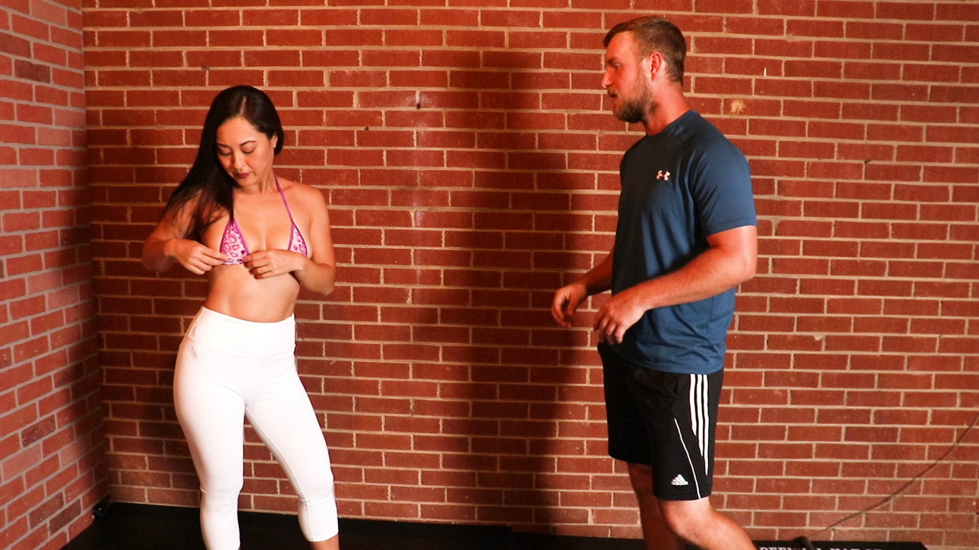 Sumiko Dreams is in a mixed wrestling competition, and the next guy she goes against is pretty cocky. He is sure that going against Sumiko will be a piece of cake. Sumiko is ready to teach this guy a lesson. As the match begins Sumiko undresses down to her tiny bikini. Leaving the man in awe of her as the bikini compliments her body. Sumiko takes advantage of this moment and gets him down. Sumiko makes her way to straddle his chest and she is wondering if that is all this guy has. Well he struggles to get up but she has him then pinned in a schoolgirl pin. Sumiko plans to humiliate this guy and show him that she is stronger. Sumiko face sits front, reverse and a number of head scissors. Sumiko continues to get her points with these moves. With her last point she scores is by front face sit and when she gets her point she grinds into his face. He is out and she is the winner.
