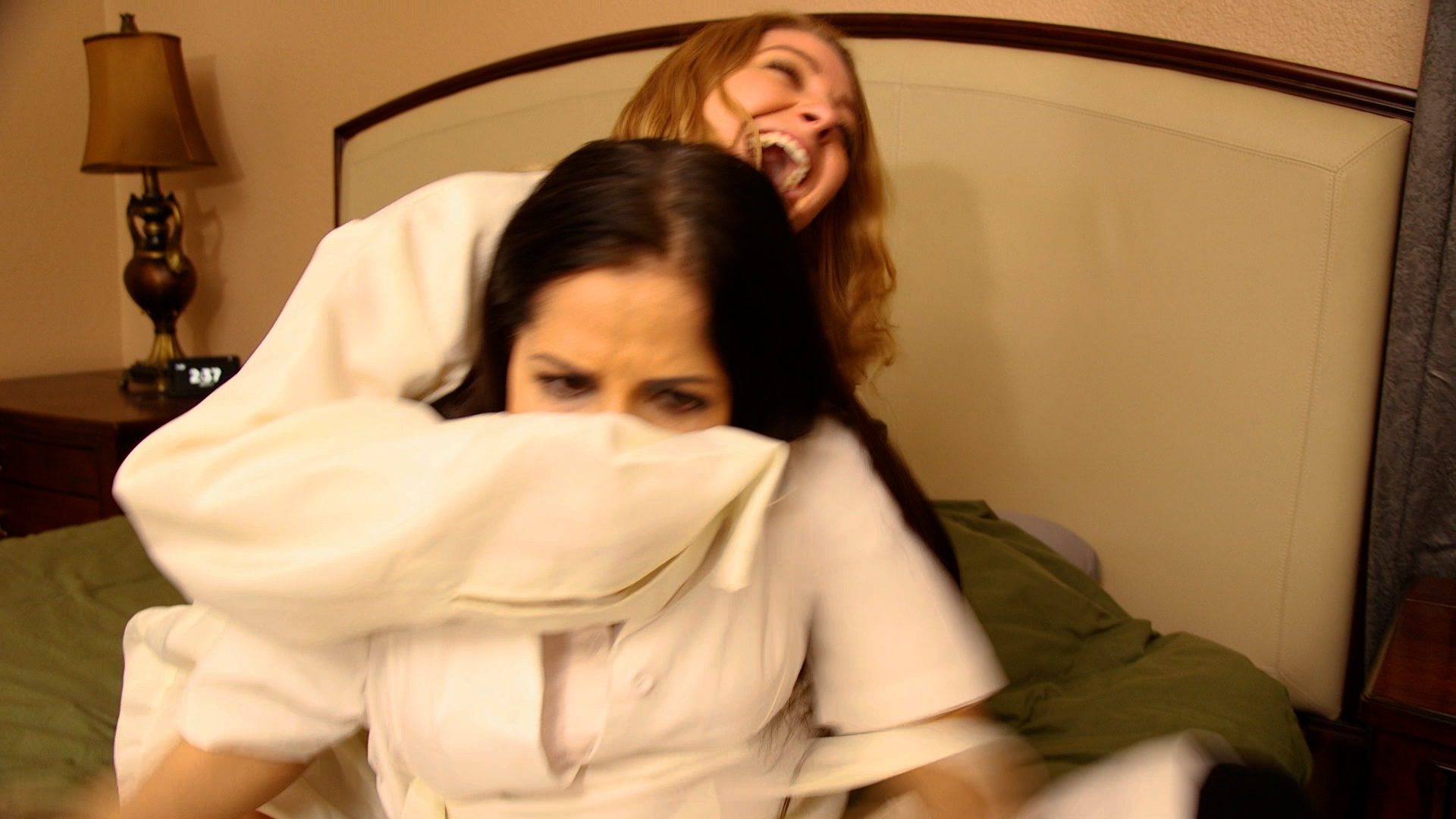 suffocates her with a hand over her mouth. Veronica Weston bends Hannah Perez over the side of bed and strips her