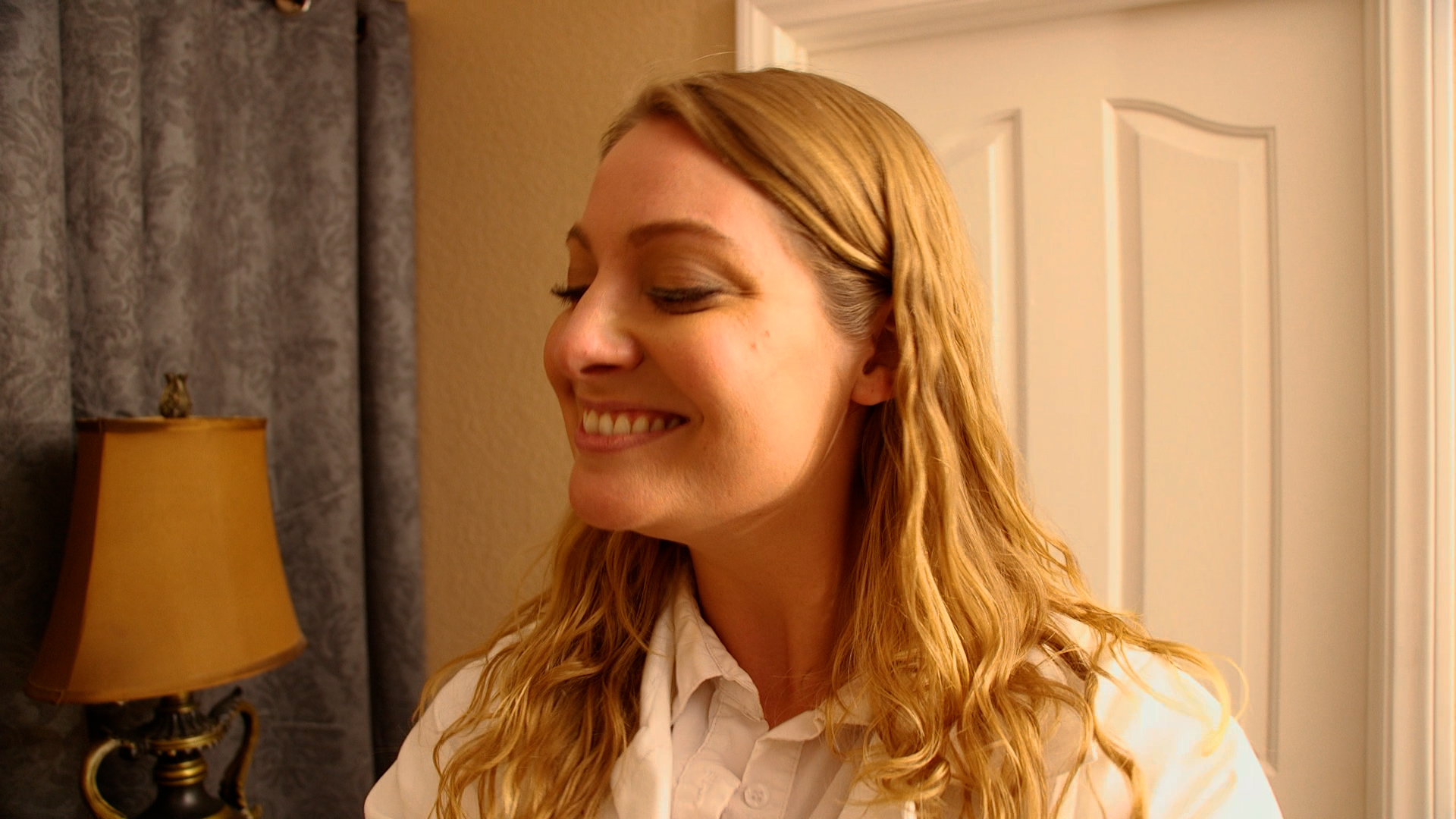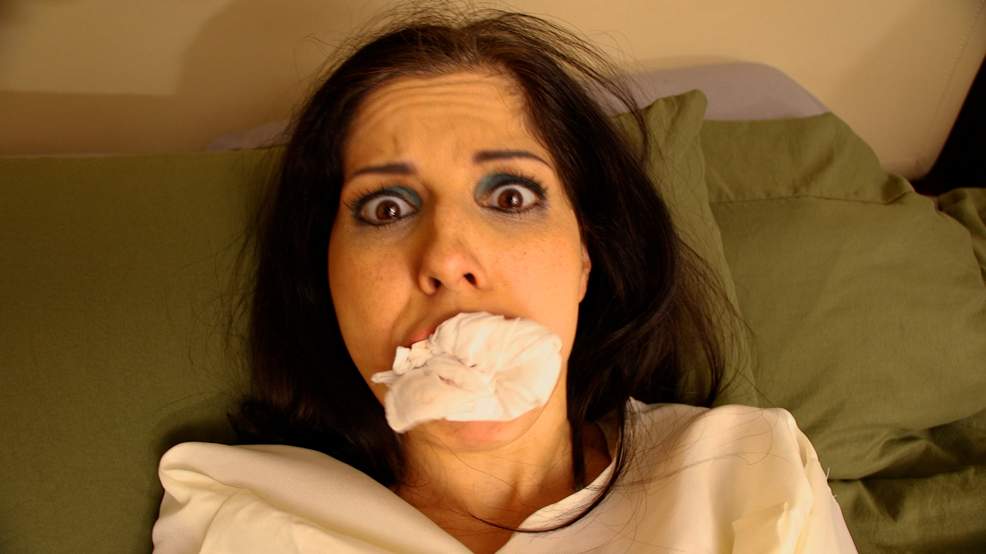 Hannah Perez wakes up while Veronica Weston makes herself ready. Veronica Weston stuffs white rag in Hannah