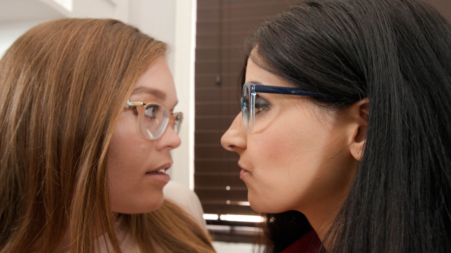 Katie Kush played a college student of Hannah Perez who was the professor. Katie Kush at Hannah’s Delicious office planned to discuss her psychology paper. Hannah Perez decided to give F on her paper which made Katie Kush upset. She tried to clear her point and told Hannah Perez that she did a lot of research and had interviewed real mesmerists. To which Hannah said that those were charlatans and that they weren’t mesmerized just playing along. Katie Kush said that she can prove herself wrong if she agrees to get mesmerized. Katie Kush then asked Hannah Perez to look into her eyes. She forcibly held Hannah Perez’s face and made her look into her eyes. Hannah’s eyelids feel heavy and fell asleep. With a snap of a finger, Hannah Perez woke up. Katie Kush asked Hannah Perez if she is mesmerized or not to which she agrees to tell Katie Kush that she is mesmerized and that she will do whatever Katie Kush will ask. Katie Kush told Hannah Perez that she will put her to sleep for a moment and when she woke up she will agree to whatever a “great idea” Katie Kush would suggest. Katie Kush counted 3 to 1 and snapped her fingers. Hannah Perez woke up and got back to where she started telling Katie Kush that hypnotism isn’t real. Katie Kush told Hannah that it’s hot in the office to which Hannah Perez agreed to strip out of her clothes. Katie Kush then told Hannah Perez to go for a coffee after school. Hannah Perez told that she had planned her evening with her husband. Katie Kush then asked Hannah Perez to tell her husband that she is going to end up her relationship and that she has found her new love in her student. Hannah did exactly the same. Katie Kush then asked Hannah to make out. They made out and then Katie Kush asked Hannah Perez to post a resignation to her job and work as a Hooters to deliver food to a bunch of horny guys while wearing a tight shirt and shorts. Hannah Perez agreed even to give Katie a share of her earnings. Katie Kush then asked Hannah Perez to leave the room naked to meet the dean to resign. Hannah in the end stripped out of her lingerie, kissed Katie Kush and left the room naked.