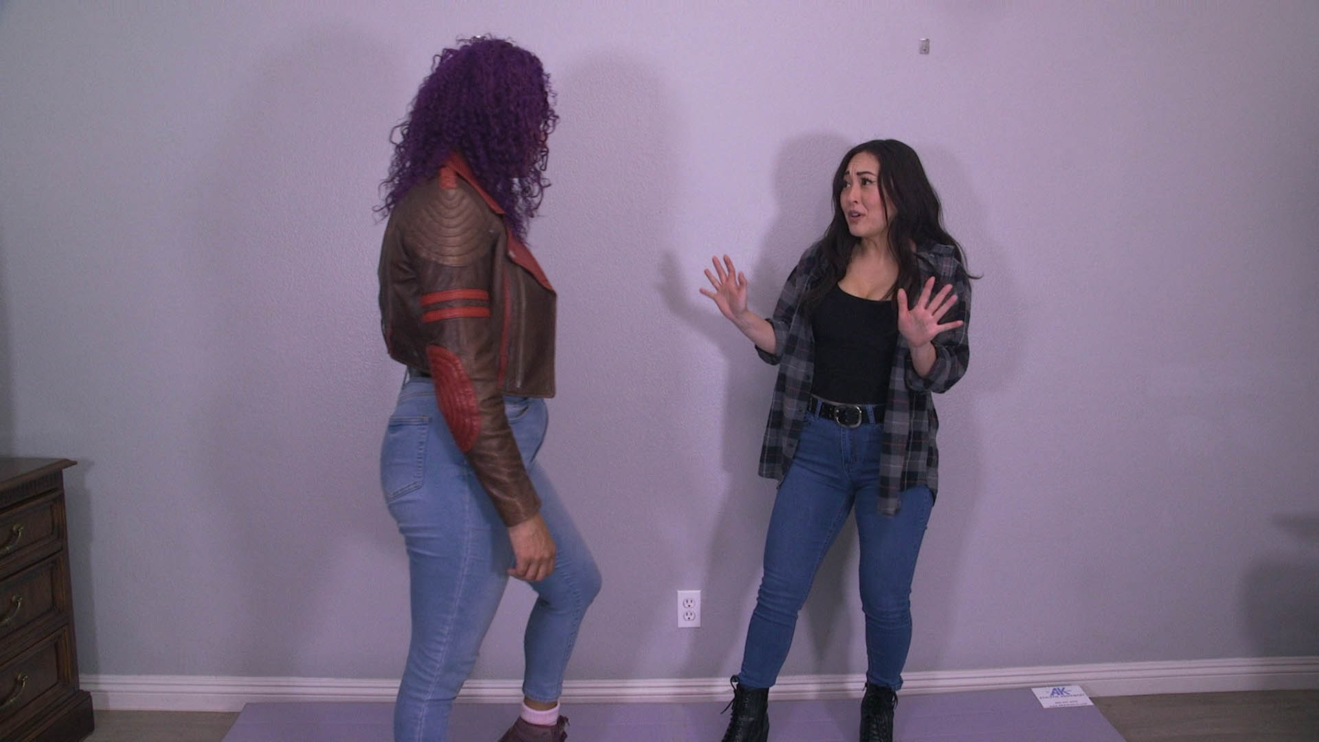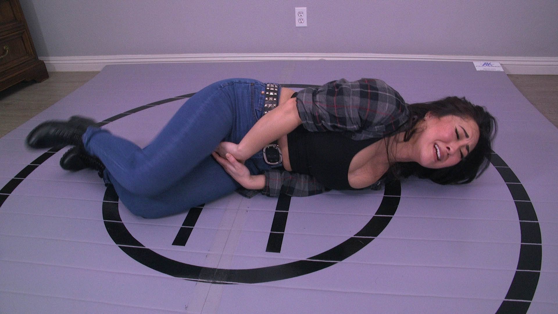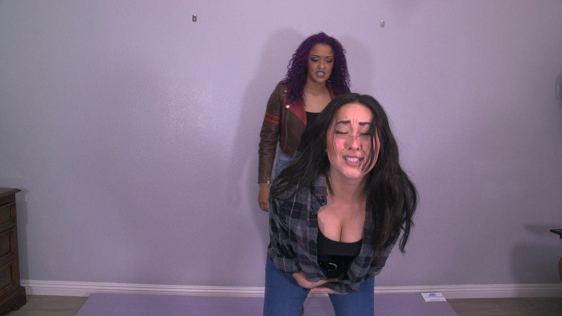 Sumiko Dreams begs Daisy Ducati not to fight, but Daisy kicks her in her pussy. They begin fighting, and Daisy turns Sumiko around, holding her in place by the shoulders. She knees her multiple times in her pussy, making Sumiko moan, groan and beg, until she falls to the floor. Daisy kicks Sumiko’s pussy repeatedly, making her eyes roll back. She helps her up and puts her in a choke hold, bending her over. She kicks her pussy, taunting her, as she gags, groans and moans. She tightens the choke until she passes out. Sumiko wakes up and rubs her pussy in pain.
