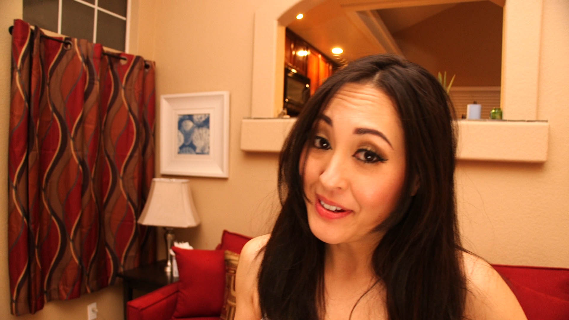 Sumiko sits on the couch, with messy hair after being stuck and getting free. A pile of clothes by her. She talks to the camera about the scene’s process. Camera comes in closer as she continues talking. She plays with her skit. Camera comes closer, but she stops it. She snickers and stands up, then trips and falls into a pile of clothes. Cut to Sumiko underneath a pile on her back, stuck up to stomach, miniskirt riding up to show her panties. Her yells are muffled, and they become desperate and girly. She kicks her feet, and her boots slide off, revealing her bare feet.