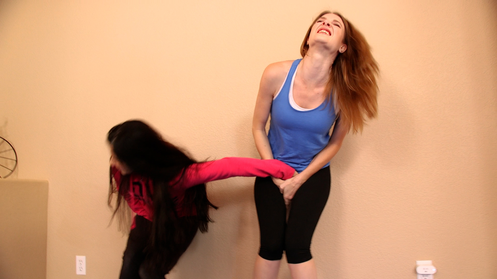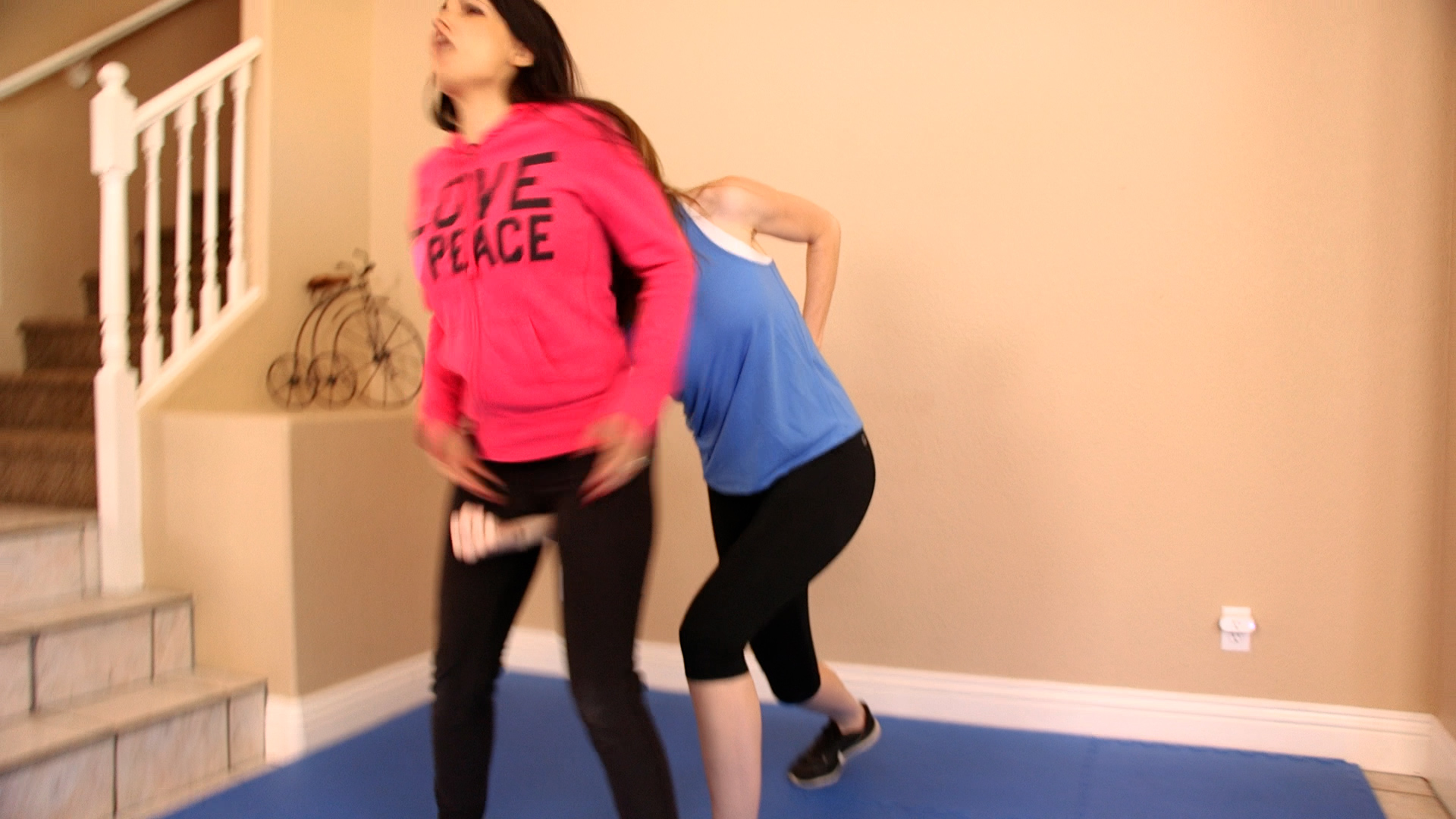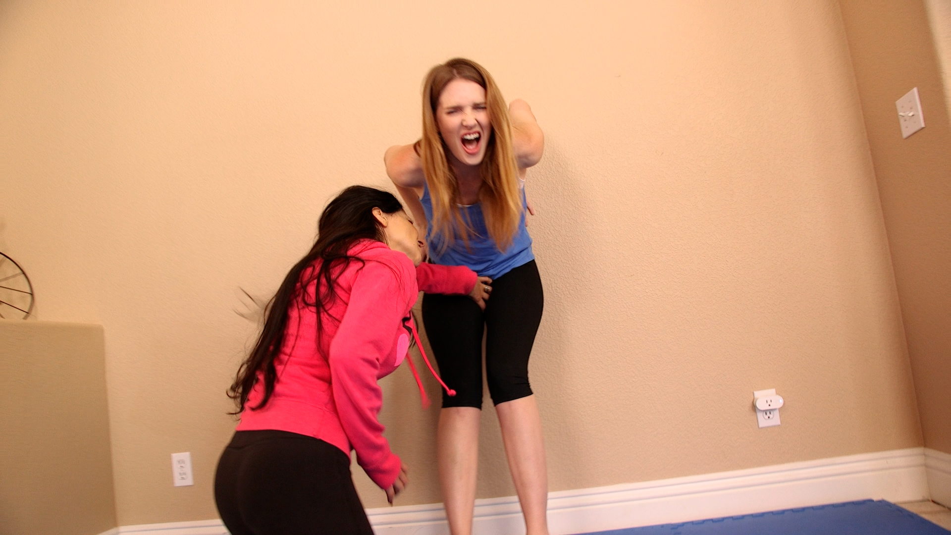 Ashley Lane faces the camera, then Hannah Perez comes from behind and lands a