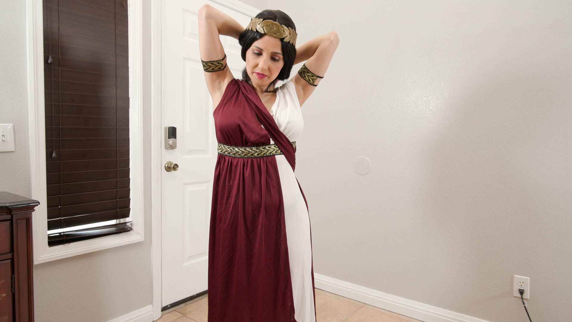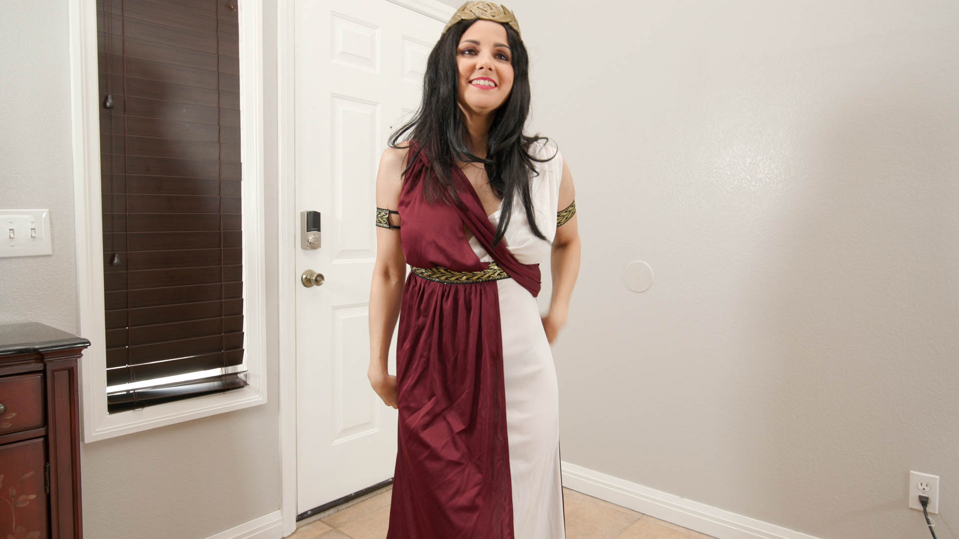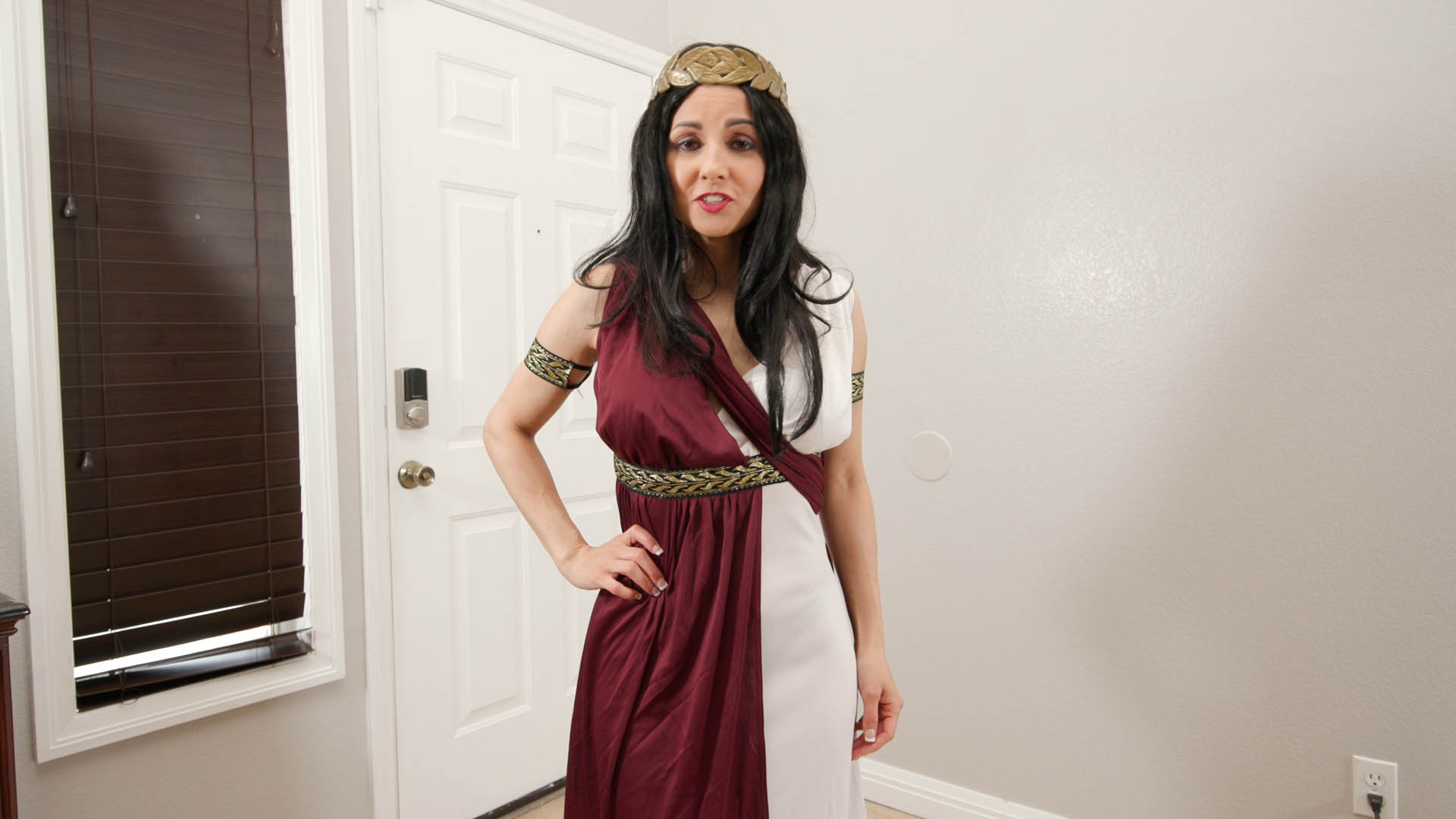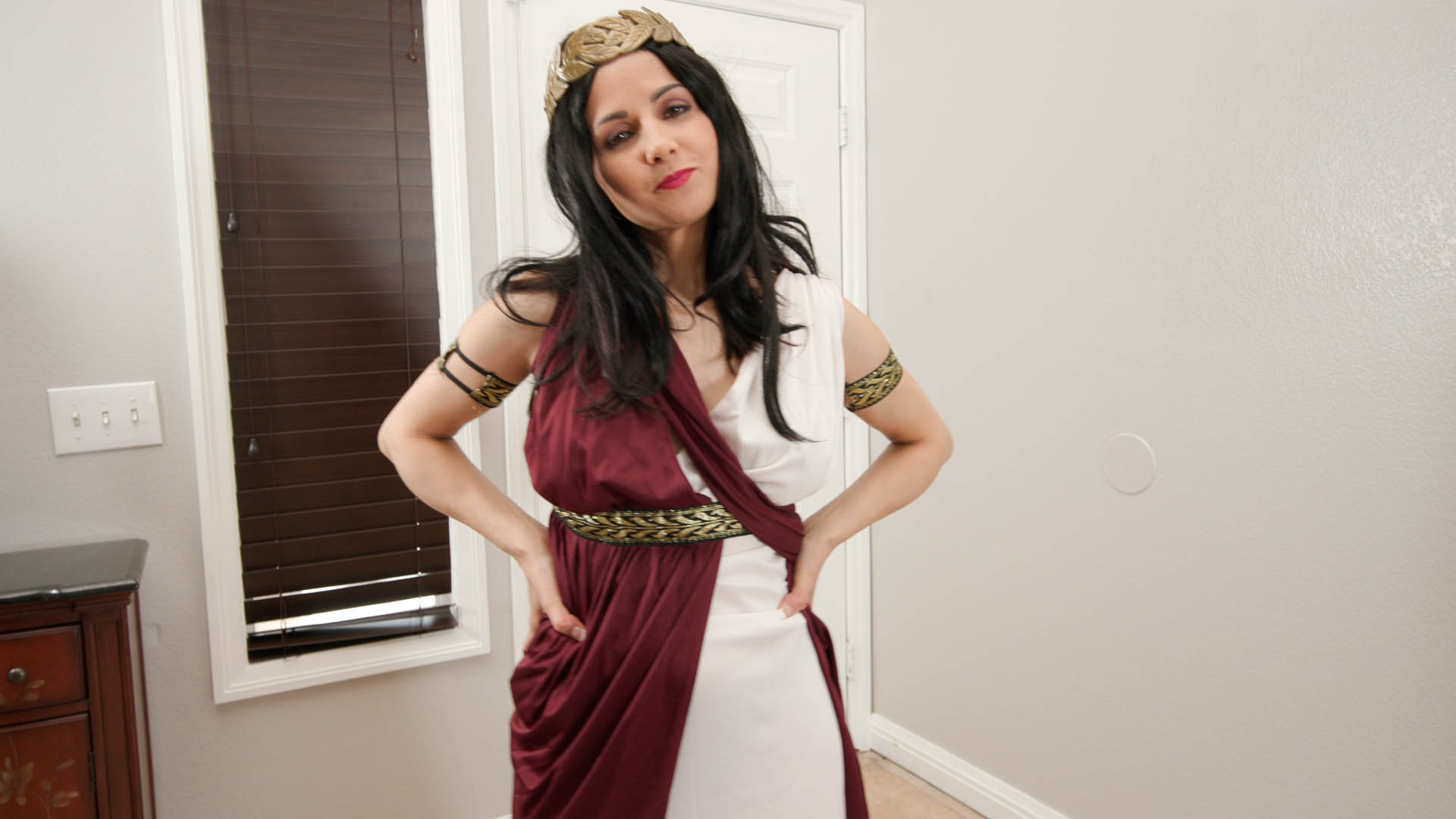 Returning from their dinner, she proposes becoming an “internet girl” and asks one more favor: for him to cum in her mouth. She opens her mouth wide and takes it in. A thunderbolt appears and Hannah changes into the ultimate dream girl, with an even more sensual, deep, commanding voice, wearing toga-like clothing. She gazes and caresses herself all over, powerfully yet gently, then glances at him. She suggests to make him a Sex God, as they head toward the couch.