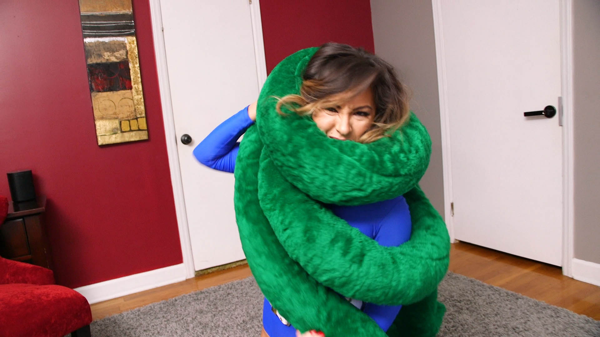 As soon as Lucy lets go of The Snakemaster’s neck, The Snakemaster grabs Lucy by the coils around her neck and sits her down on the chair while still choking her. Still defiant, Lucy Croft does her best to not loose consciousness. Still insisting on the whereabouts of the treasure, The Snakemaster continues to apply pressure to Lucy’s neck with the towel and neck pillow, but is shocked when he notices that Lucy is starting to get back to her feet. Once she does, she turns around and nails The Snakemaster in the chin with an uppercut, causing The Snakemaster to lose his grip and stumble across the room. Lucy starts to unwrap the towel and neck pillow from around her neck, as she tries to catch her breath. Meanwhile The Snakemaster starts to shake off the affects of Lucy’s uppercut. The Snakemaster then proceeds to pick up his snake. Lucy sees The Snakemaster holding the snake as he blocks her path from escaping. She tries to run around him but ends up running into the snakes coils as The Snakemaster wraps his boa around Lucy’s neck. Lucy gasps for air as The Snakemaster continues to punch and kick her all over the room. Lucy tries to break free and run away, but The Snakemaster just keeps wrapping more coils around her neck, until he lets go and watches as the snake tightens it’s coils around her neck, slowly forcing her to her knees. The Snakemaster pulls up the chair and sits next to Lucy who’s on the floor slowly getting choked. She moans continuously in her weakened state, as the snake slowly begins to crush her neck.