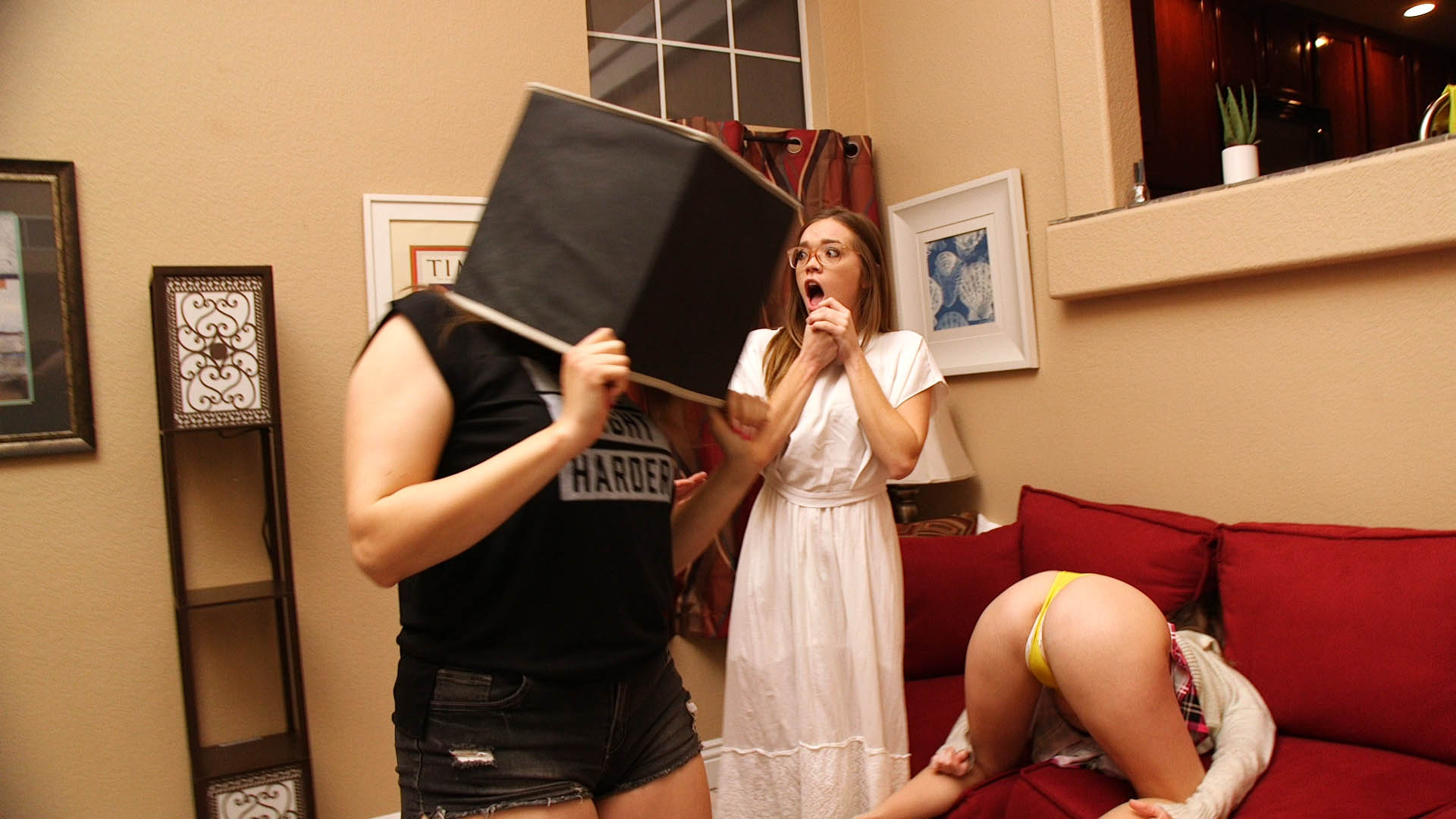 Cadence Lux is on the couch, with her head stuck between cushions, with POV watching. Cadence muffles, struggling furiously. Hannah Perez enters with new recruits Katie Kush and Valentina Bellucci. They stand in front of the couch and they talk about the job. She makes each grab one of Cadence’s ankles and tickle her. Cadence goes mad laughing uncontrollably. Hannah introduces POV to Katie and Valentina saying he’ll be leading the training session. Hannah tells Katie and Valentina to take POV down. Valentina lunges at him, but POV sidesteps and makes Valentina trip. She’s sent towards a shelf, and a bucket falls down on her head off screen. She comes back stumbling around, with her voice muffled, walking around like a zombie. Katie grabs POV, puts him up to her face, as Hannah smiles. POV slips out of Katie’s grasp, jumps down to her ankles and grabs the hem of her skirt. The screen cuts to black and Katie’s skirt is tied over her head. Katie stumbles around, muffling in distress. POV goes over to Valentina, pulls down her shorts, which makes her trips over, colliding with Katie. They both fall to the floor in front of the couch. Hannah stands over them, as they wiggles on the floor, muffling. She has an idea. Cut to the couch with Cadence stuck, and Valentina and Katie on top, tied together back-to-back. Cadence wildly tries to get them off, kicking them. Hannah holds POV and congratulates him, as they enjoy the sight of the three girls stuck and struggling.