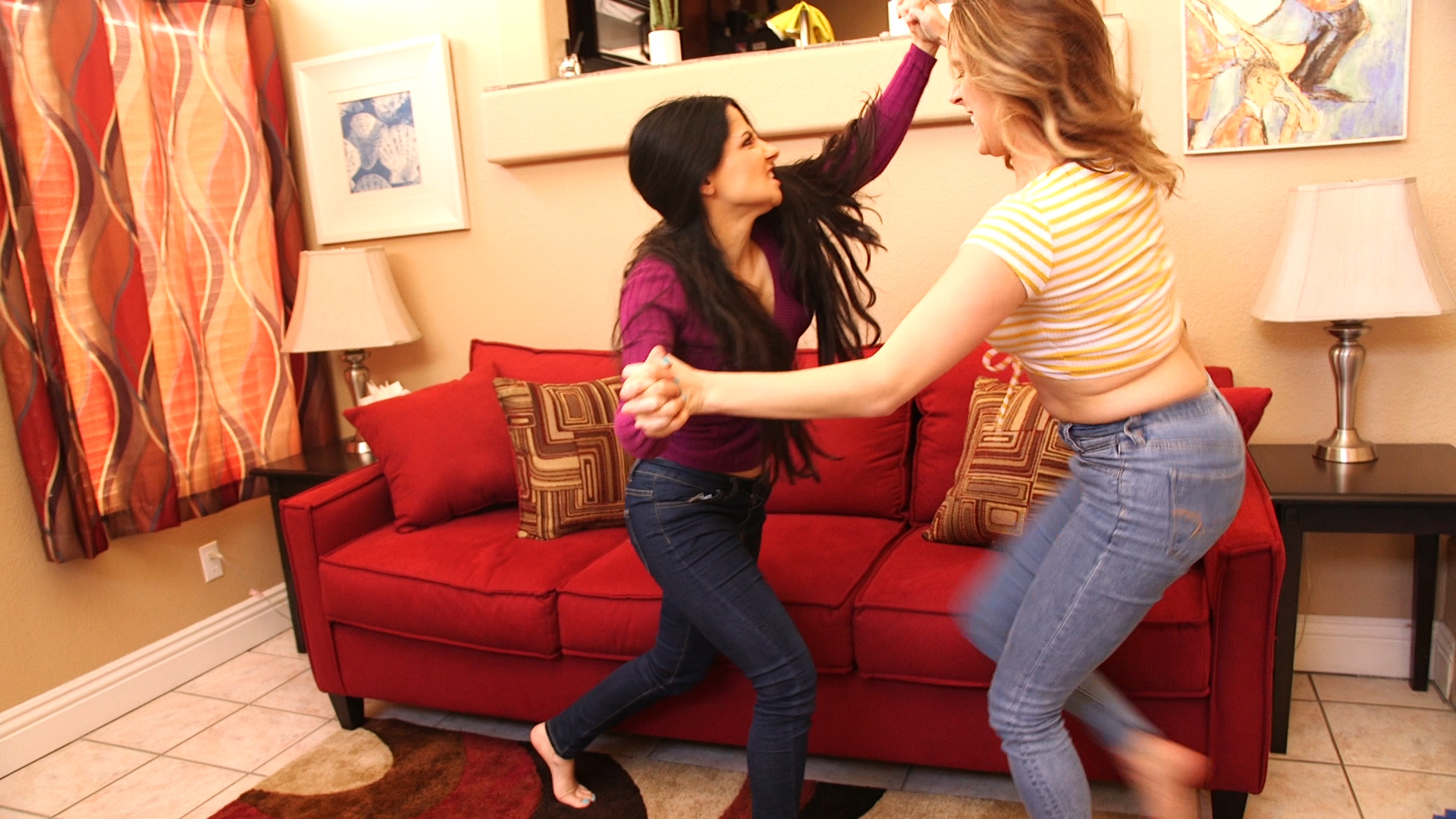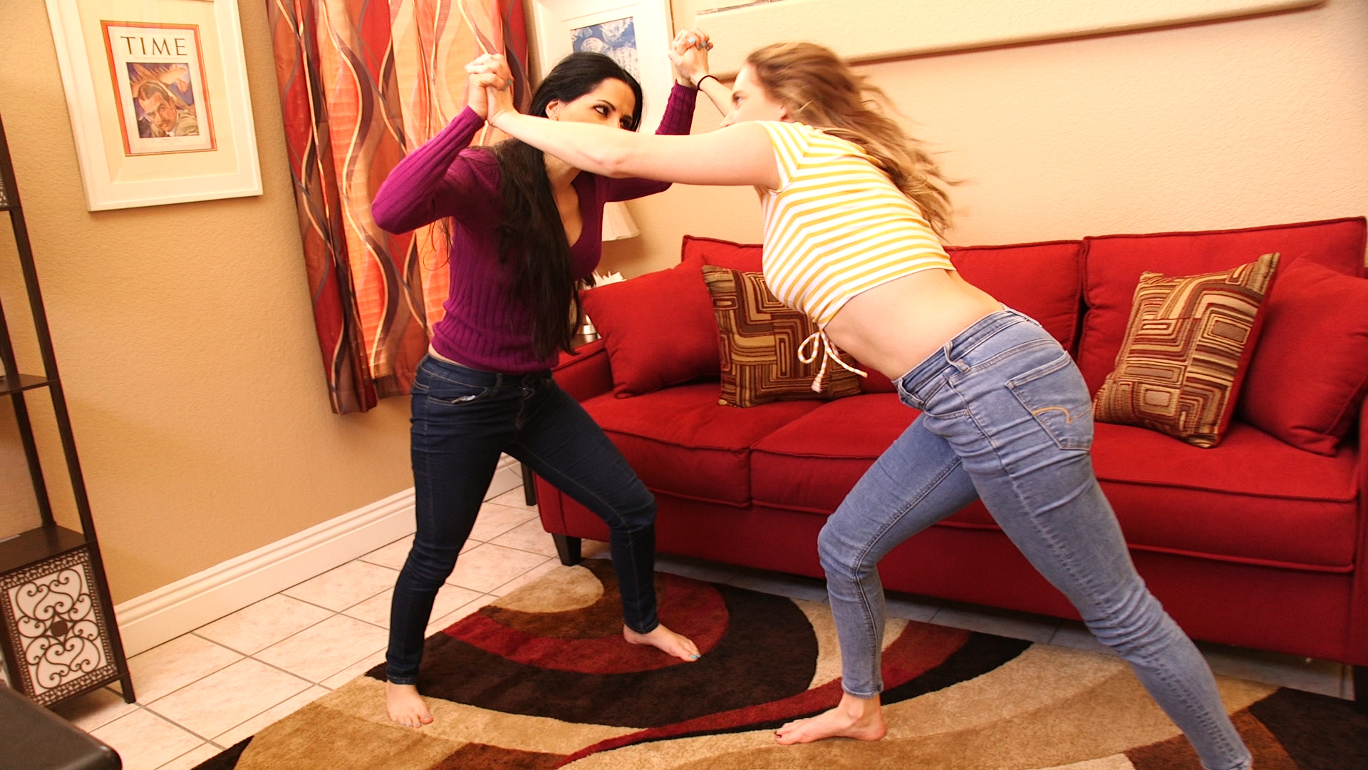 Cadence Lux and Hannah Perez are bounty hunters after the same target. They do back and forth, stare down, and begin a fight with a violent scuffle over a gn, which goes back and forth until the gn is disarmed. Immediately they go into hair pulling, biting, tit mauling, head banging, face palming, finger locked test of strength. At points the fight gets sensual, with them almost kissing. The latter half of the fight is leg locked rolling around with hairpulling, long points of just staring at each other while trying to roll, chokes, chokeholds, strangles. The fight ends with them kissing while standing. Cadence picks Hannap up while they kiss deeply and Hannah chokes her. Cadence fights to escape, but Hannah is victorious.